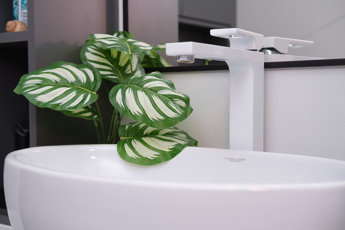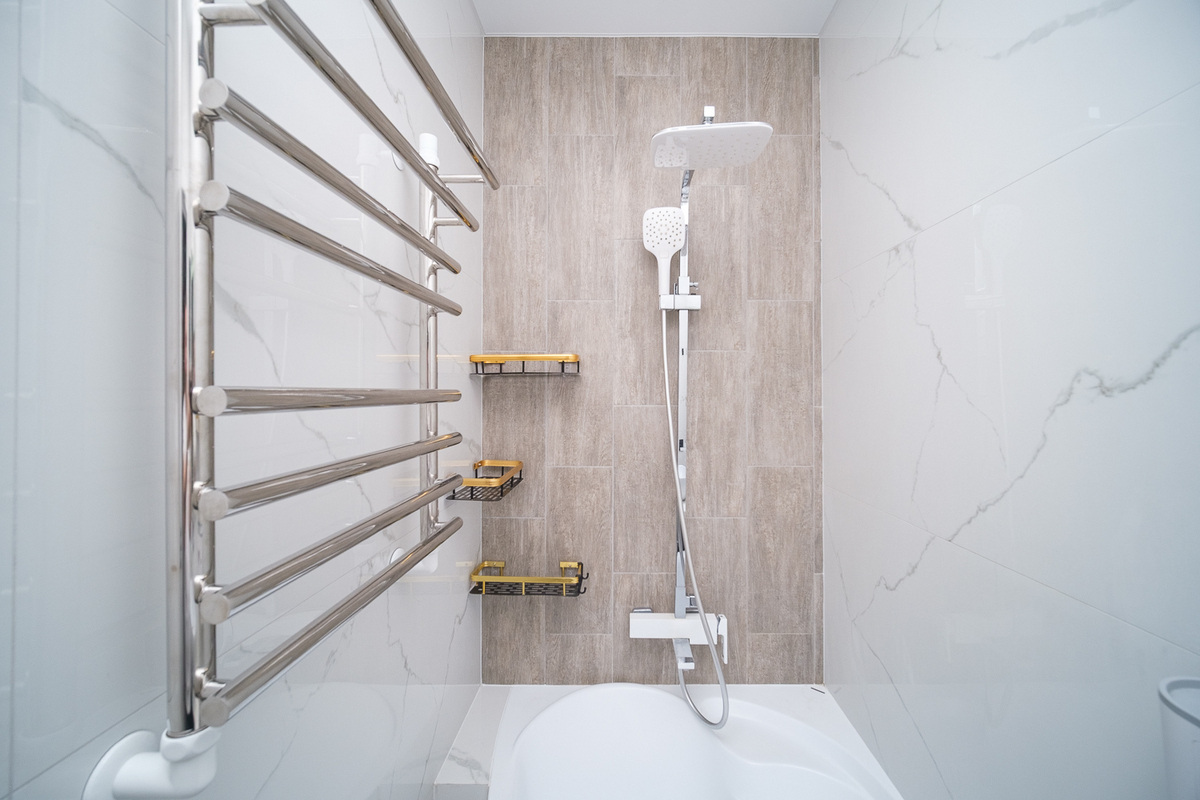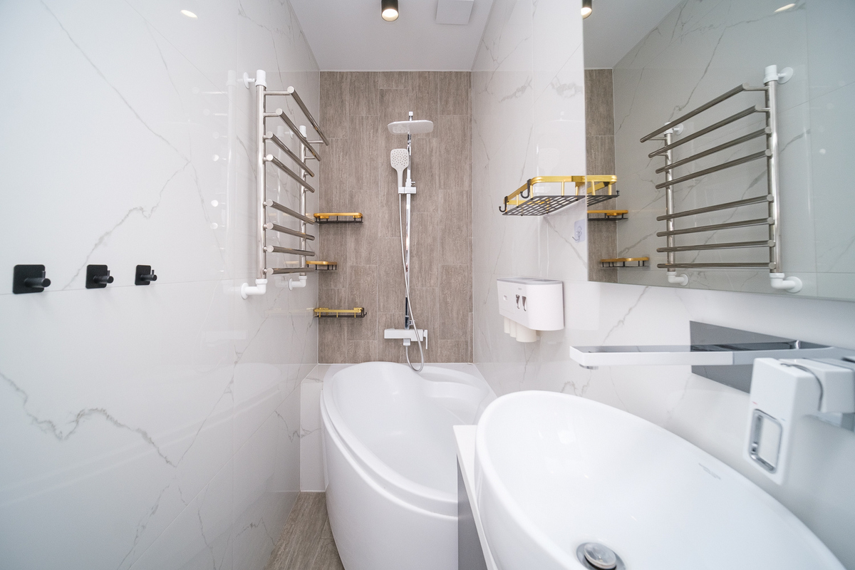 В ванной – плитка, удобная ванна и функциональные шкафчики для хранения.