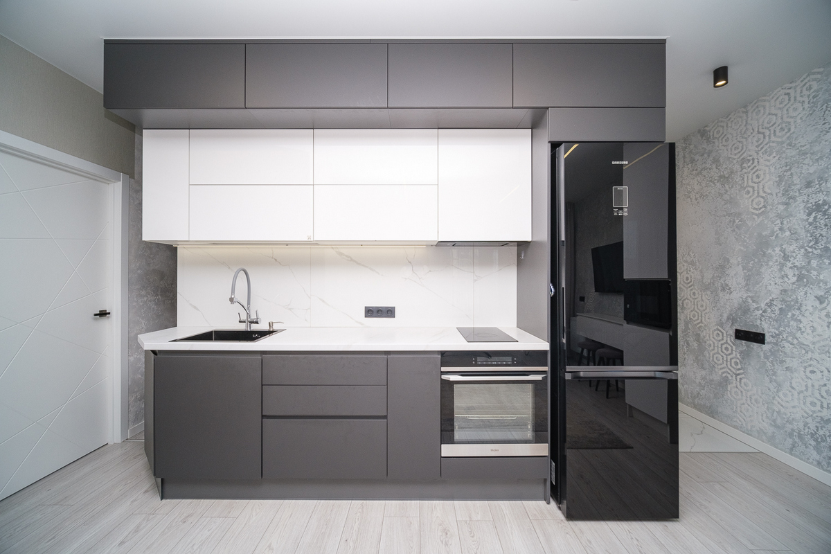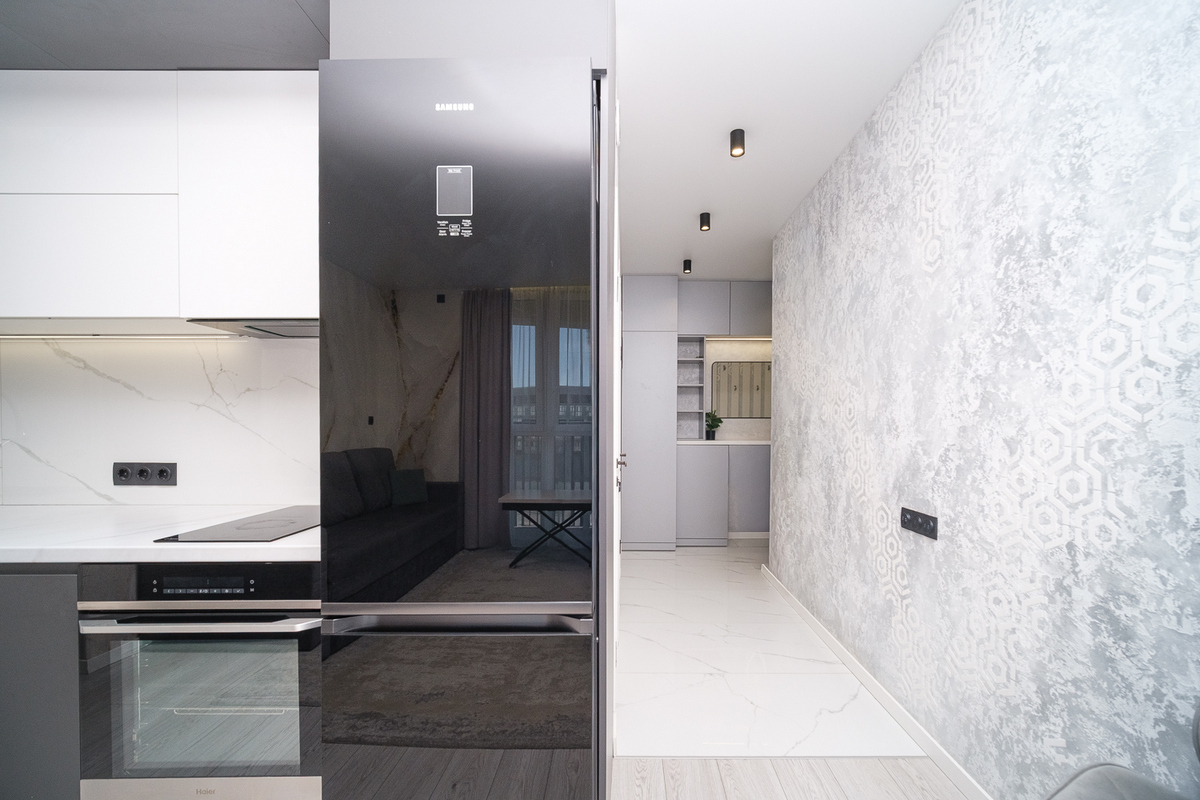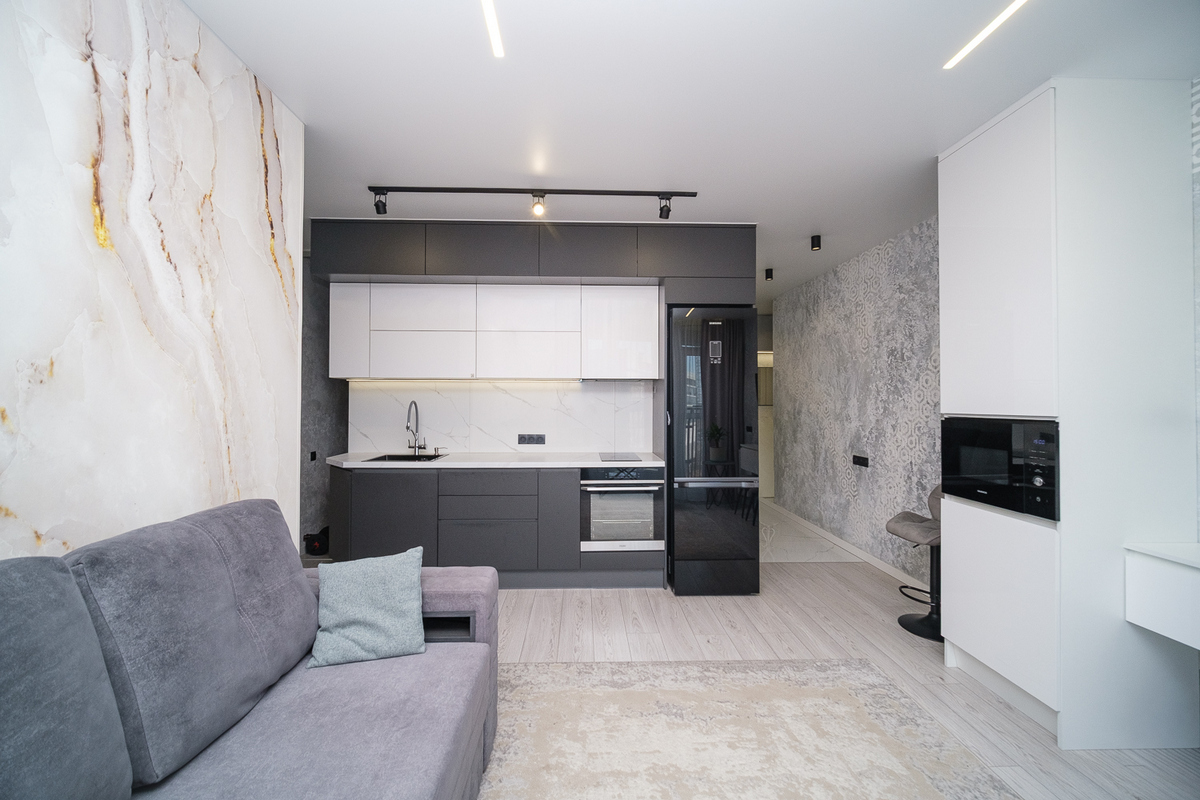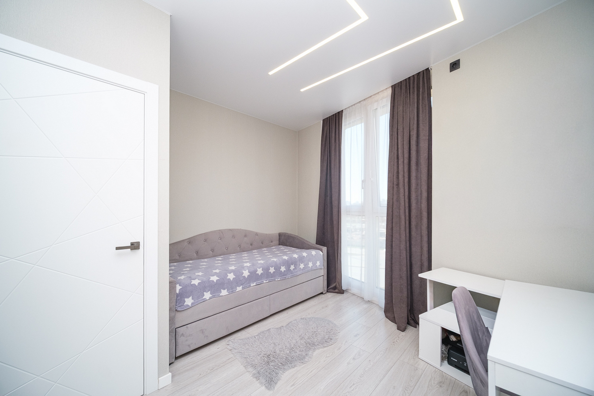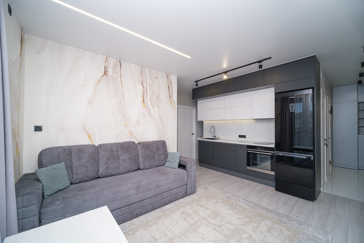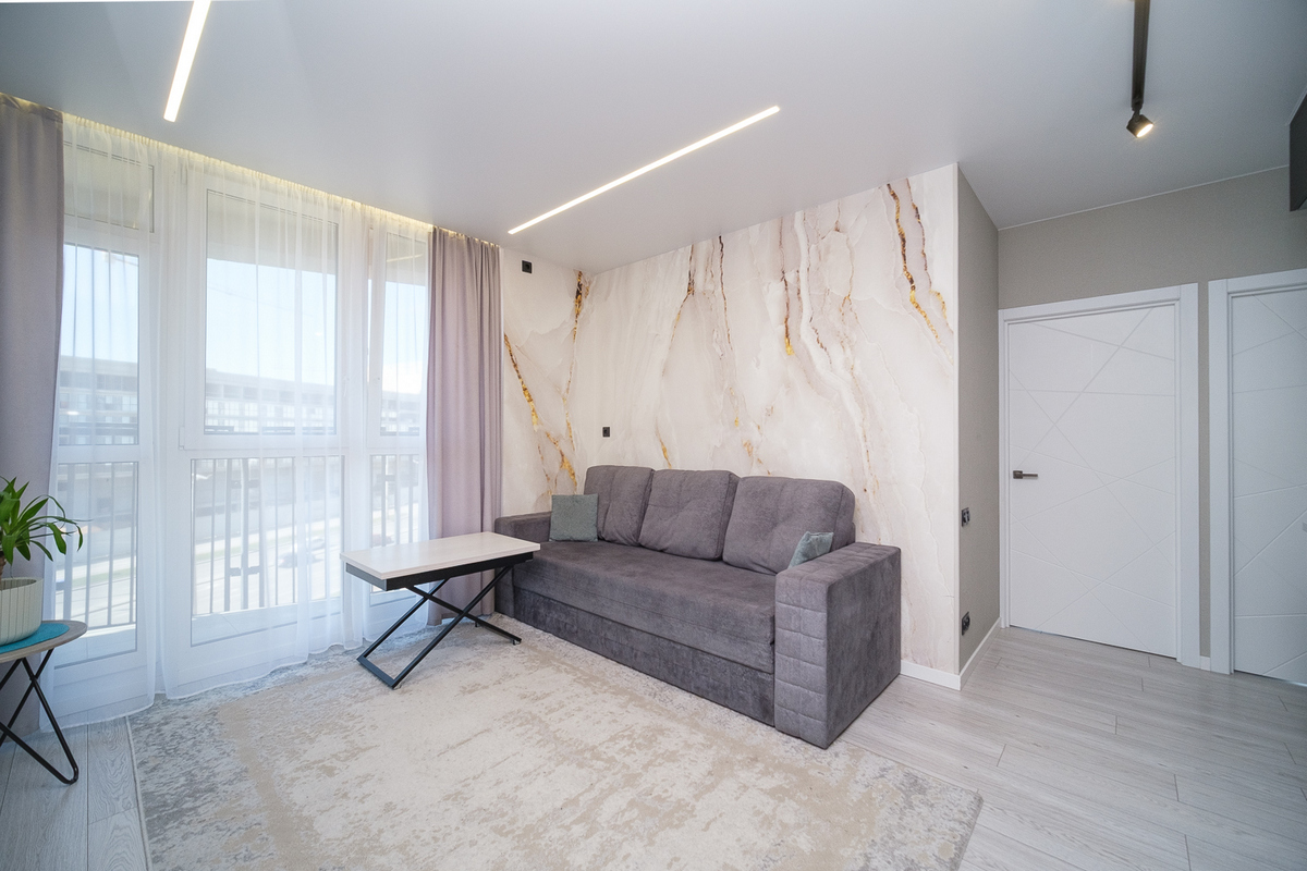 Натяжные потолки с треками и световыми линиями по всей квартире создают современное освещение и визуально расширяют пространство.