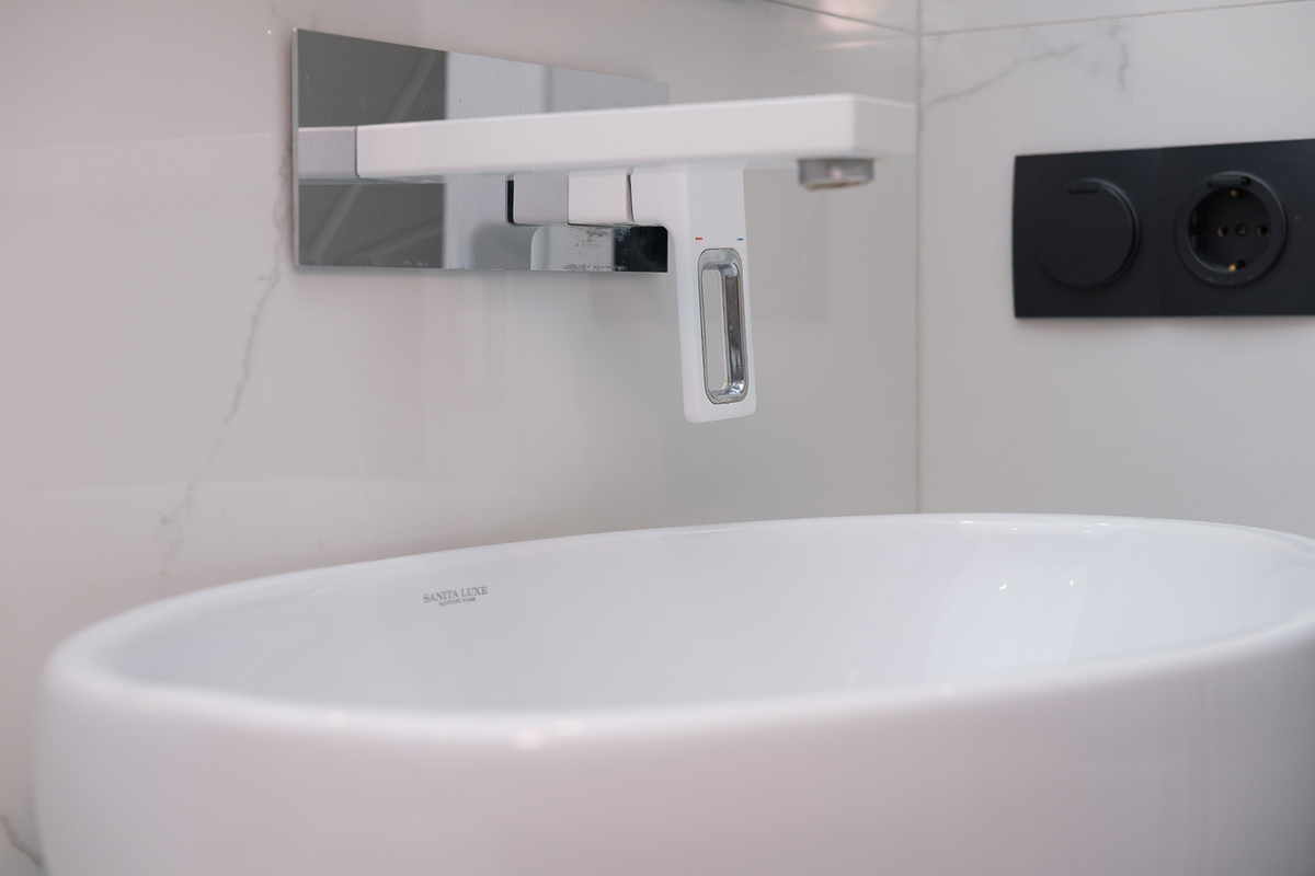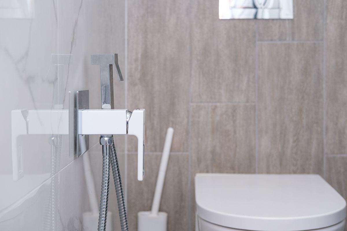 В туалете – плитка на стенах и полу, инсталляция и псевдобиде.