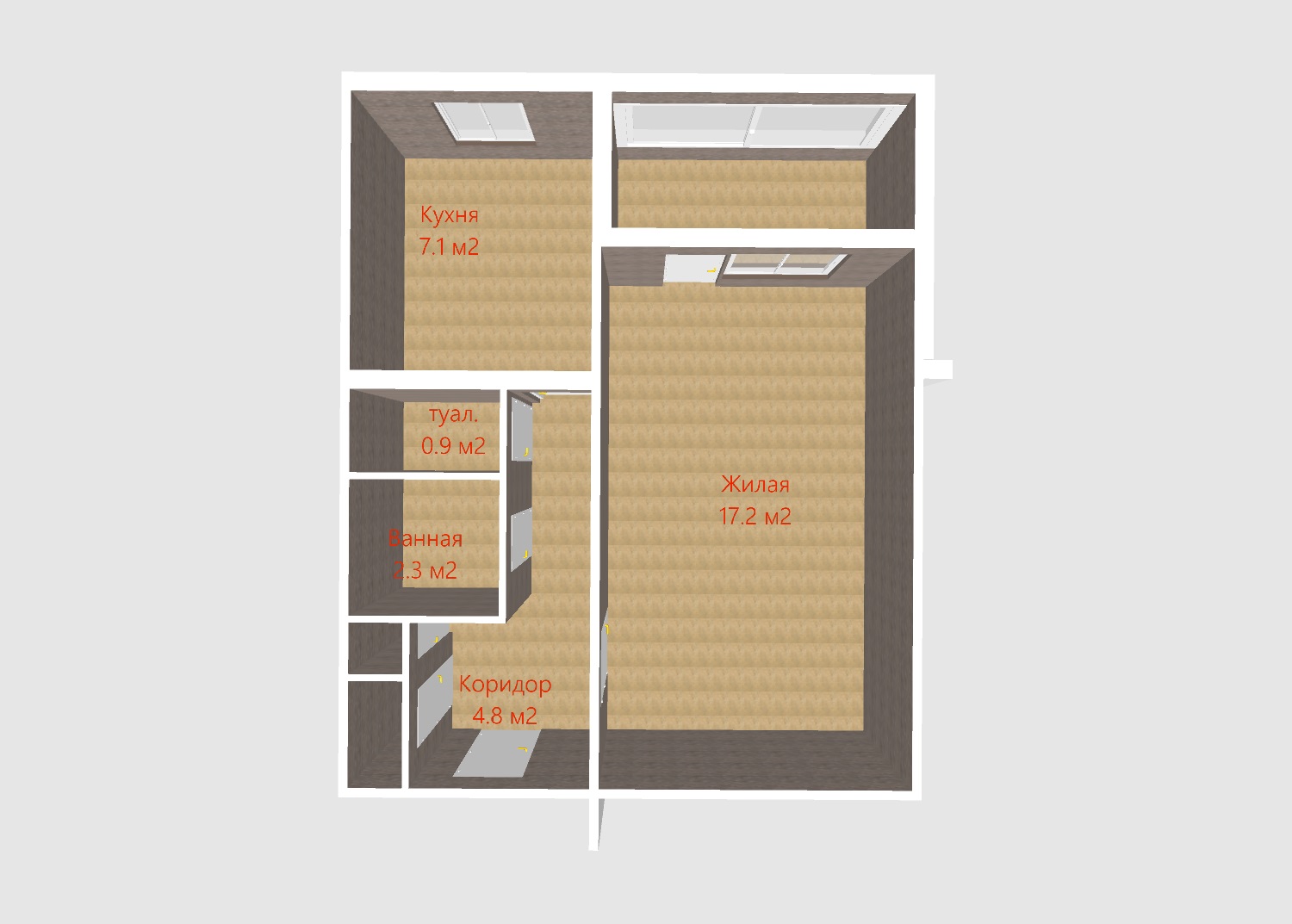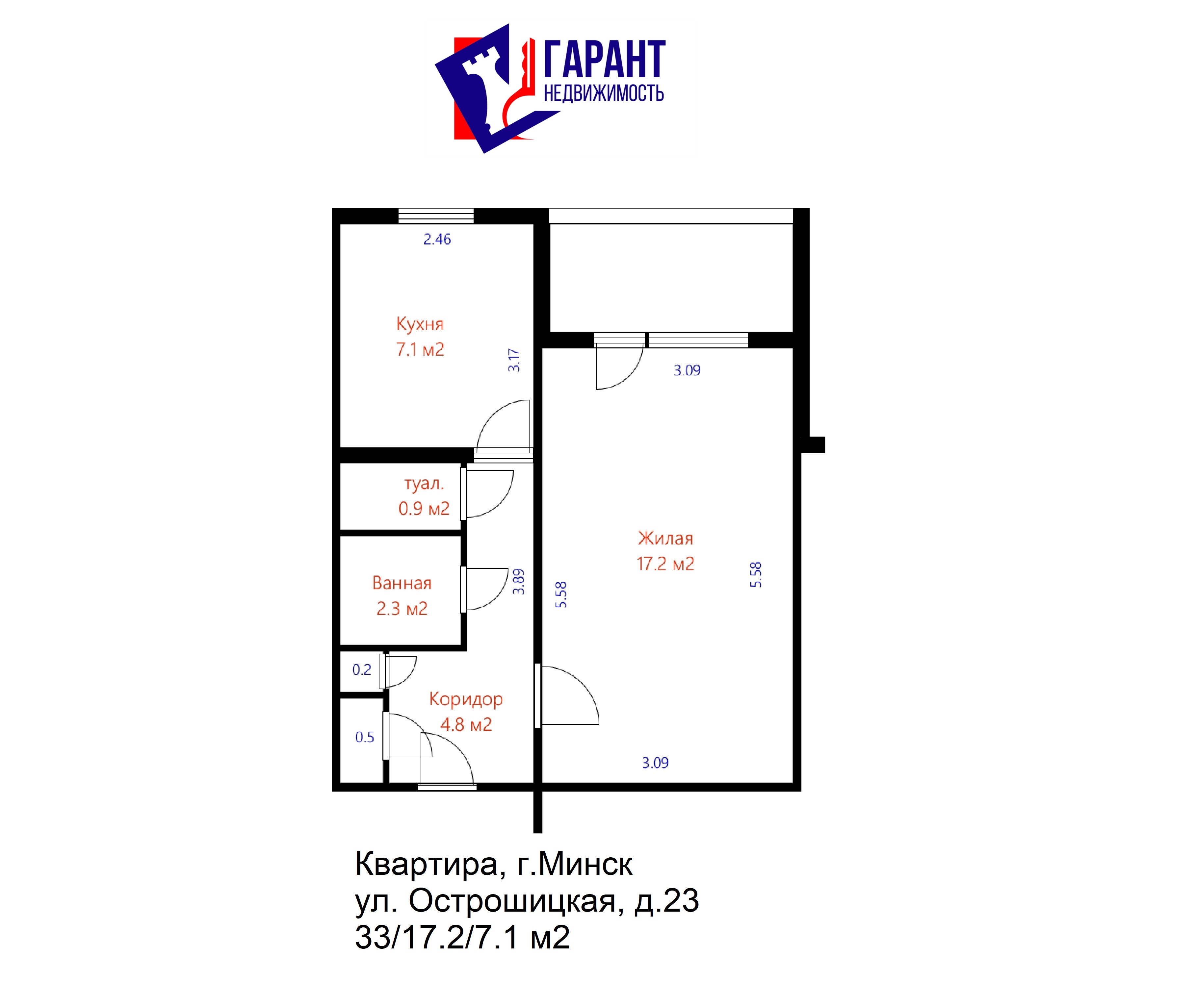 Общая площадь: 33. Жилая площадь комнаты : 17.2. Площадь кухни: 7.1. Высота потолка: 2.54.