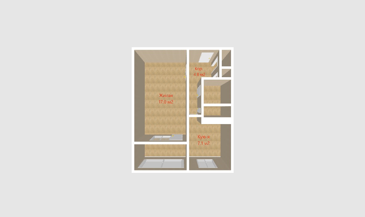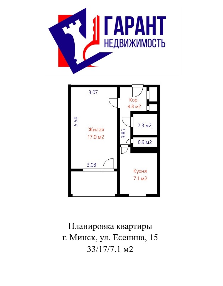 Общая площадь: 33. Жилая площадь комнаты : 17.1. Площадь кухни: 7.1. Высота потолка: 2.54.