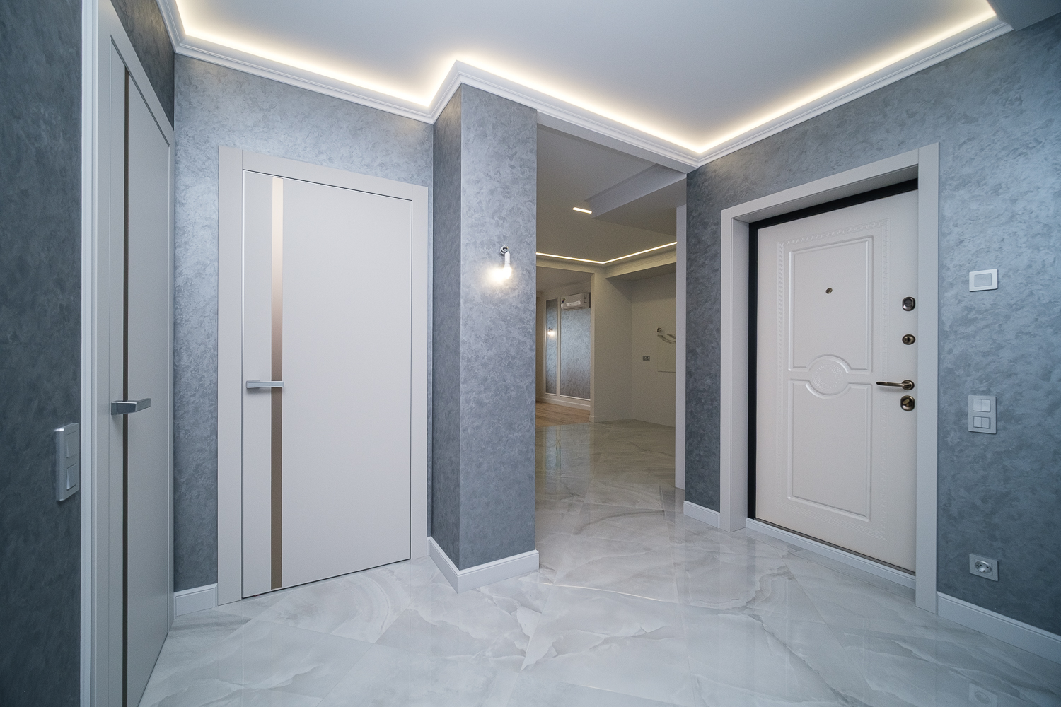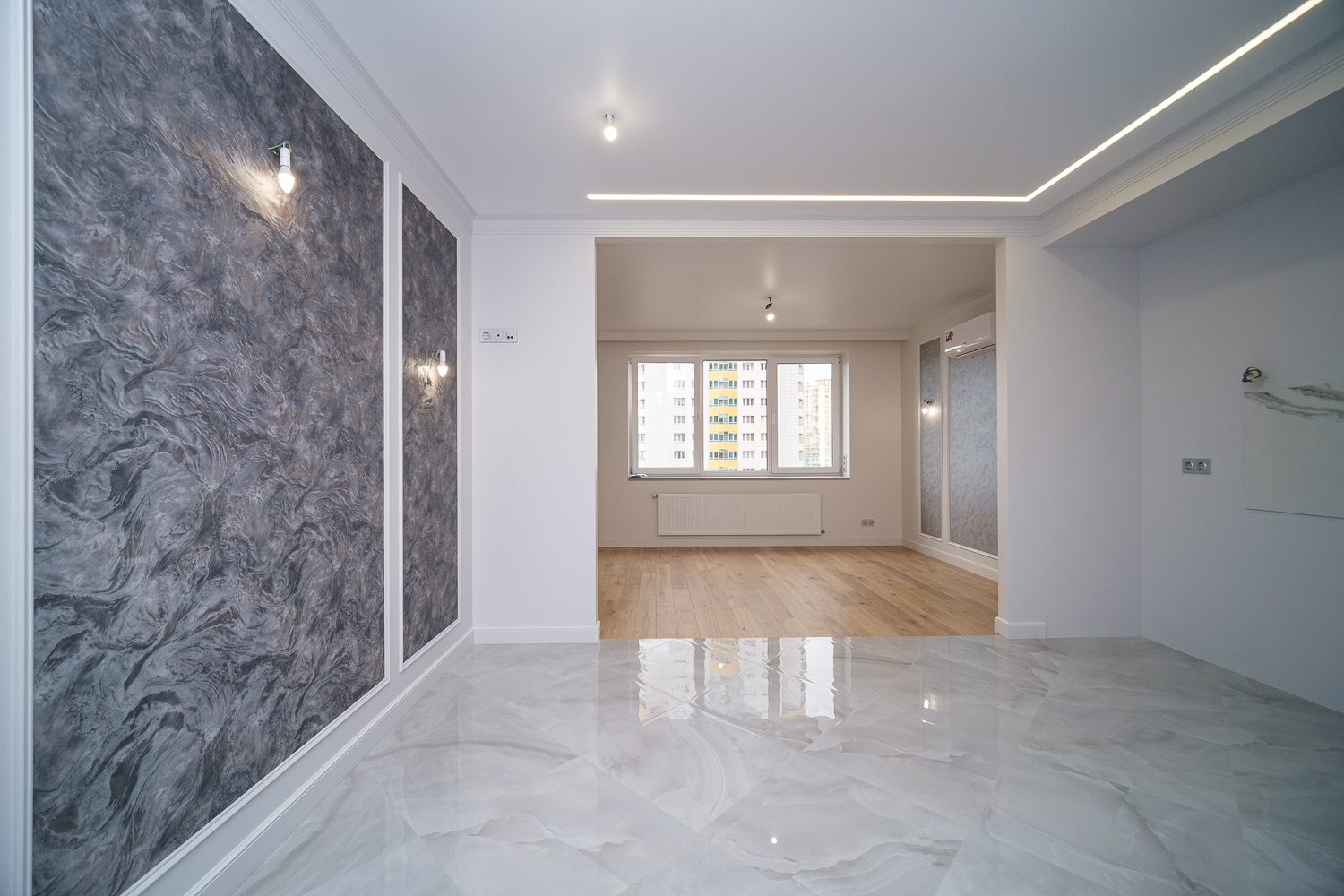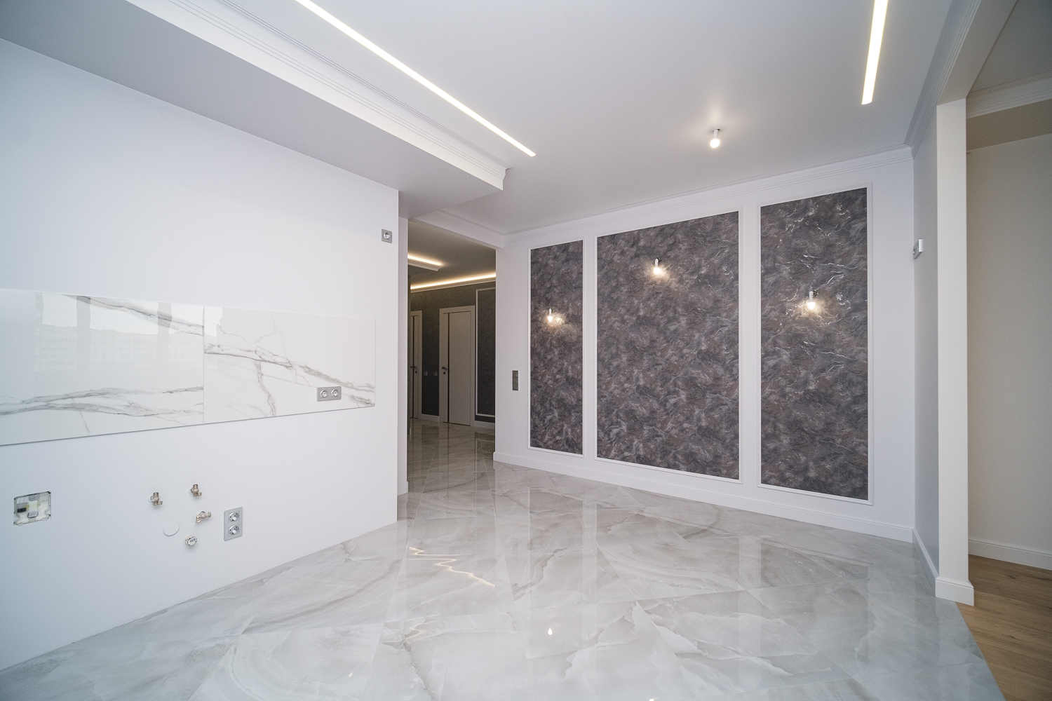Потолки: натяжные, гипсокартонные, багеты – продуманное многоуровневое освещение.