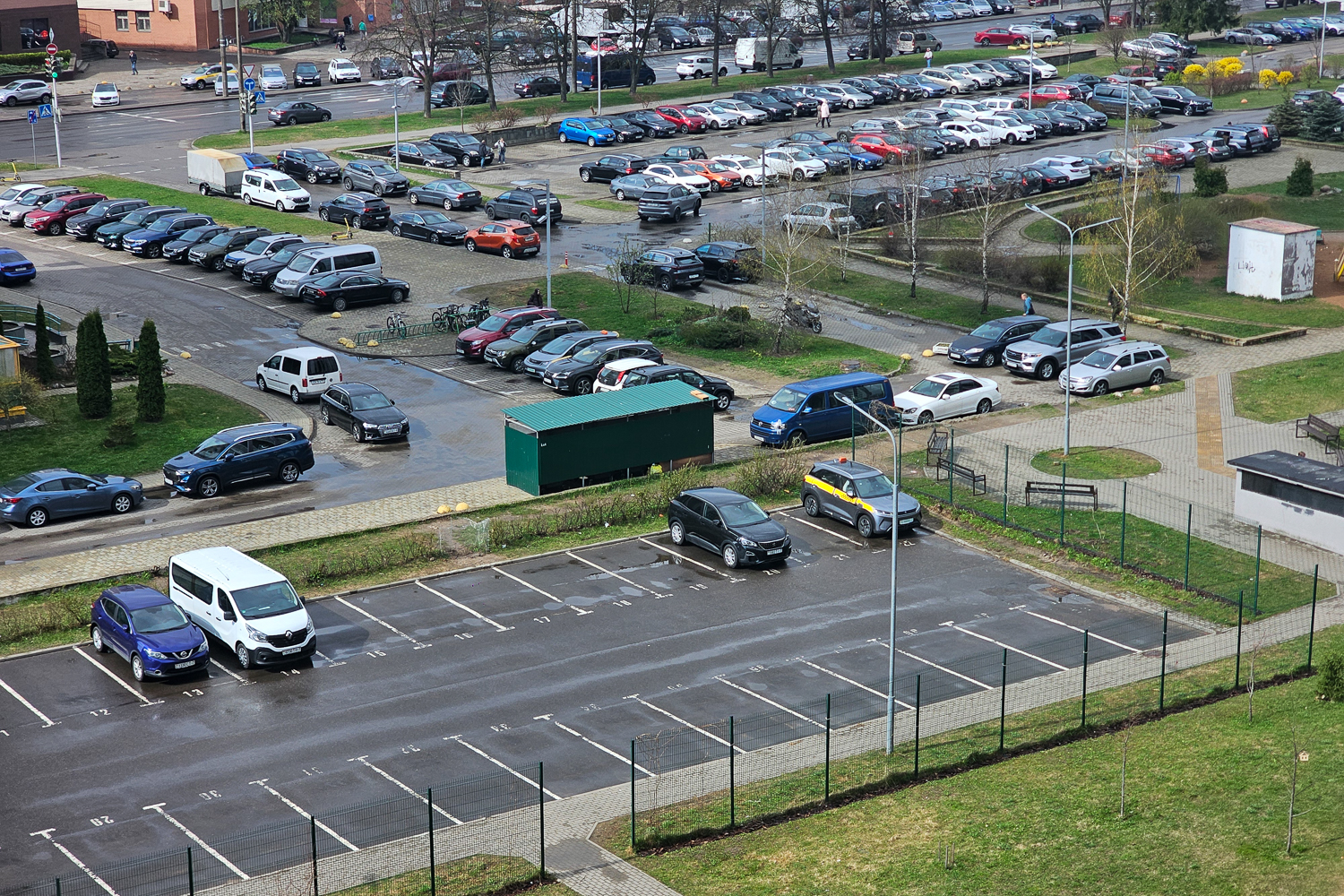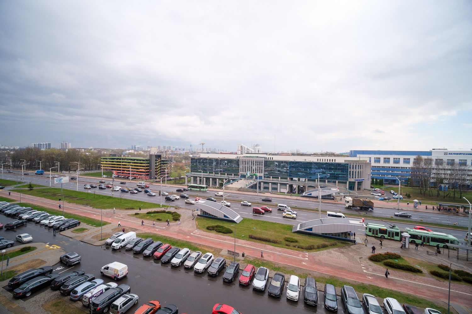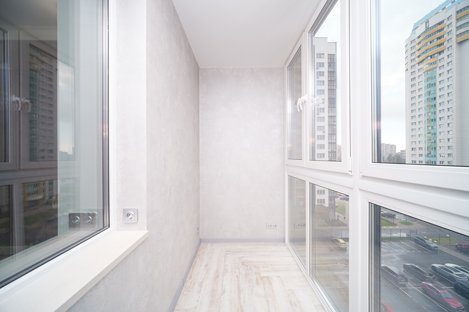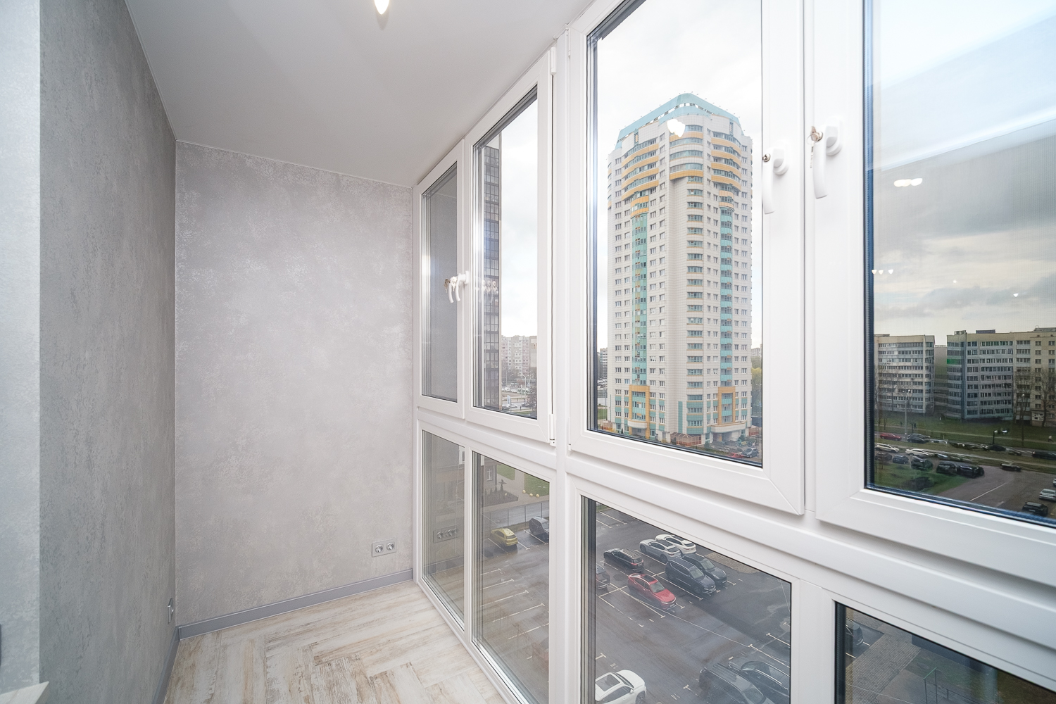 · Виды из окон: панорамный вид с одной стороны на проспект Дзержинского, с другой — на зелёный двор с детской площадкой и парковкой.