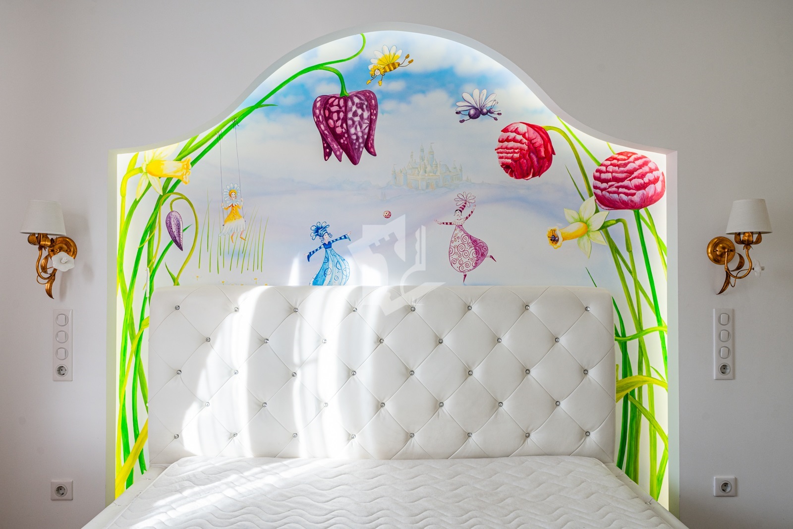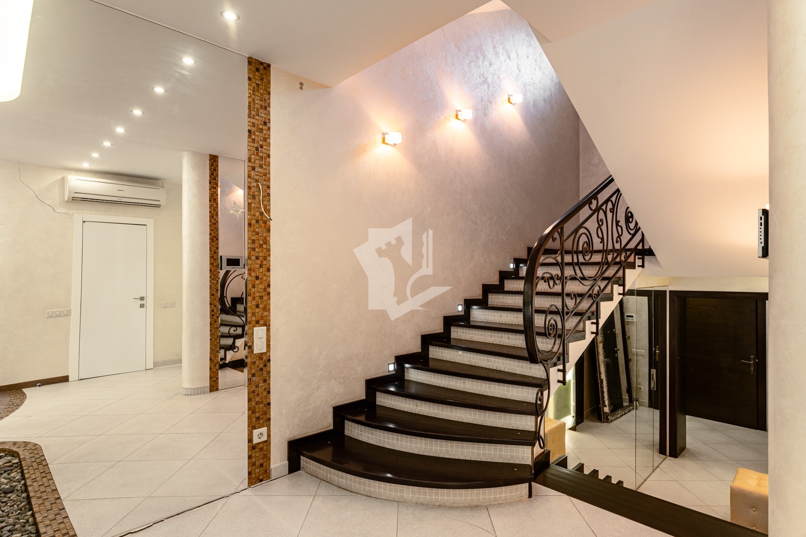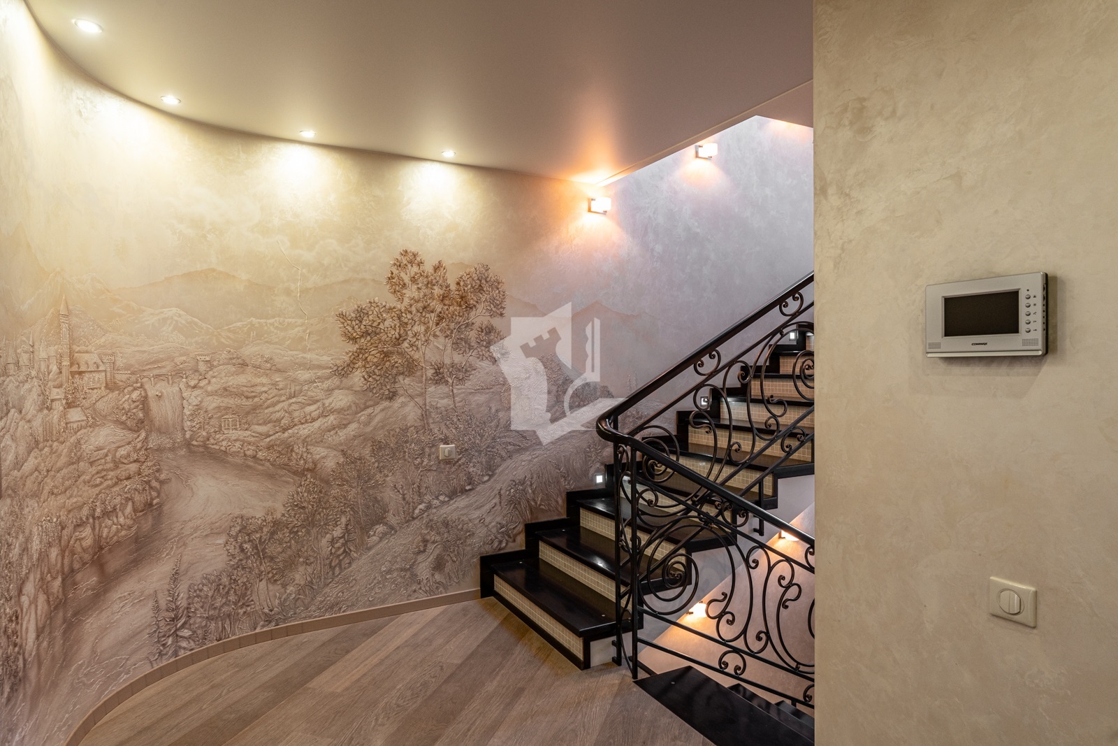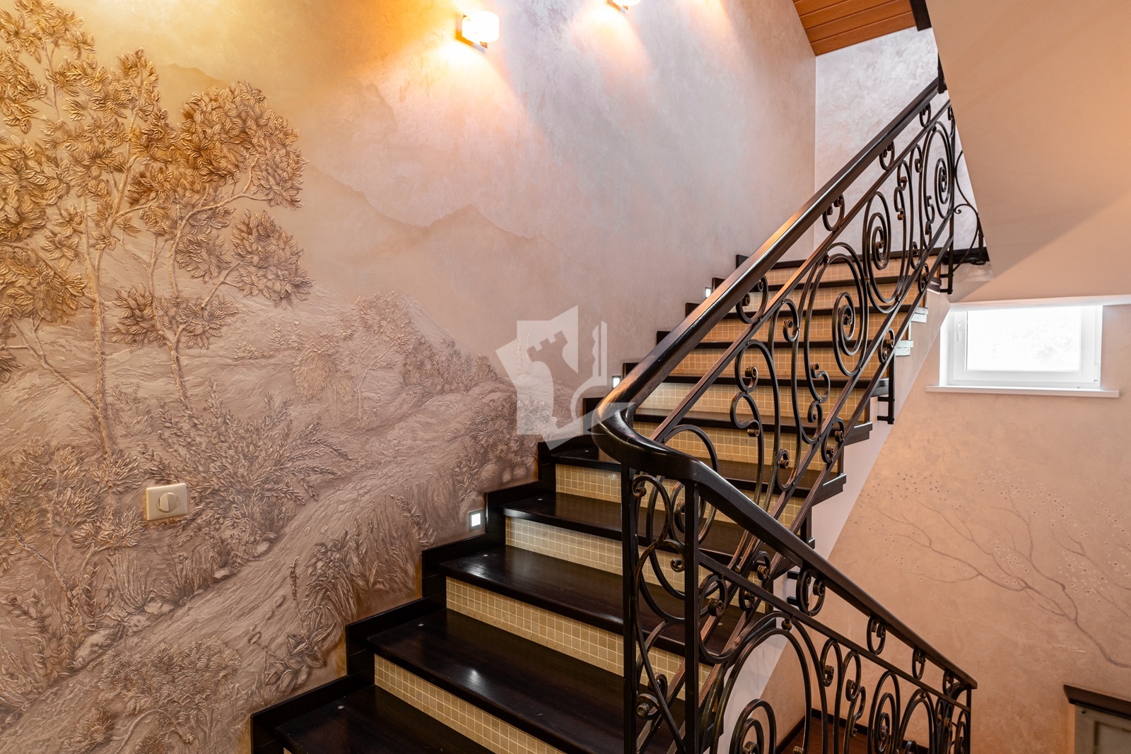 Между этажами установлены лестницы с мягким деревянным покрытием и с коваными перилами. На стены нанесена декоративная штукатурка с высокодетализированной росписью.