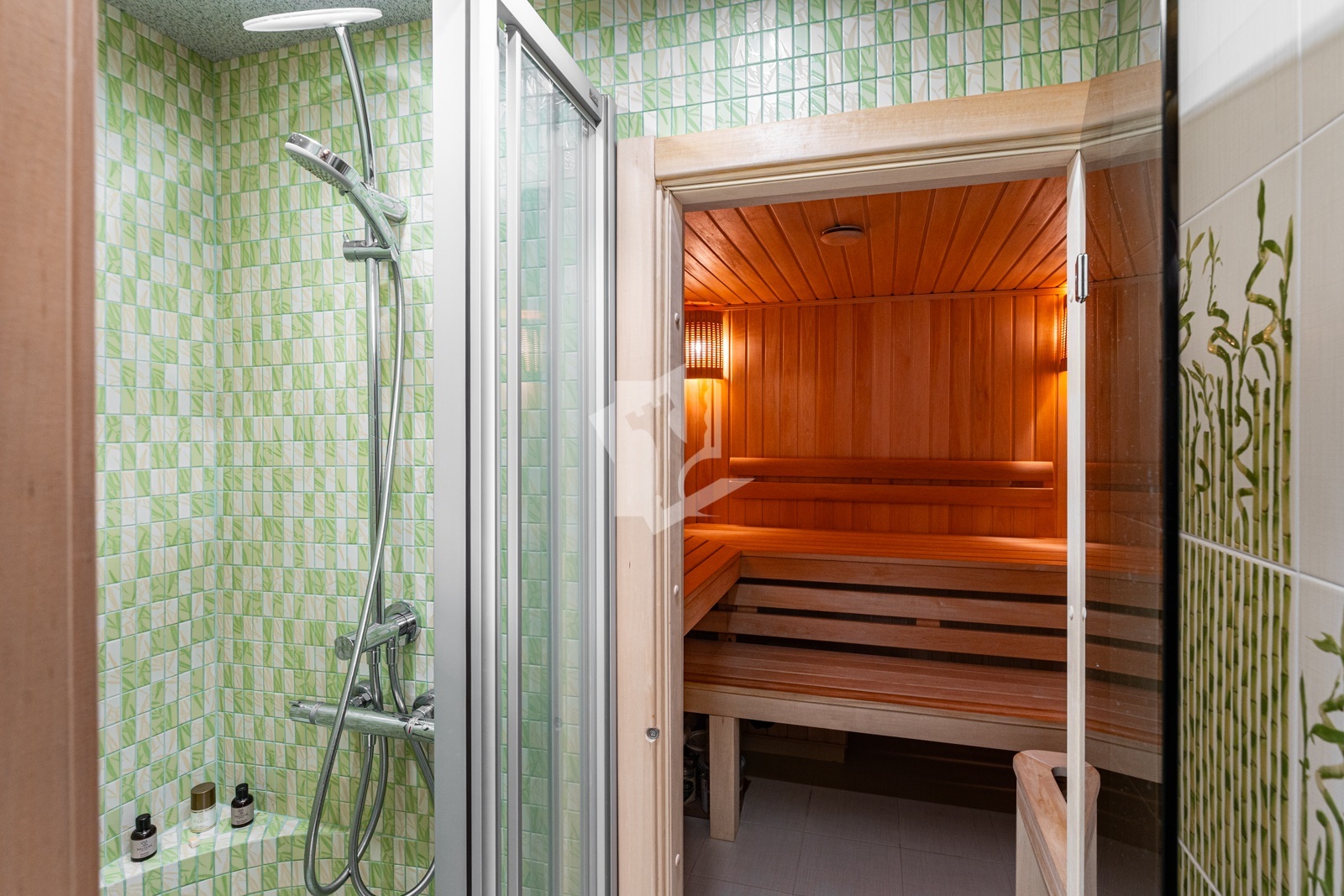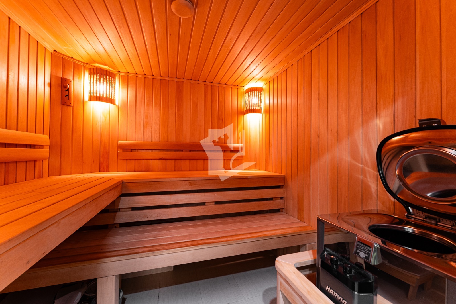 - липовая сауна с высокотехнологической печкой Harvia с пультом управления, которая может работать как в режиме сухой финской сауны, так и в качестве влажной русской бани