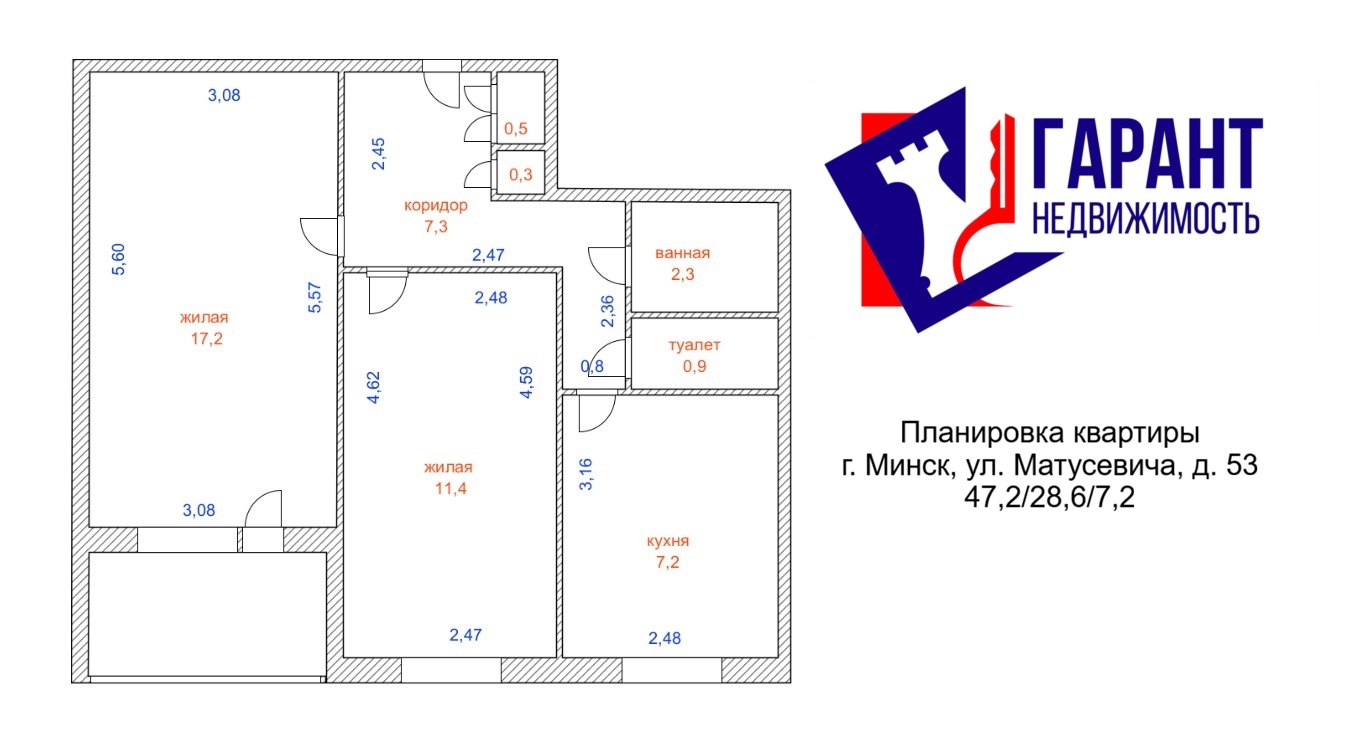 Продуманная грамотная планировка. Жилые комнаты правильной формы 17,2 м2 и 11.4 м2 , коридор 7,3 м2, светлая кухня 7,2 м2, раздельный санузел;