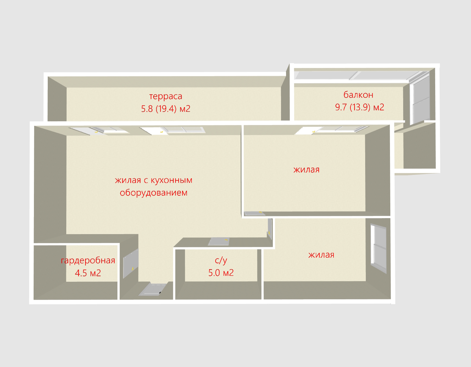 На полу крупноформатная плитка, в жилых комнатах паркетная доска.