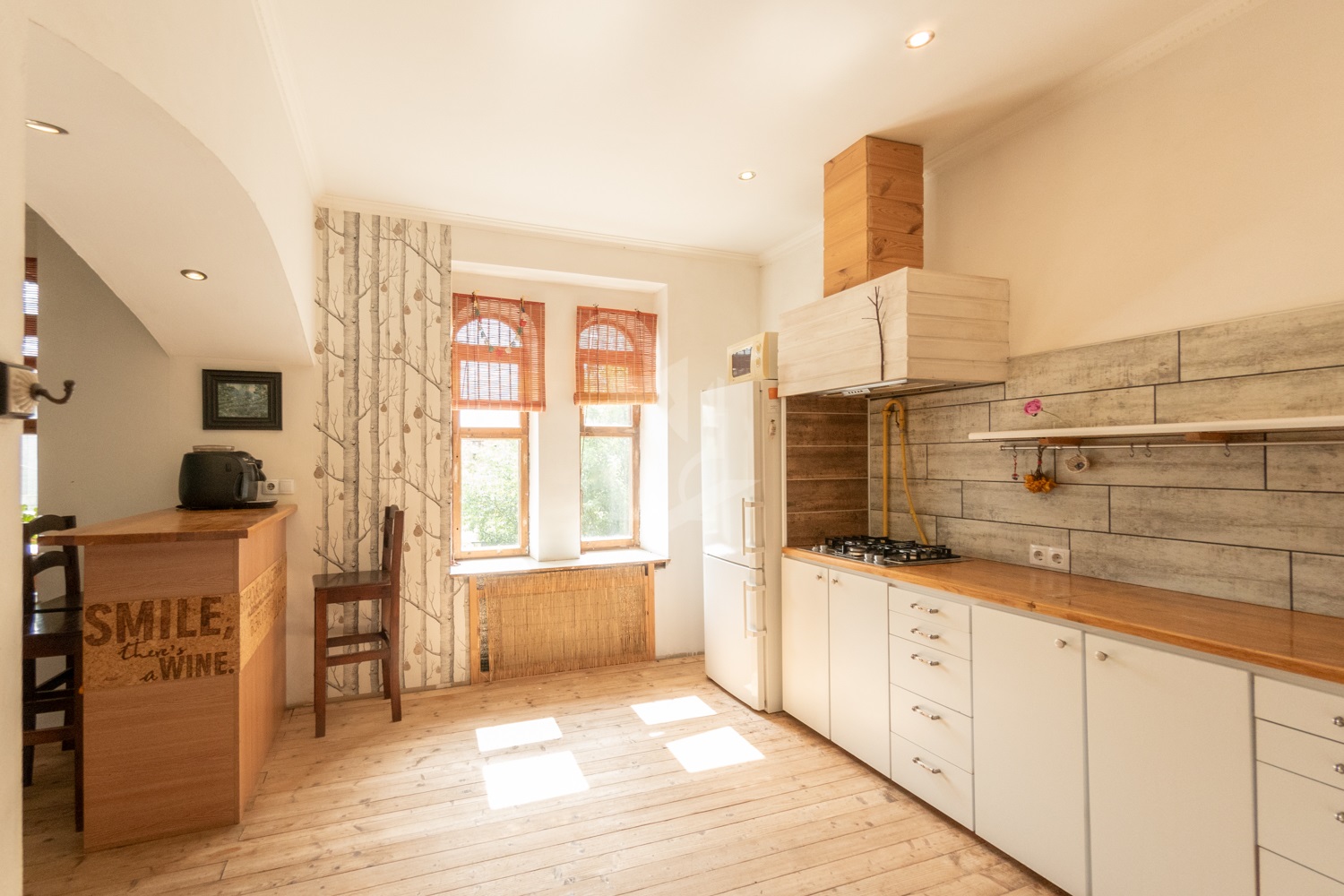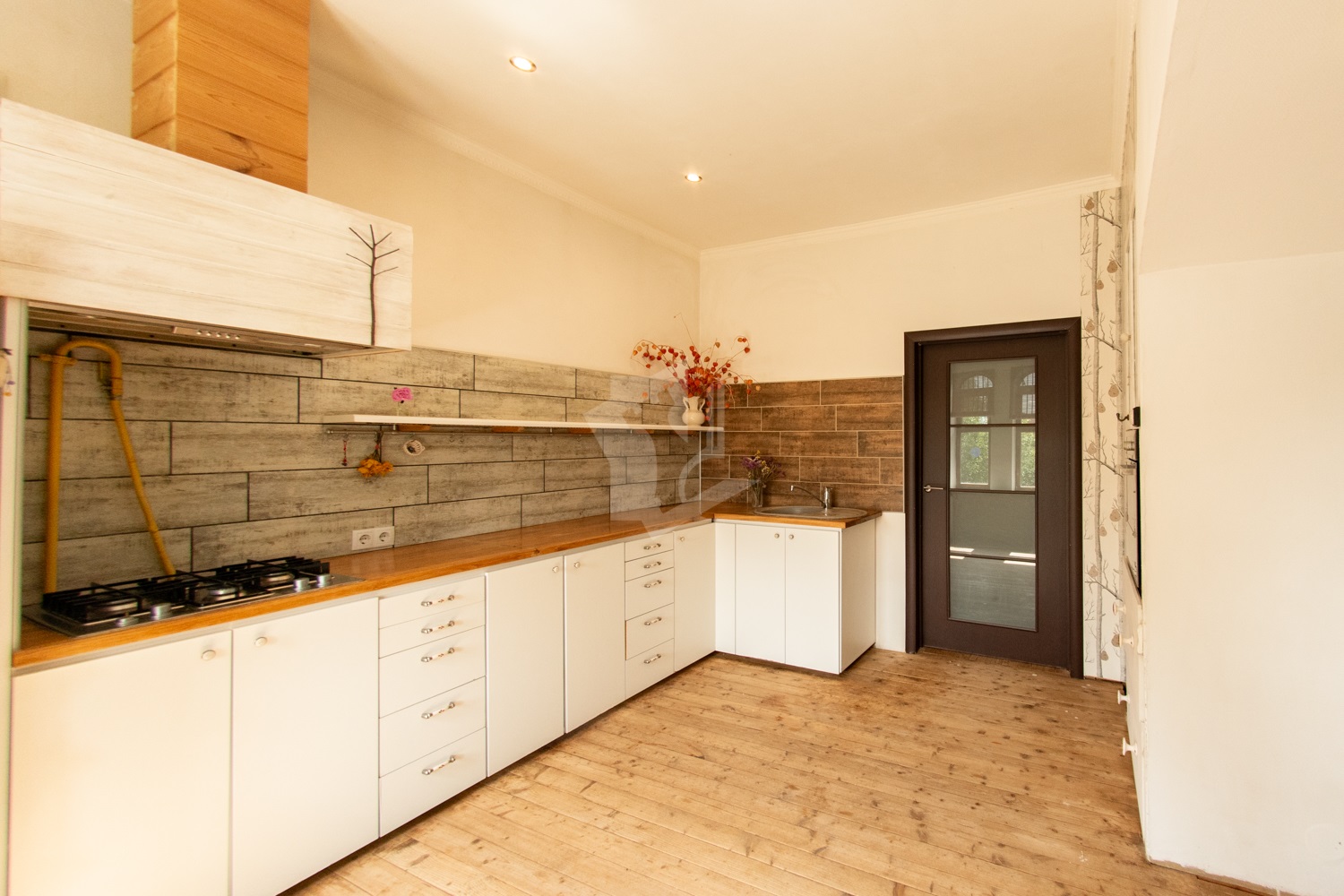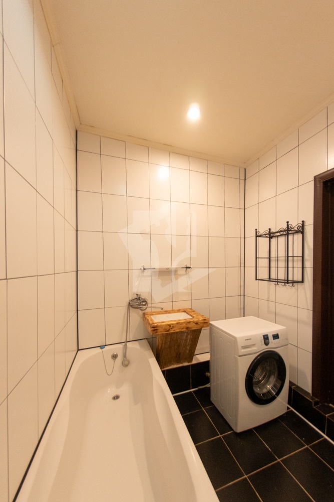 На первом – солнечная кухня, оборудованная современной техникой (холодильник Liebherr, варочная поверхность и духовой шкаф Hotpoint-Ariston, рабочая поверхность выполнена из дуба, также, как и стол). Кухня переходит в просторную столовую. Далее - идеально квадратная гостиная, с окнами, выходящими на две стороны. Изюминка комнаты - норвежская чугунная печь-камин Jotul, выполненная в стиле начала прошлого века. Вас удивит насколько эффективно обогревает помещение эта миниатюрная печь. В спальне на первом этаже установлена шведская гардеробная система Elfa. Просторный санузел, оборудованный подогревом пола. А еще веранда и две террасы: крытая и открытая
