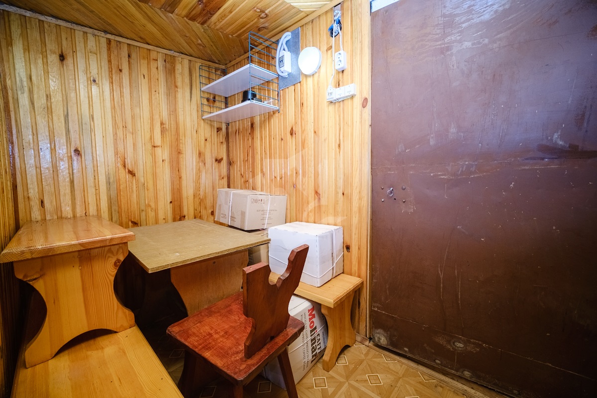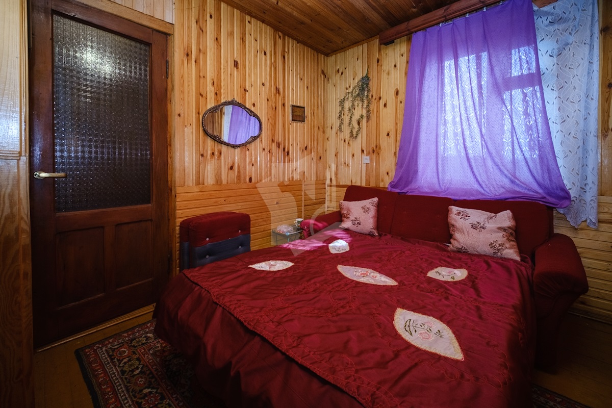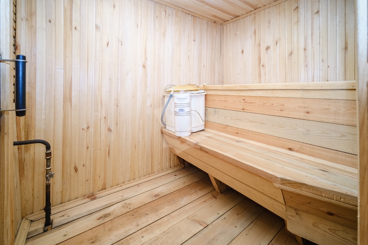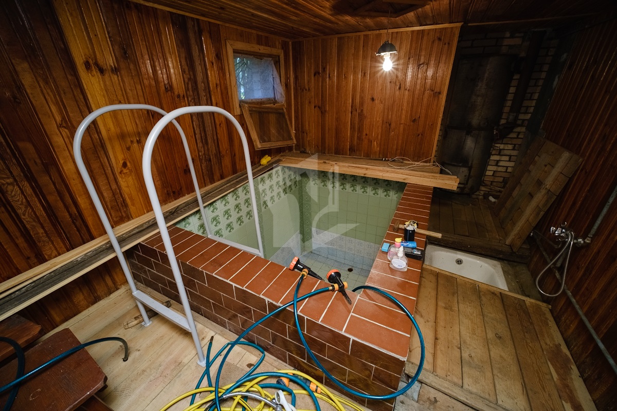 Внутри дом отделан натуральным деревом. В доме есть телефонная линия. Есть большой сухой гараж в цокольном уровне. На территории участка расположена просторная баня с бассейном.