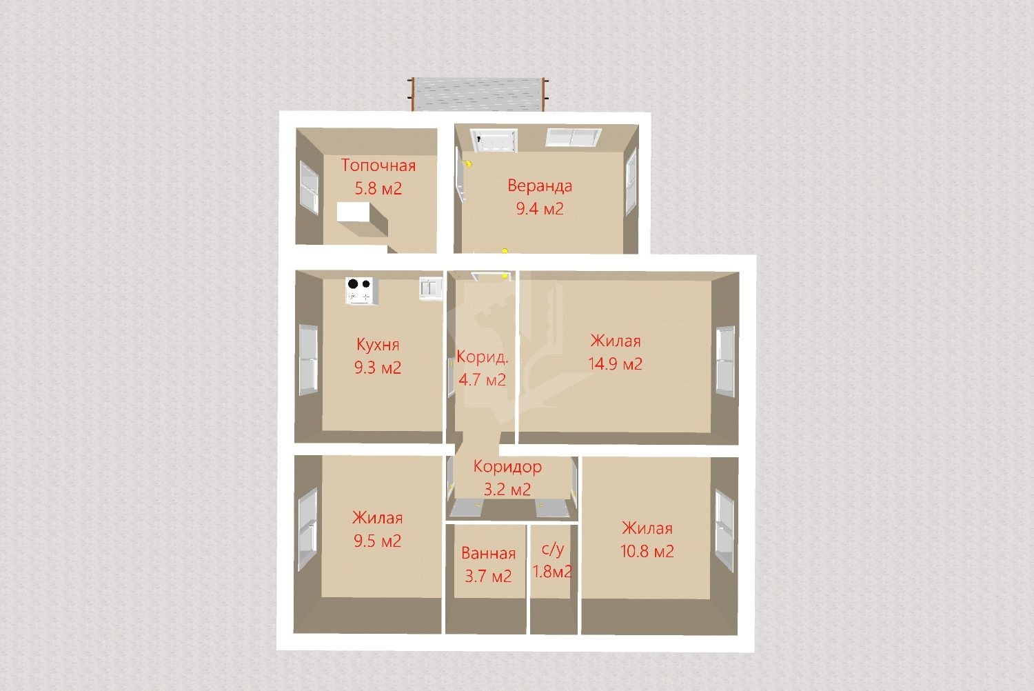 В доме имеются три жилые комнаты, все раздельные. Площадь комнат 14,9; 10,8 и 9,5 м2. В двух комнатах произведен монтаж натяжных потолков.
