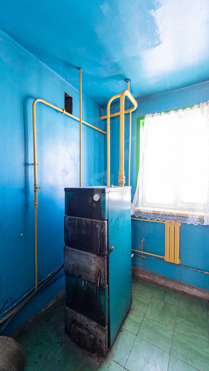 Для обеспечения тепла в доме установлен твердотопливный котел. Топочная, площадью 5,8 м2, оборудована стеллажами для хранения. В доме имеется центральный водопровод. Во всех комнатах, включая топочную, установлены чугунные батареи. Местная канализация из бетонных колец (на 3 и 4 кольца) для утилизации сточных вод.