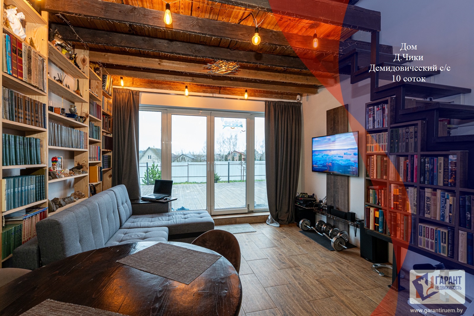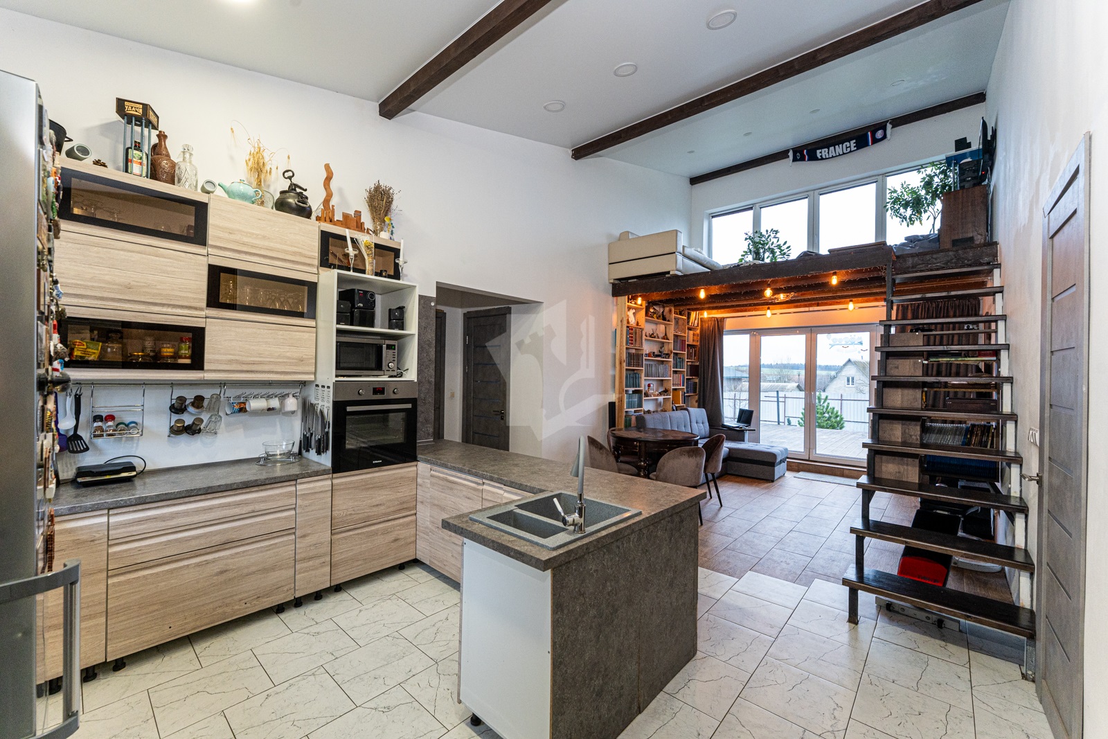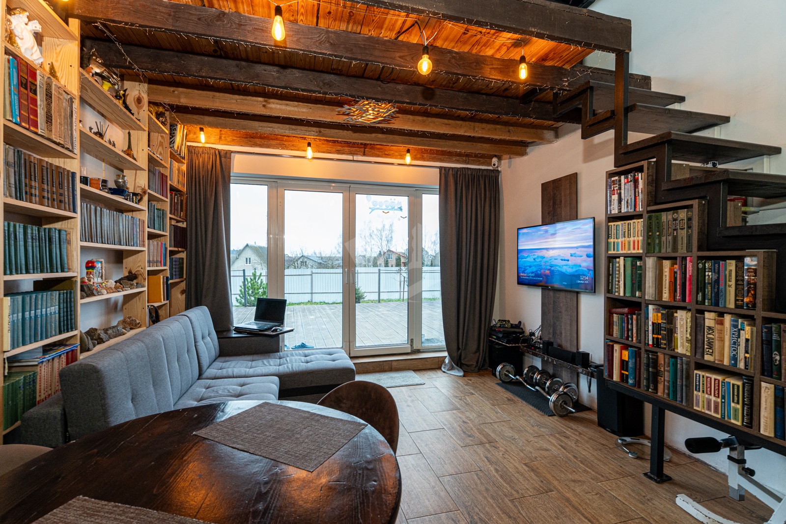- Продаётся открытый двухуровневый дом с большой террасой и огороженным участком. Светлая гостиная с высокими деревянными балками, панорамные двери на террасу, современная кухня‑остров, место под кабинет и обширные книжные стеллажи. Подходит для постоянного проживания или творческой семьи.