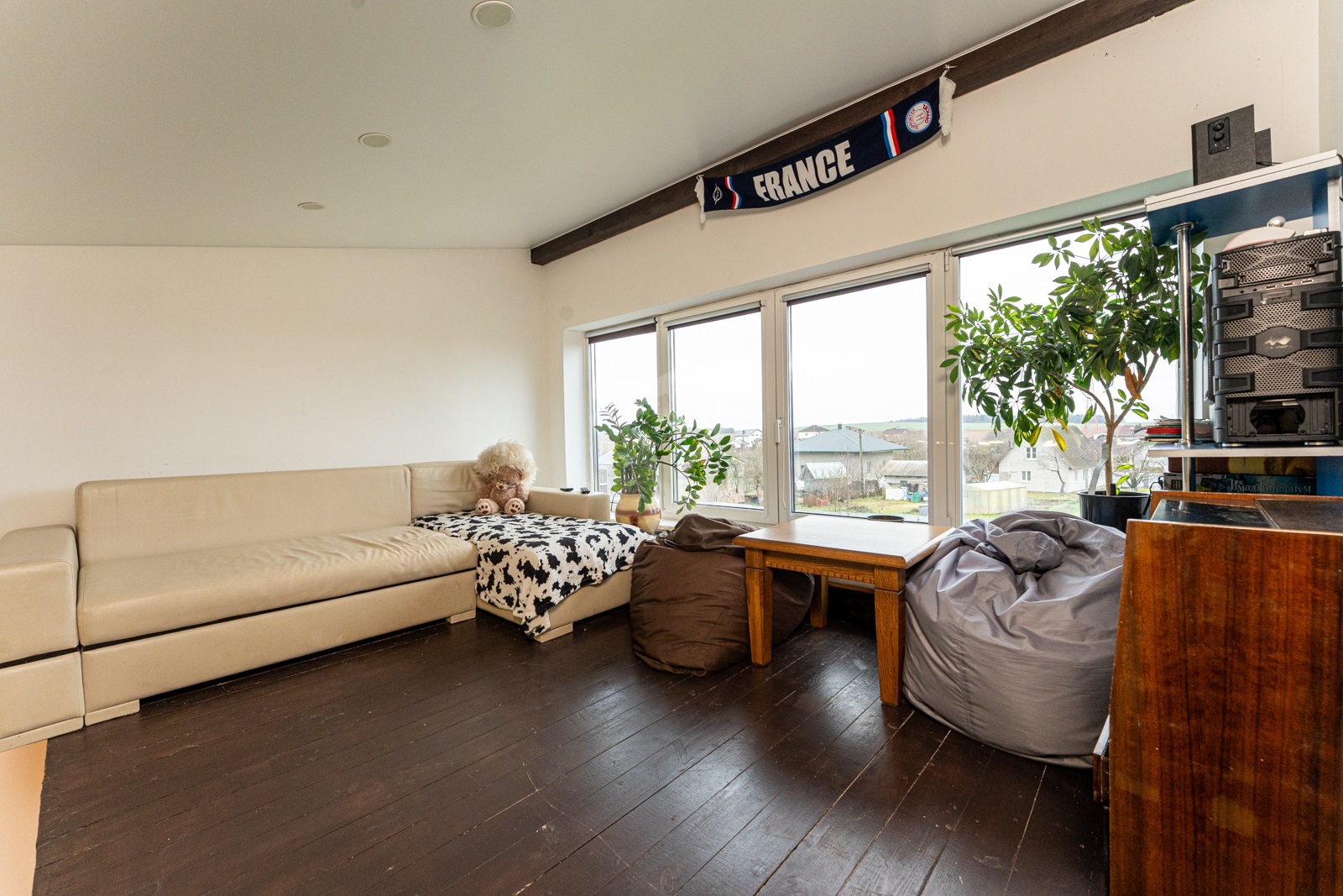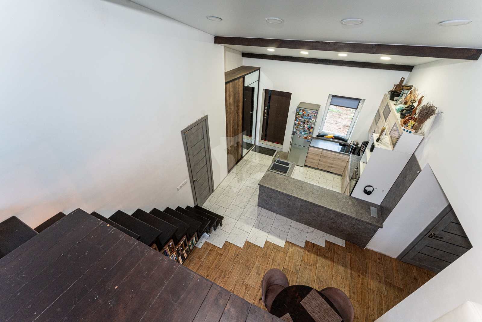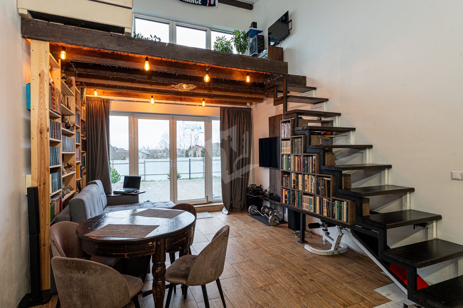 - Продаётся открытый двухуровневый дом с большой террасой и огороженным участком. Светлая гостиная с высокими деревянными балками, панорамные двери на террасу, современная кухня‑остров, место под кабинет и обширные книжные стеллажи. Подходит для постоянного проживания или творческой семьи.