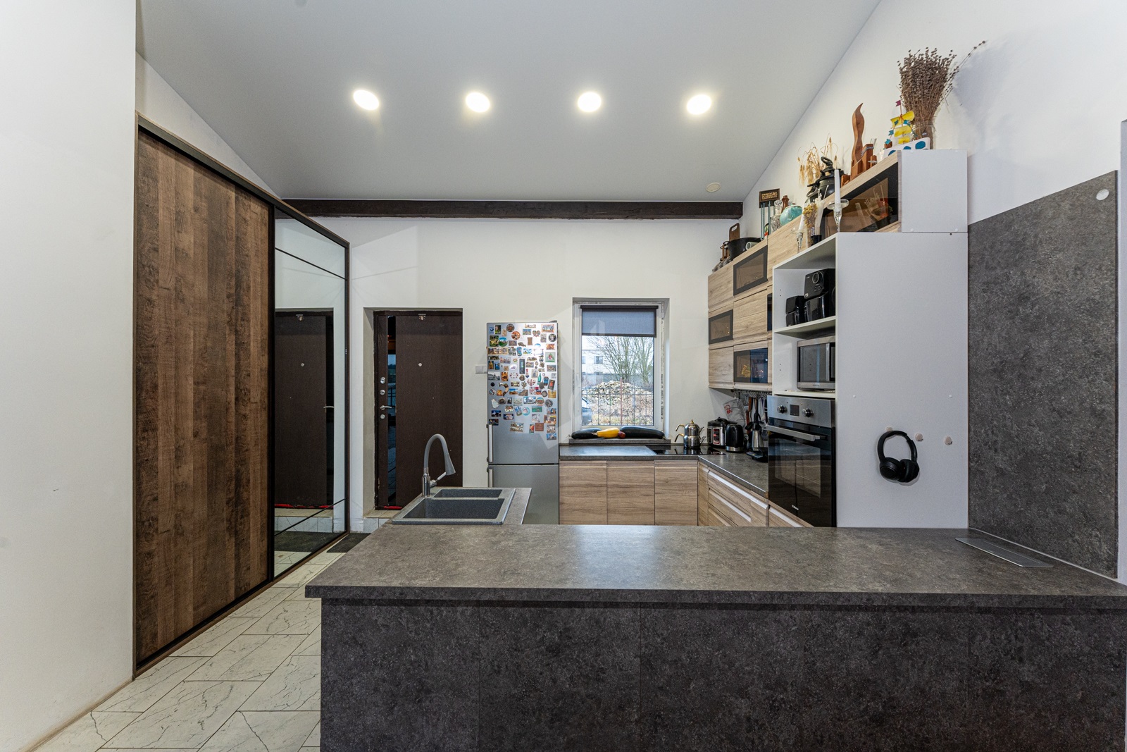 - Планировка и интерьер: открытая кухня‑гостиная с кухонным островом и столовой зоной, комфортный диванный угол, рабочая зона у окна. Высокие деревянные балки и тёплый декоративный потолок создают уютный лофт‑шарм; большие панорамные двери ведут на просторную террасу. В доме продуманы места для хранения — высокие полки и книжные стеллажи по стенам, есть место под домашний кабинет