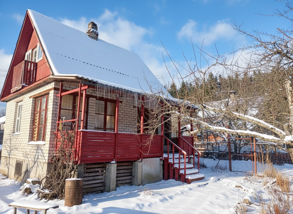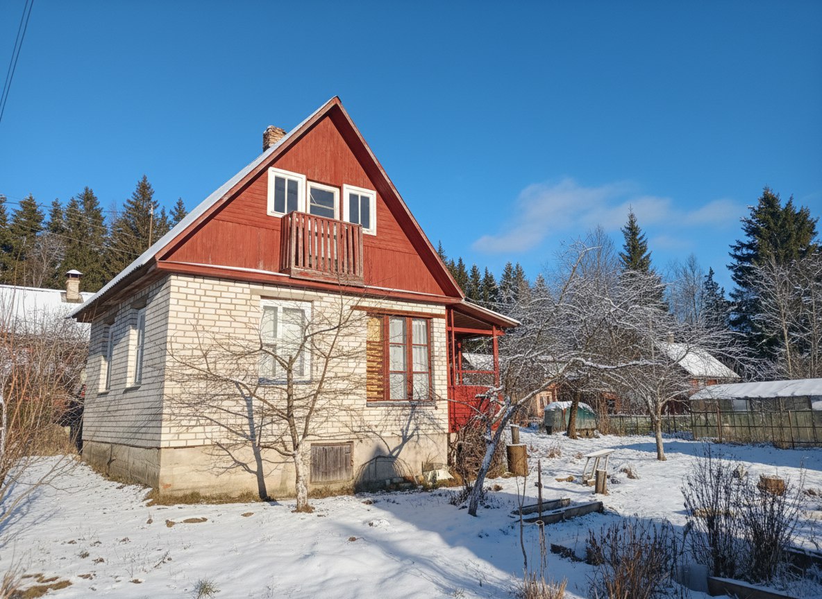 Дачный домик площадью 53,5 кв.м., двухэтажный. На первом этаже две жилые комнаты и кухня. Печки в каждой комнате. Лестница на второй этаж с удобным углом наклона. На мансардном этаже есть небольшой балкончик.