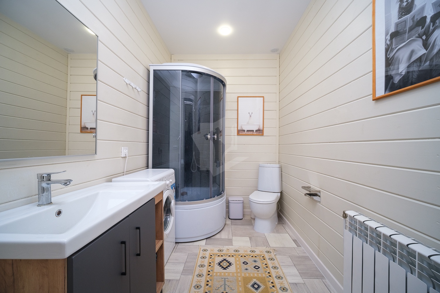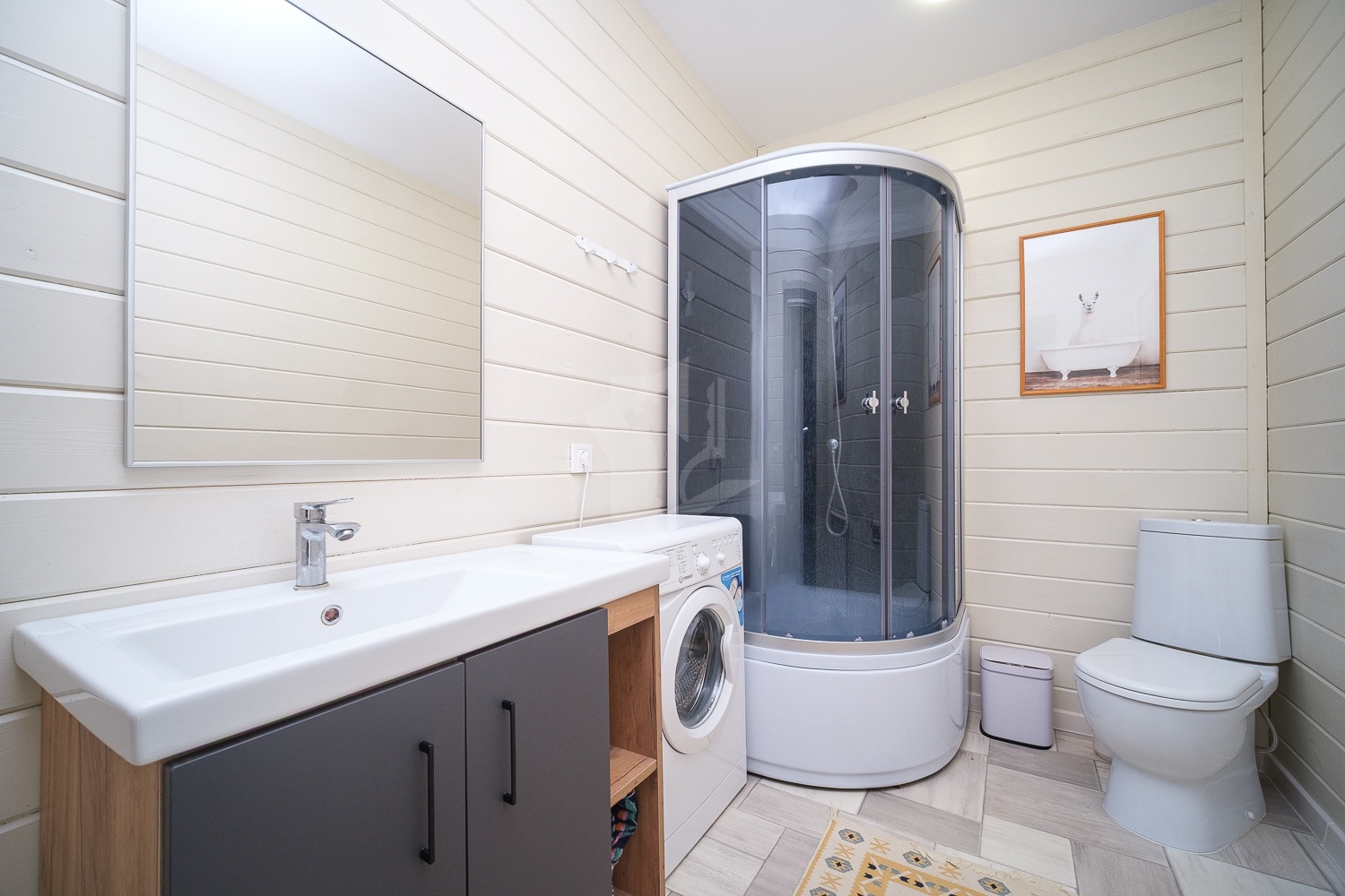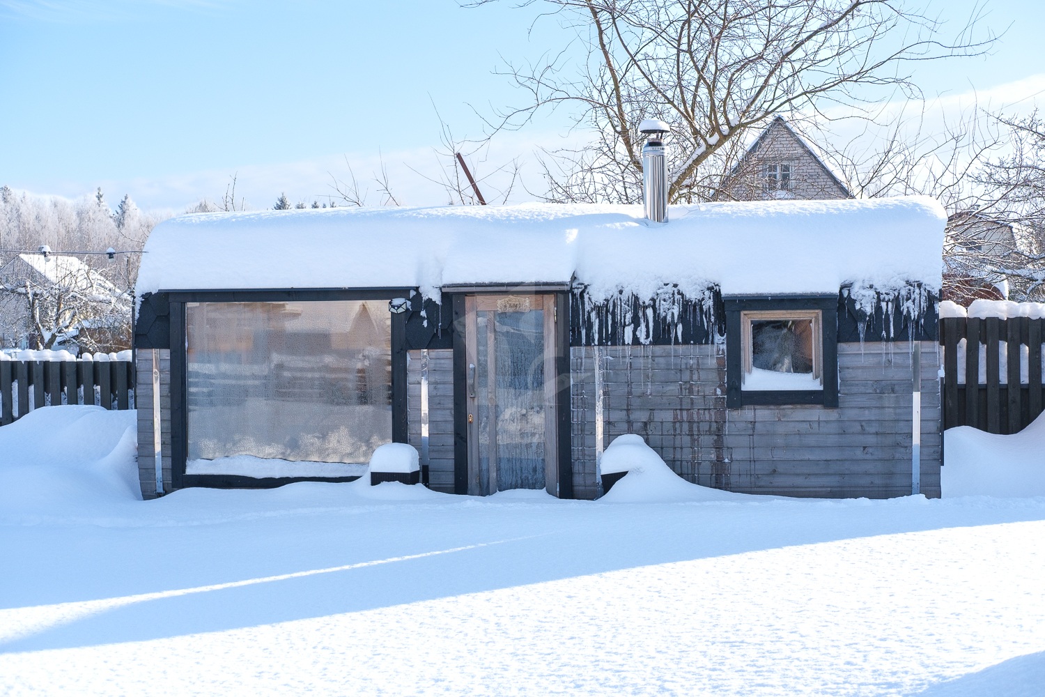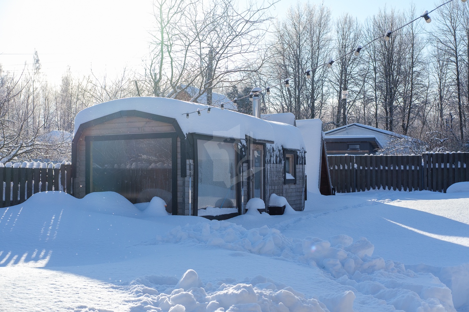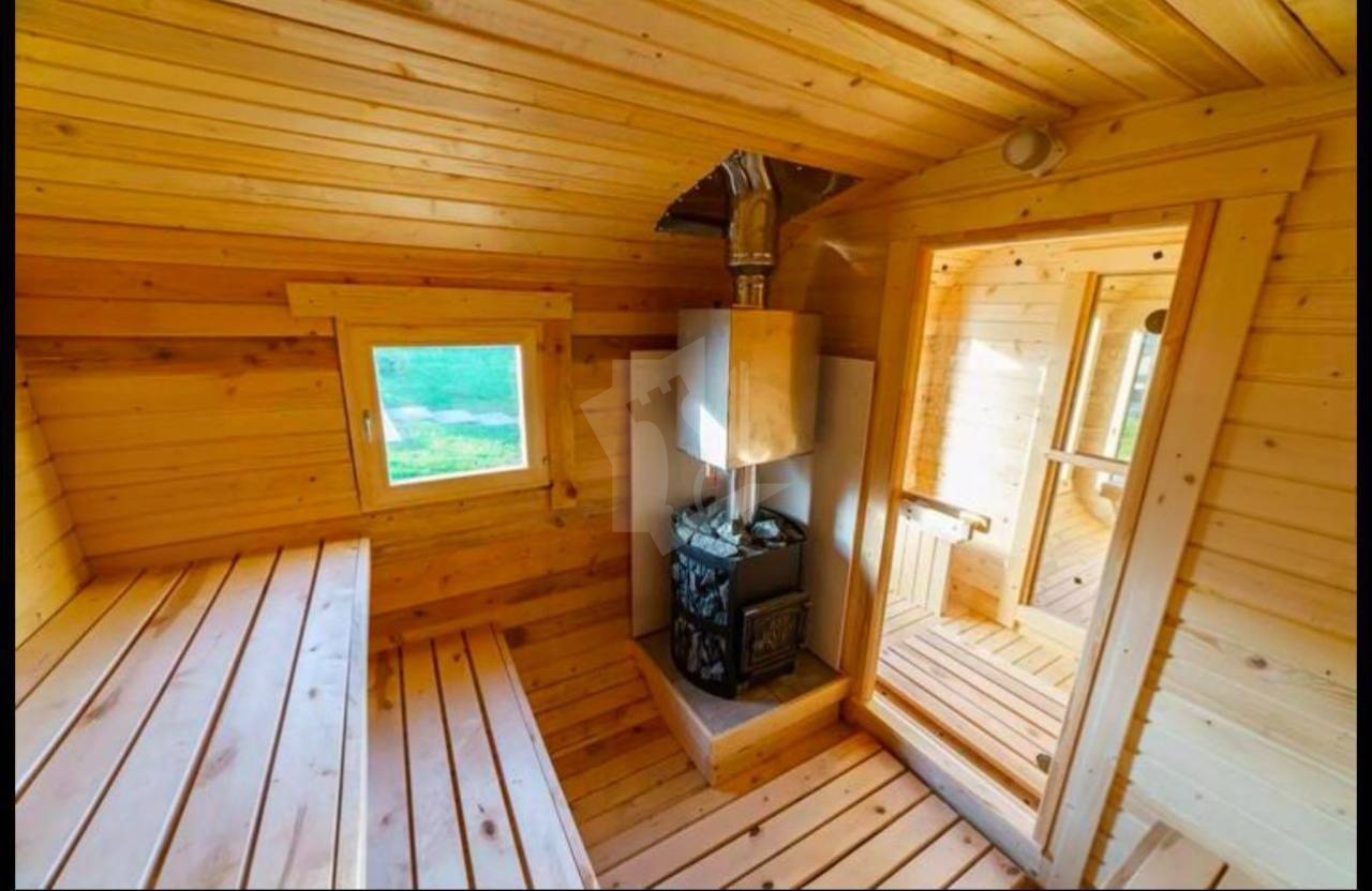 Теплый шнур на воду по открытой части, а также обогреватель трубы для воды, который выведен в дом. Эмитация бруса снаружи и внутри, канализация местная, переливания, 2 емкости по 3 кольца.