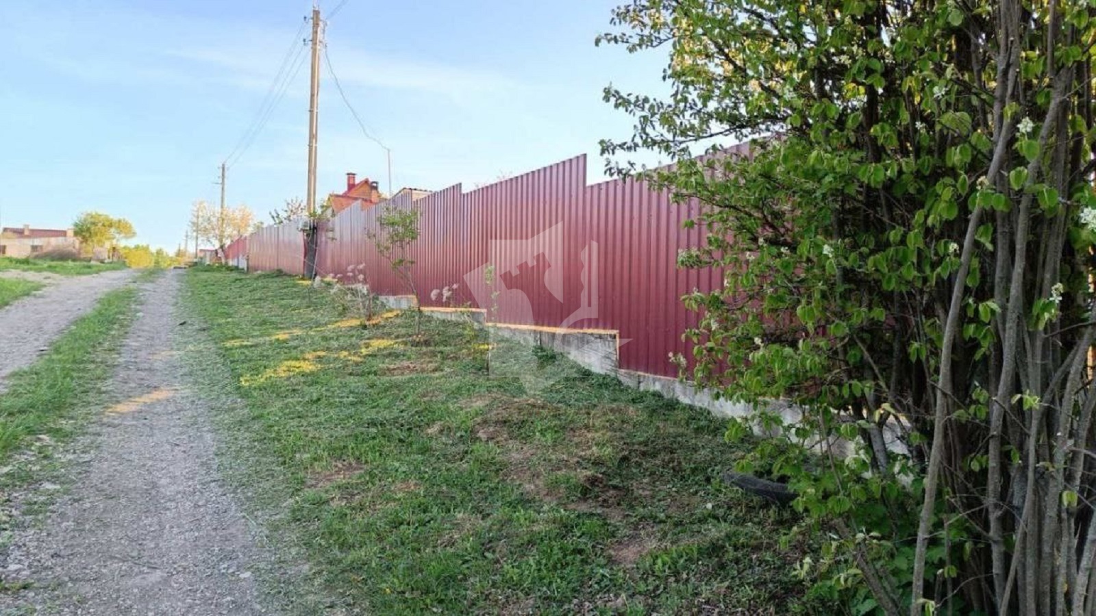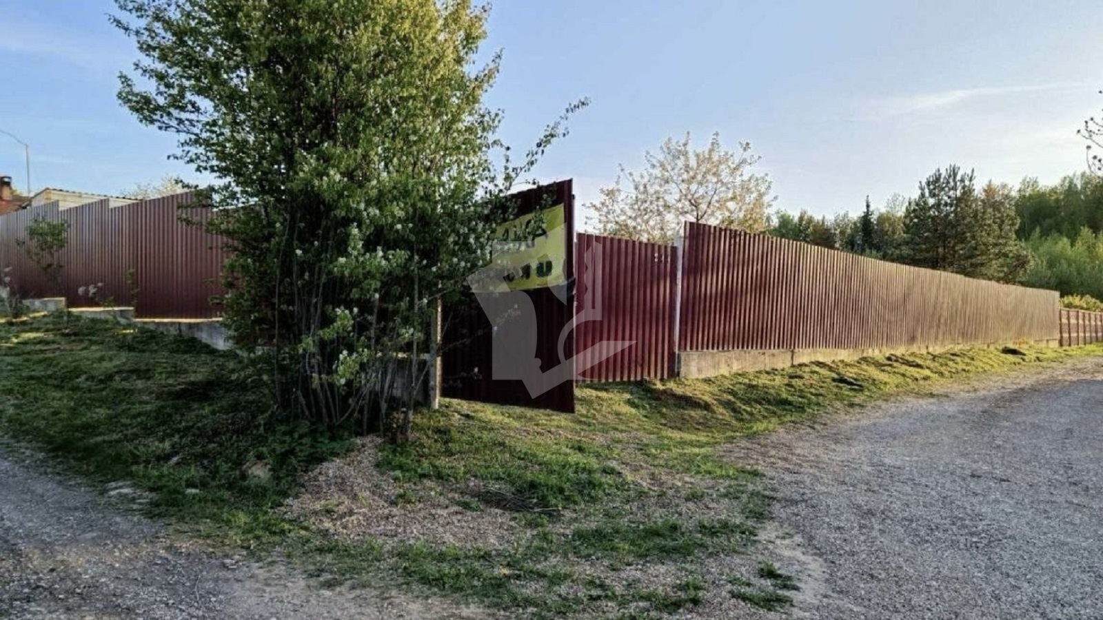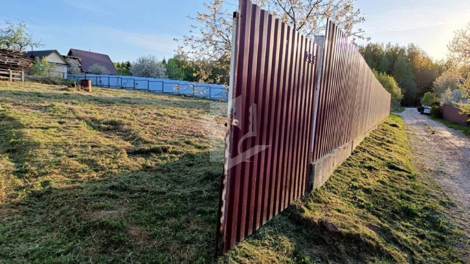 Участок огорожен забором из металлического профиля, обеспечивающим безопасность и приватность.