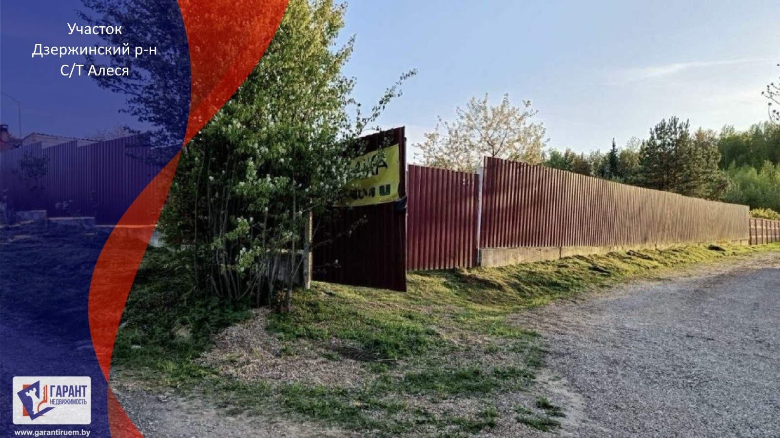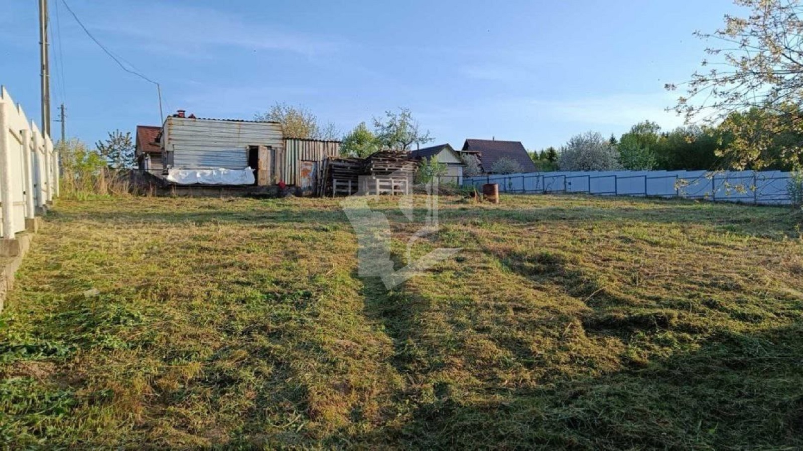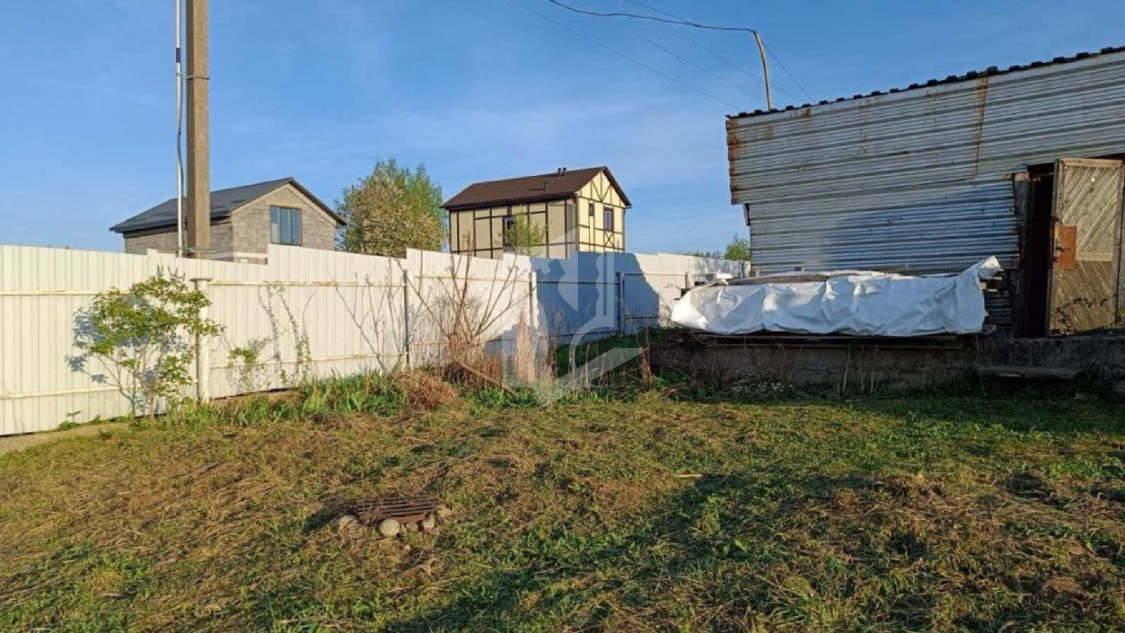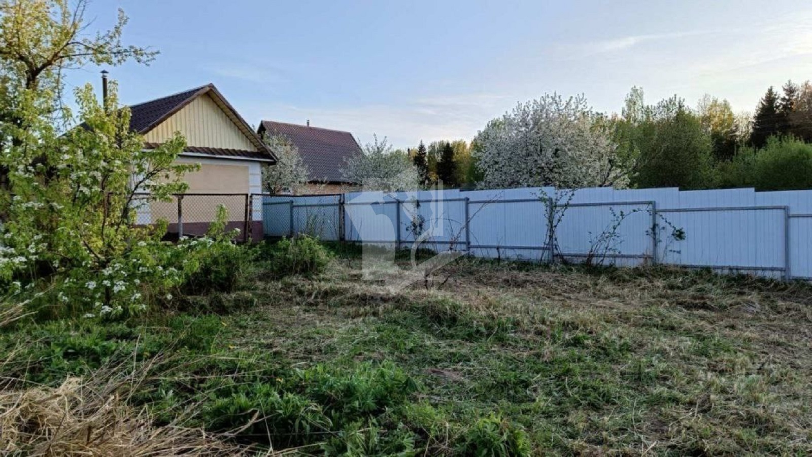 Участок огорожен забором из металлического профиля, обеспечивающим безопасность и приватность.