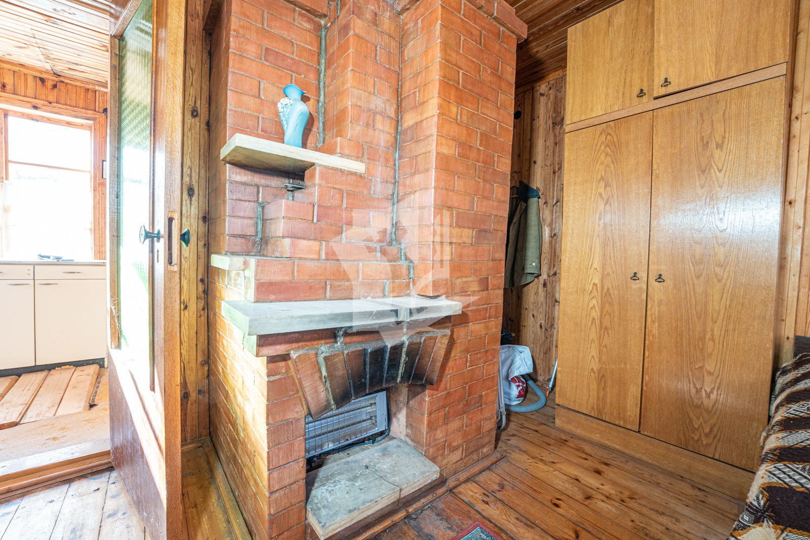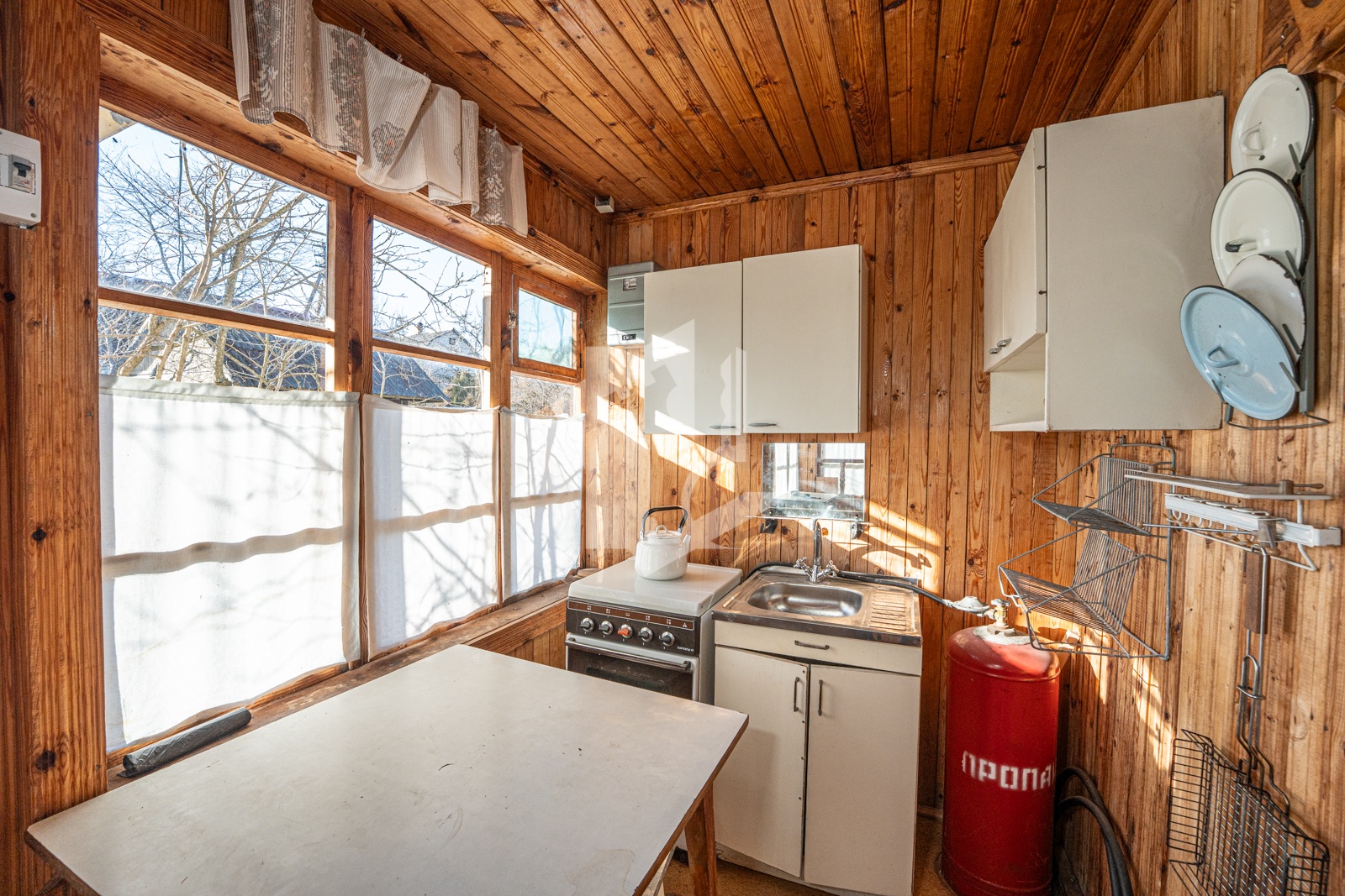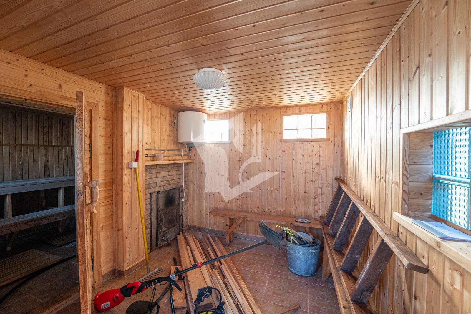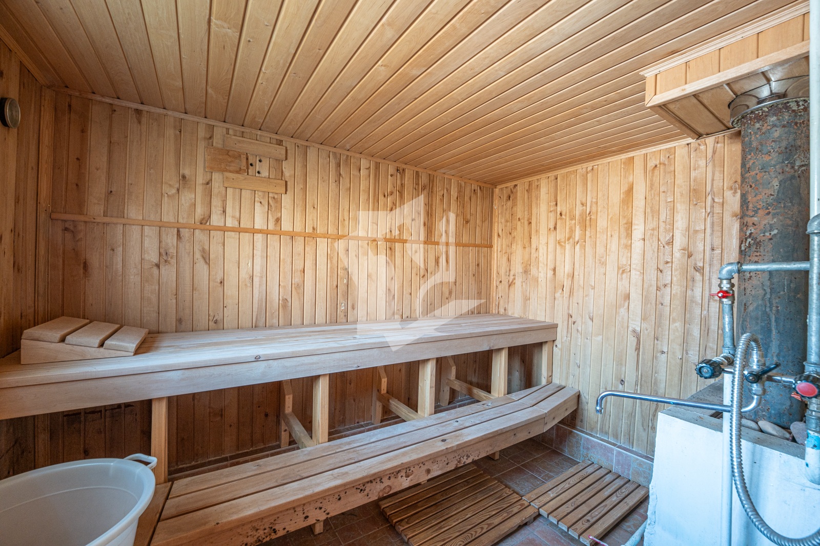 Отдельно стоящая кирпичная, обшитая изнутри деревом, баня с настоящими полками из лиственницы и предбанником из ольхи. Дровяная топка и электрический бойлер на 50 литров.