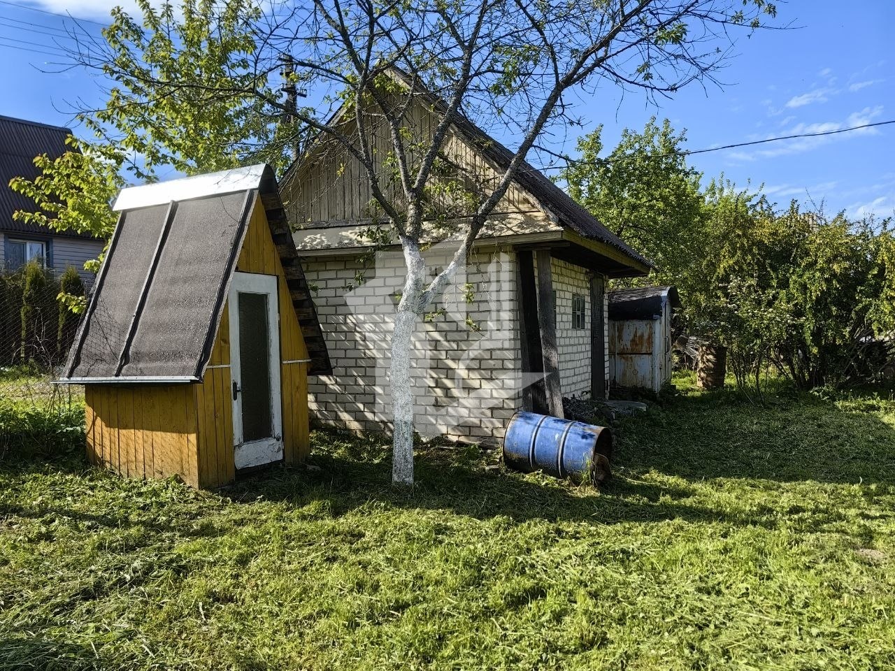 Туалет - отдельная избушка. В дальнем углу участка - автомобильный кунг со всем необходимым садовым инвентарем и настоящей чугунной буржуйкой. Мангал из прочной стали. Плодоносящая вишня, три сортовых яблони и свободный ровный участок, на котором можно организовать все, что Вам захочется: от площадки для бадминтона, до огорода.