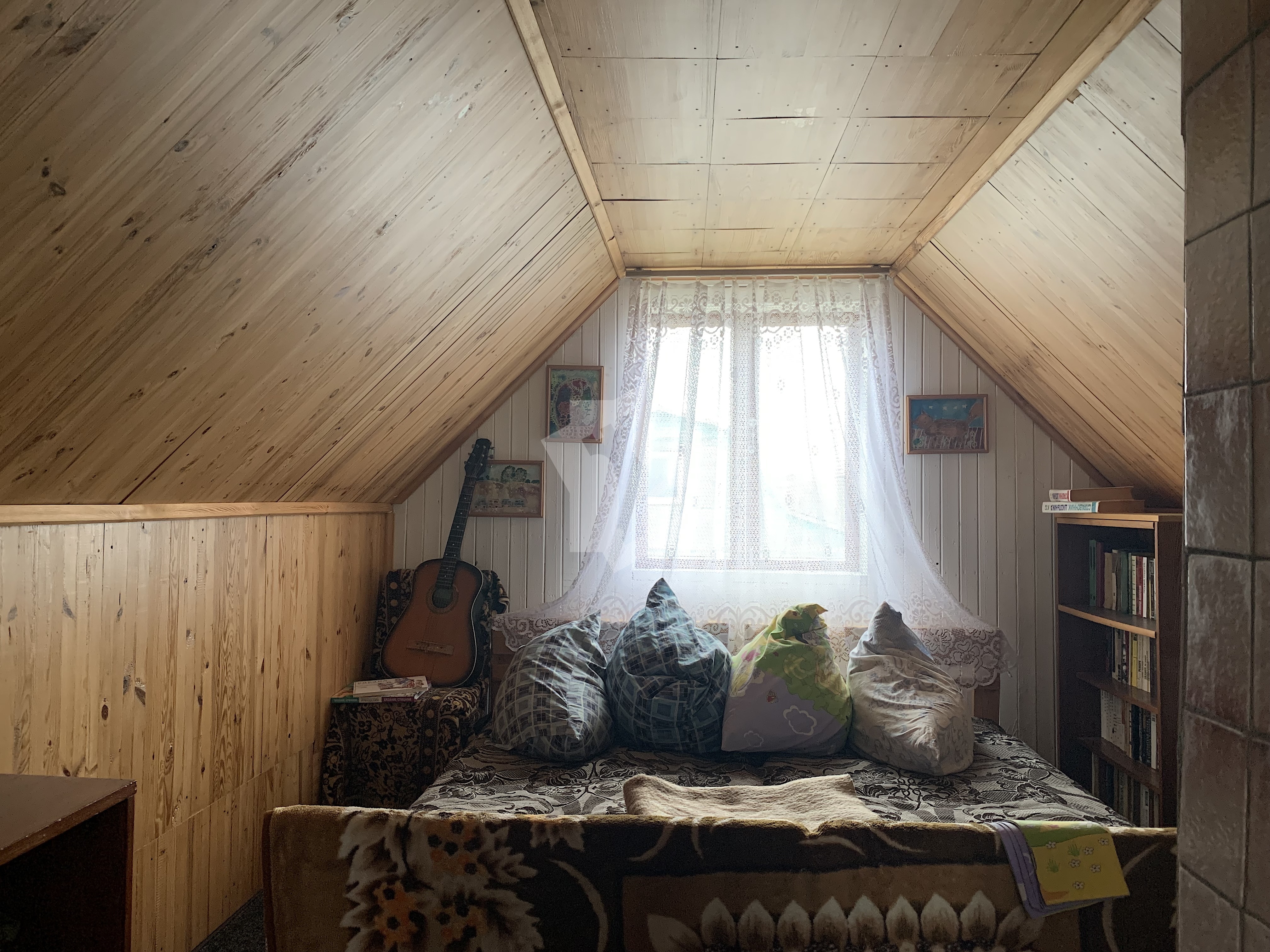 Мансардный этаж дома включает в себя большую комнату с красивым видом .