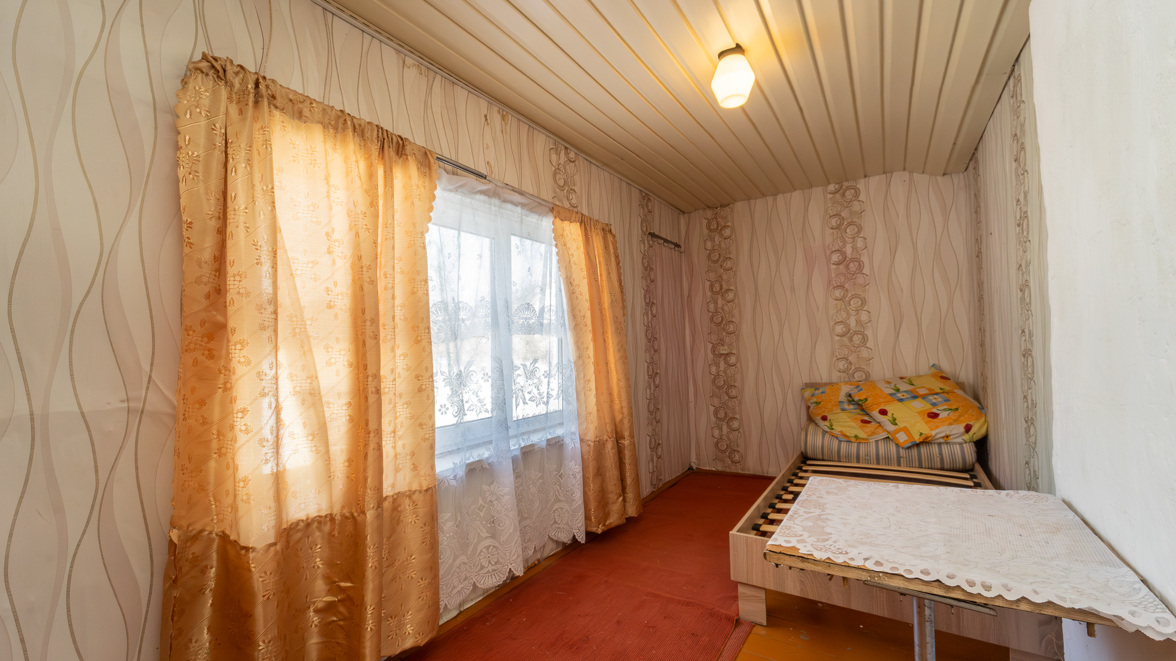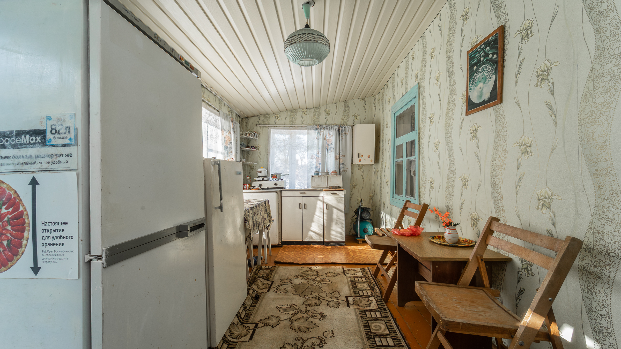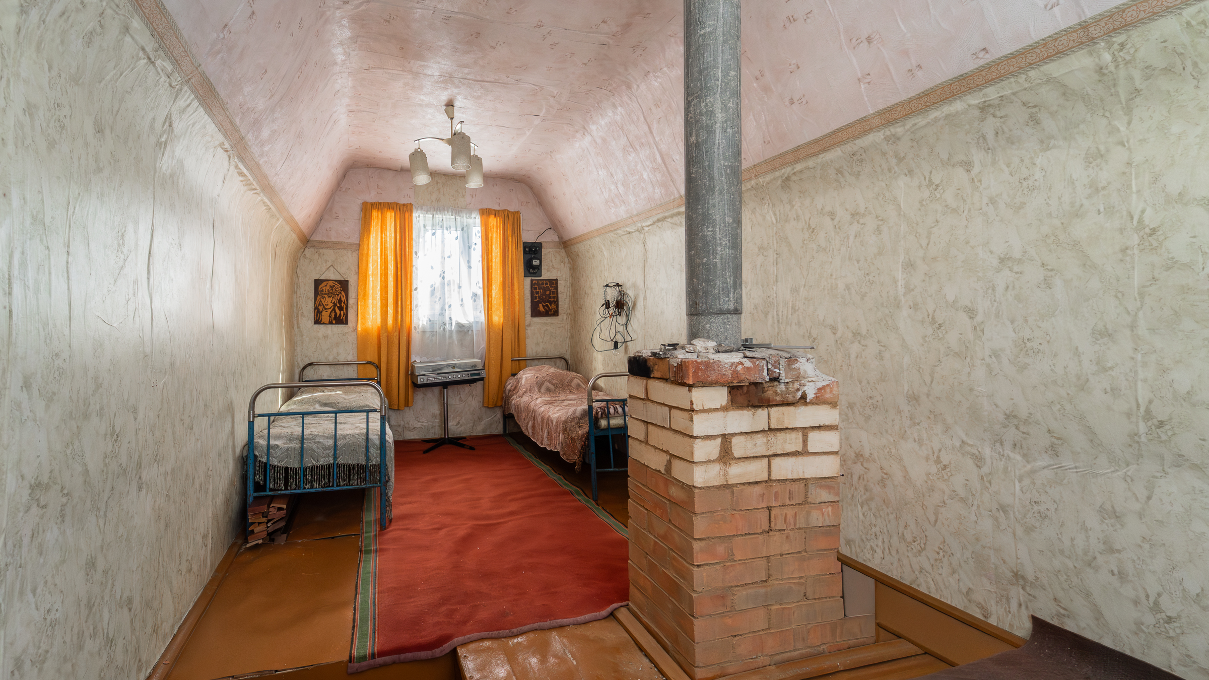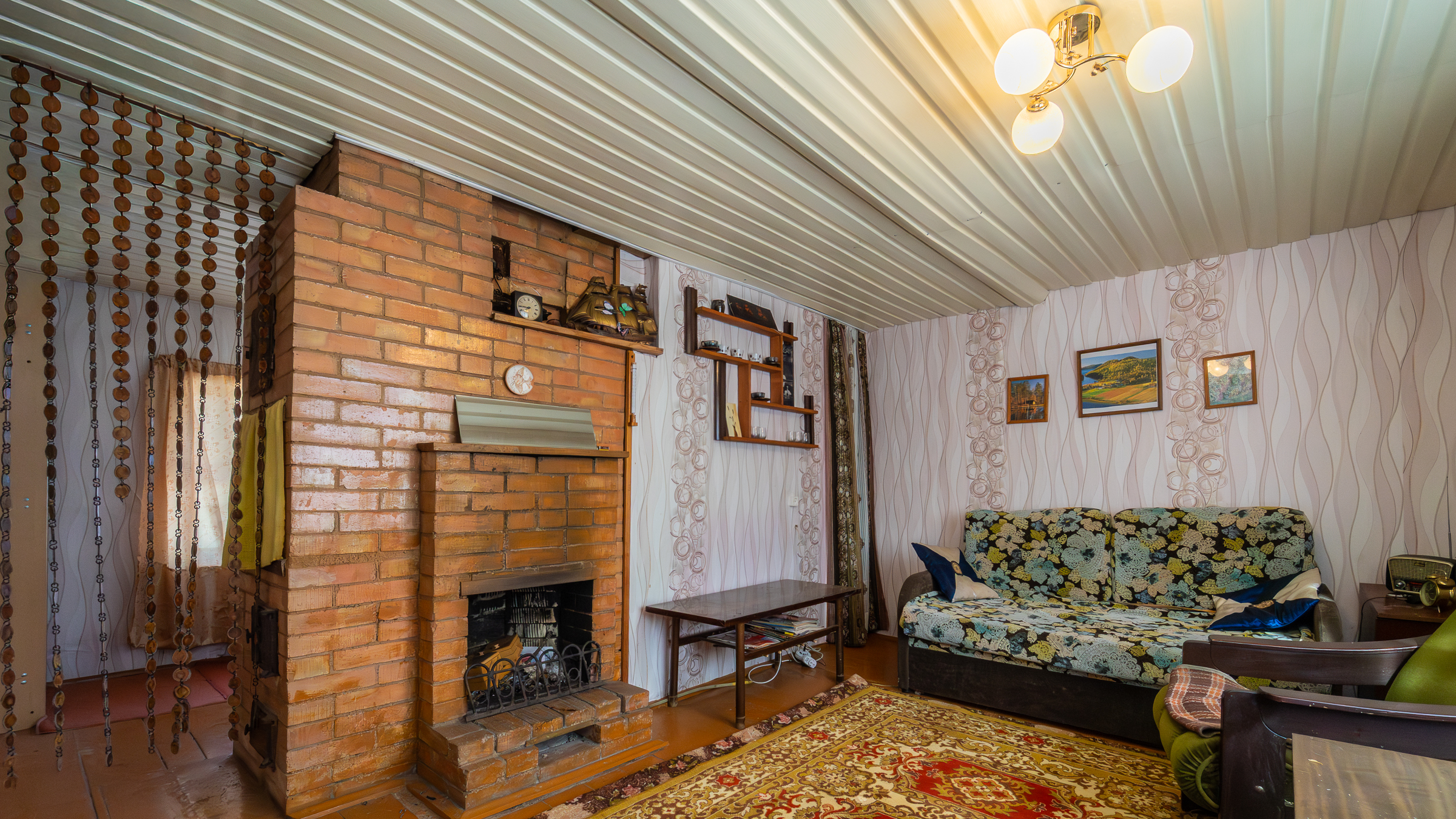 На первом этаже находится просторная веранда, где можно наслаждаться утренним кофе, любуясь природой. Внутри дома расположены гостиная с камином и печью, которые создают теплую атмосферу в холодные вечера, и спальня. Здесь есть всё необходимое для комфортного проживания.