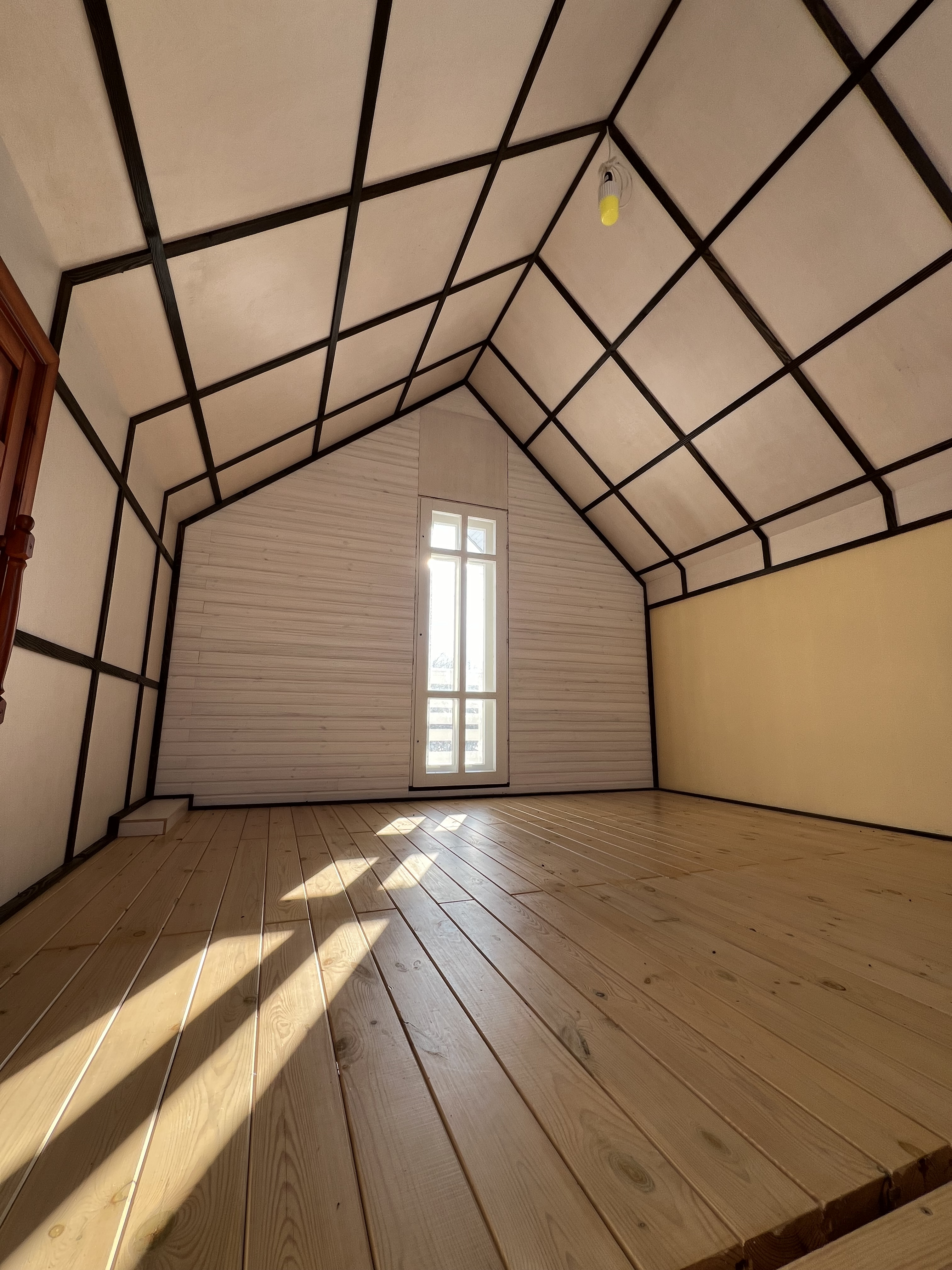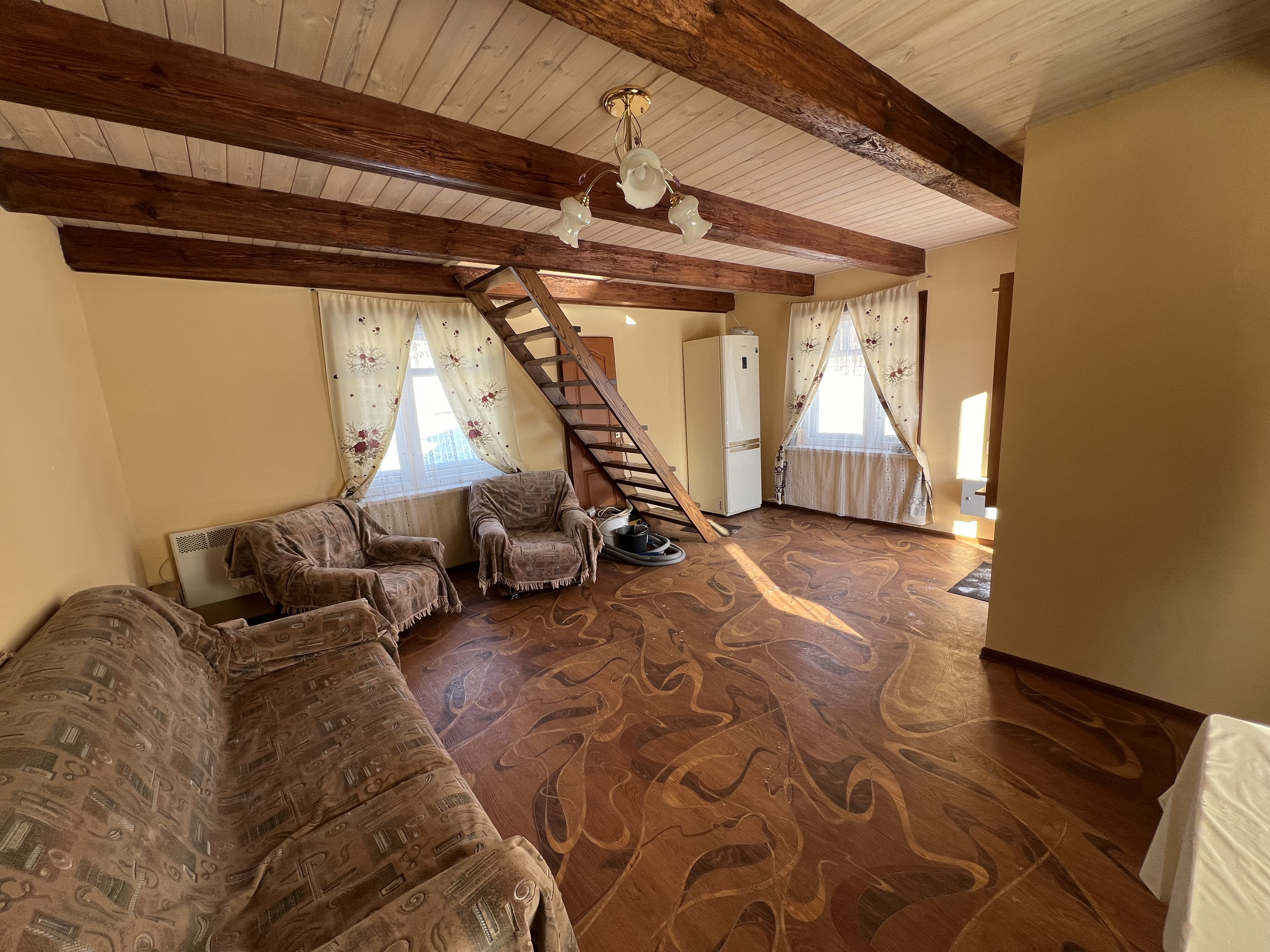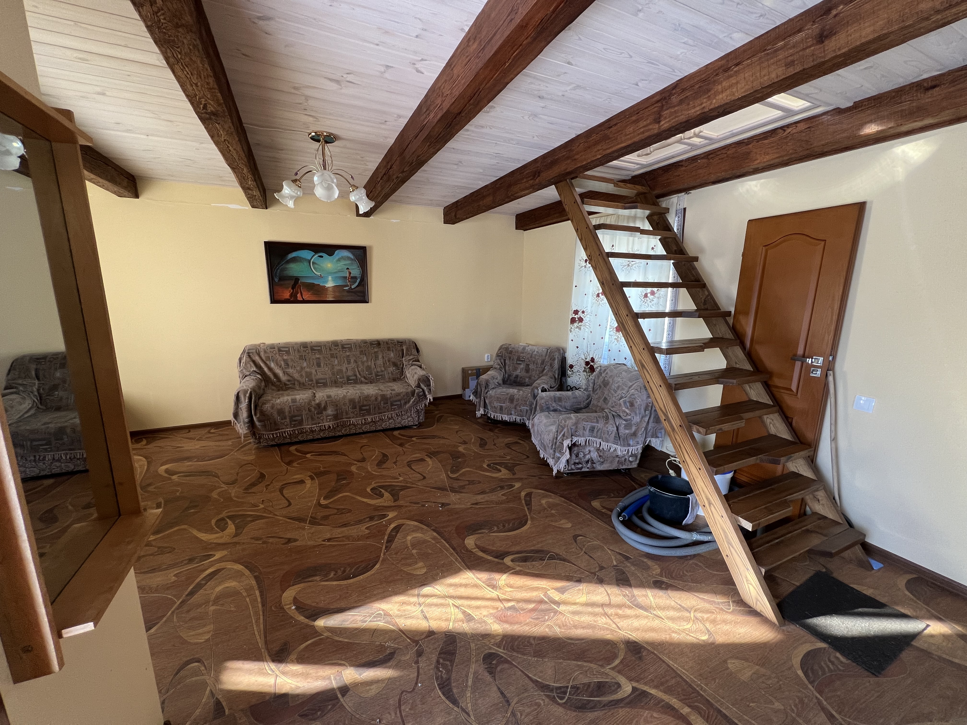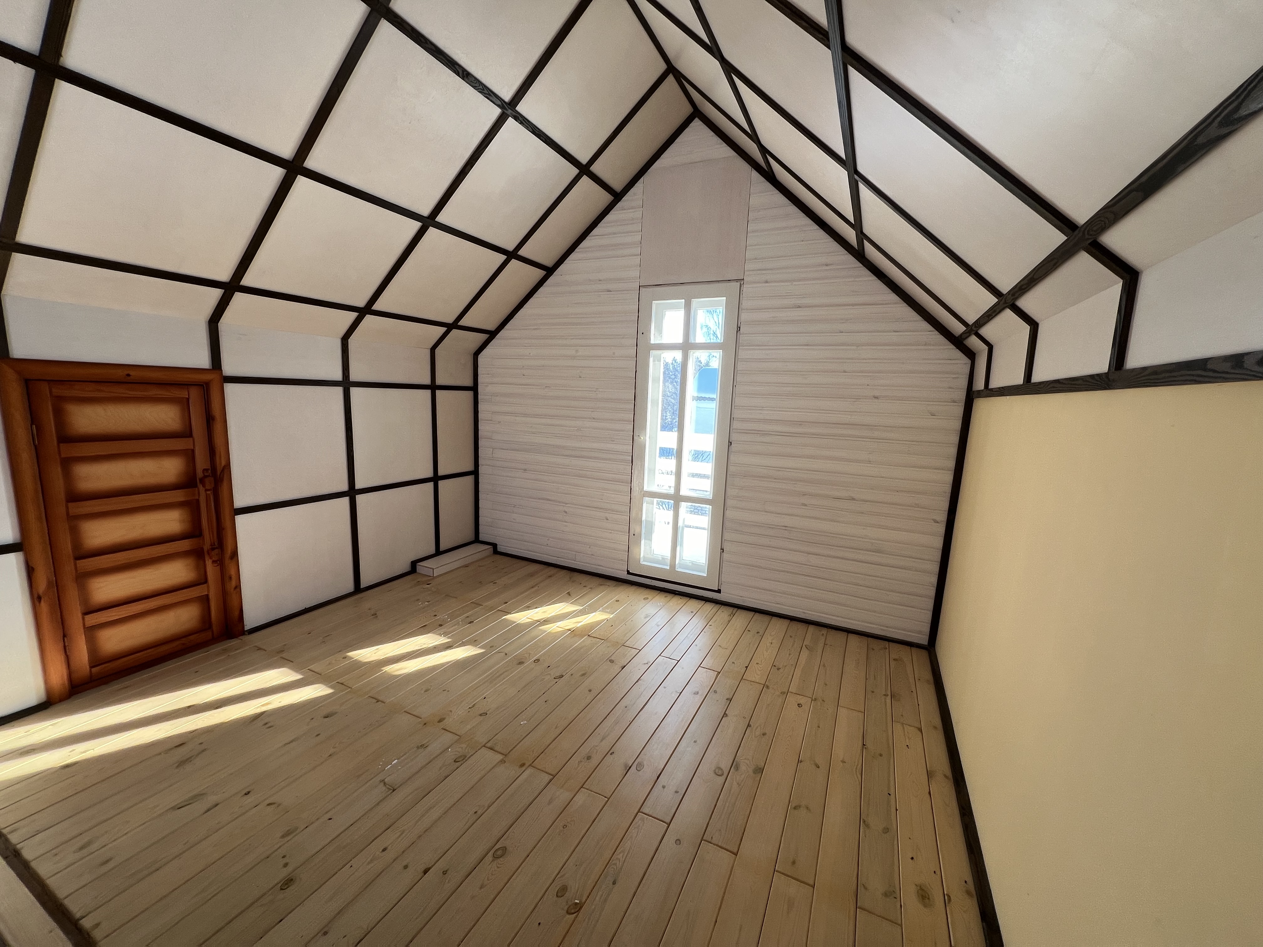 Первый этаж – кухня-гостинная, что бы Вы смогли не только там приготовить еду, но и устраивать семейные обеды и ужины, а так же отдохнуть от летней жары. Второй этаж – одна просторная светлая комната, кладовая, балкон с прекрасным видом на лес.
