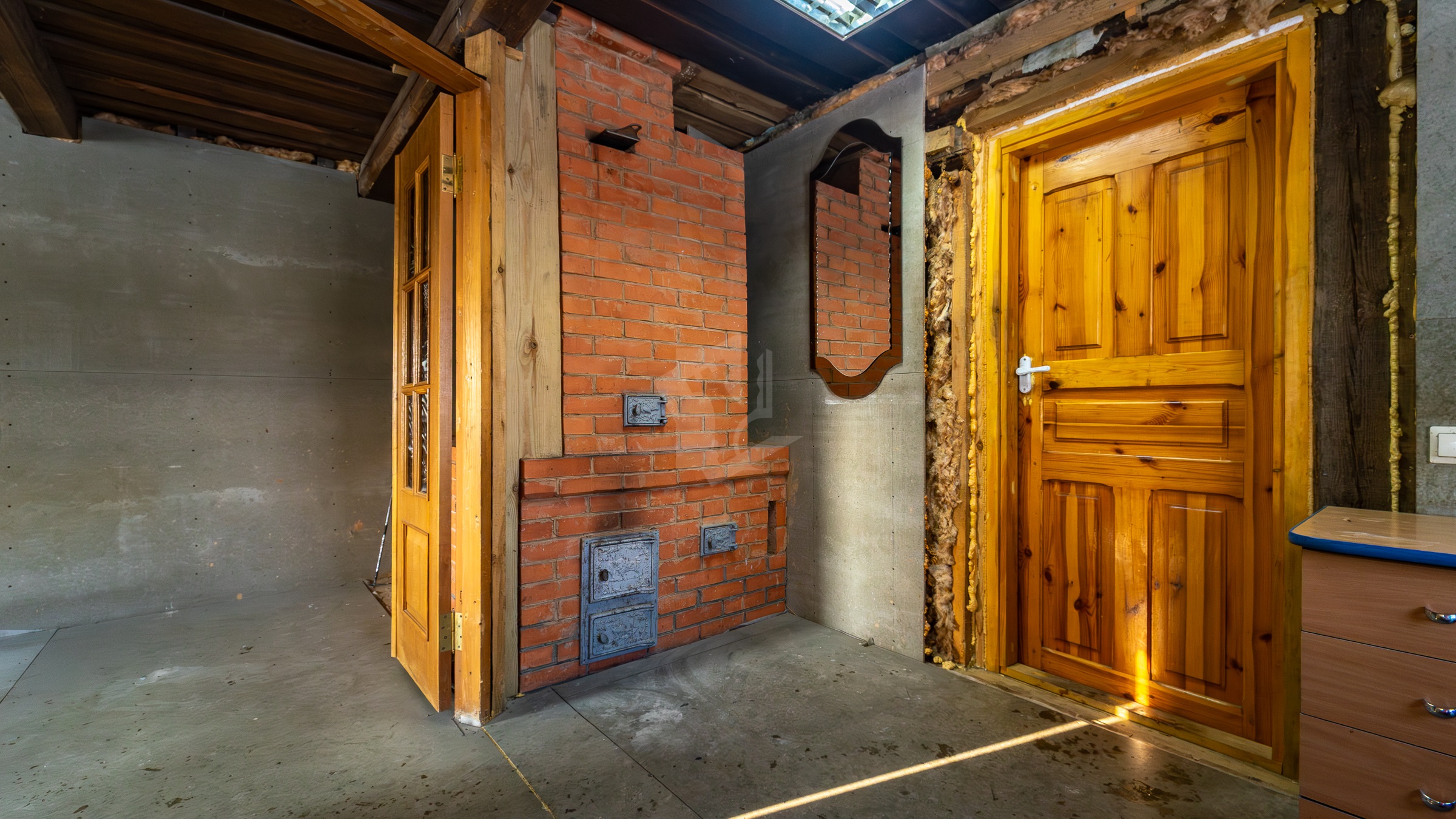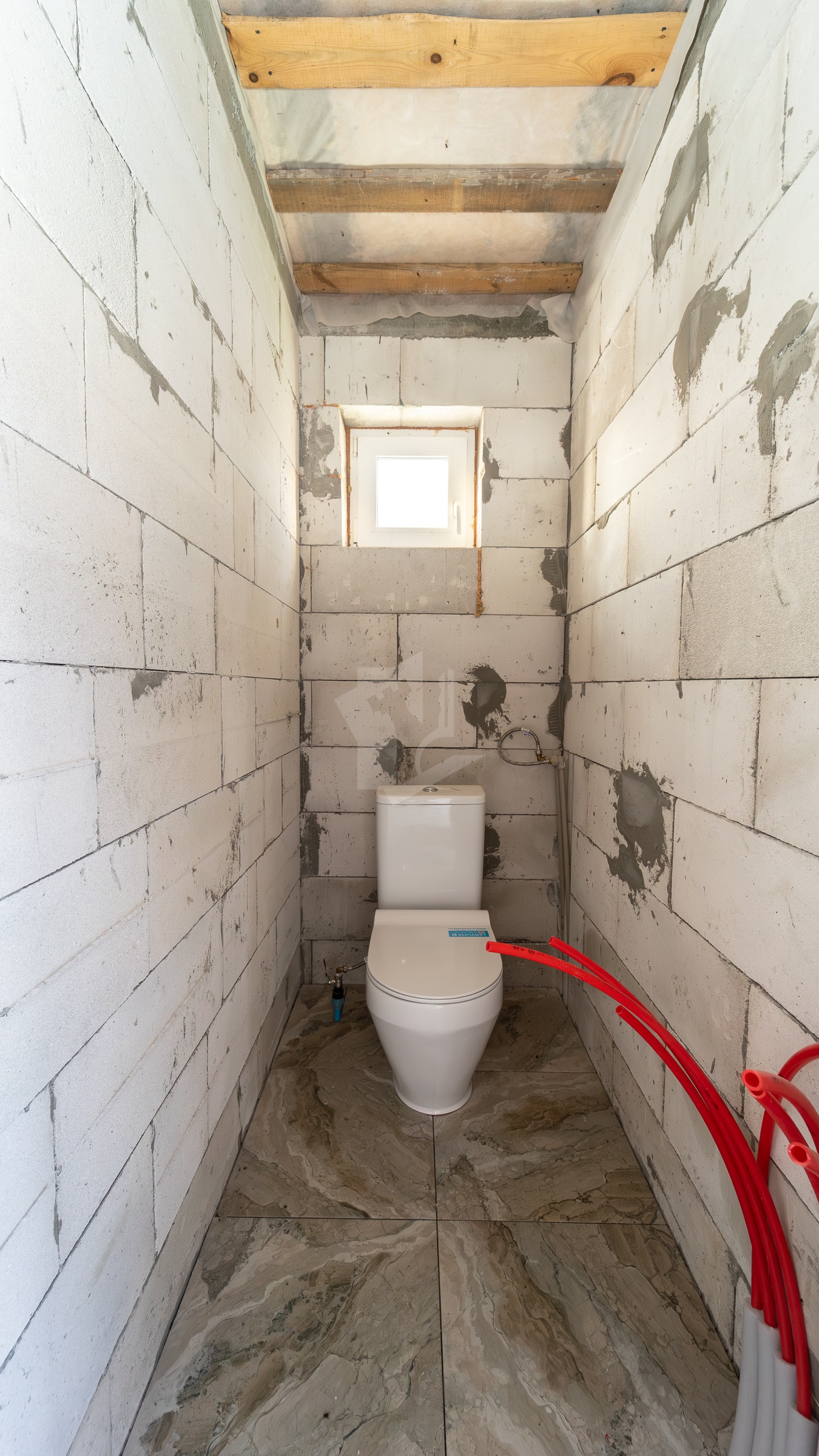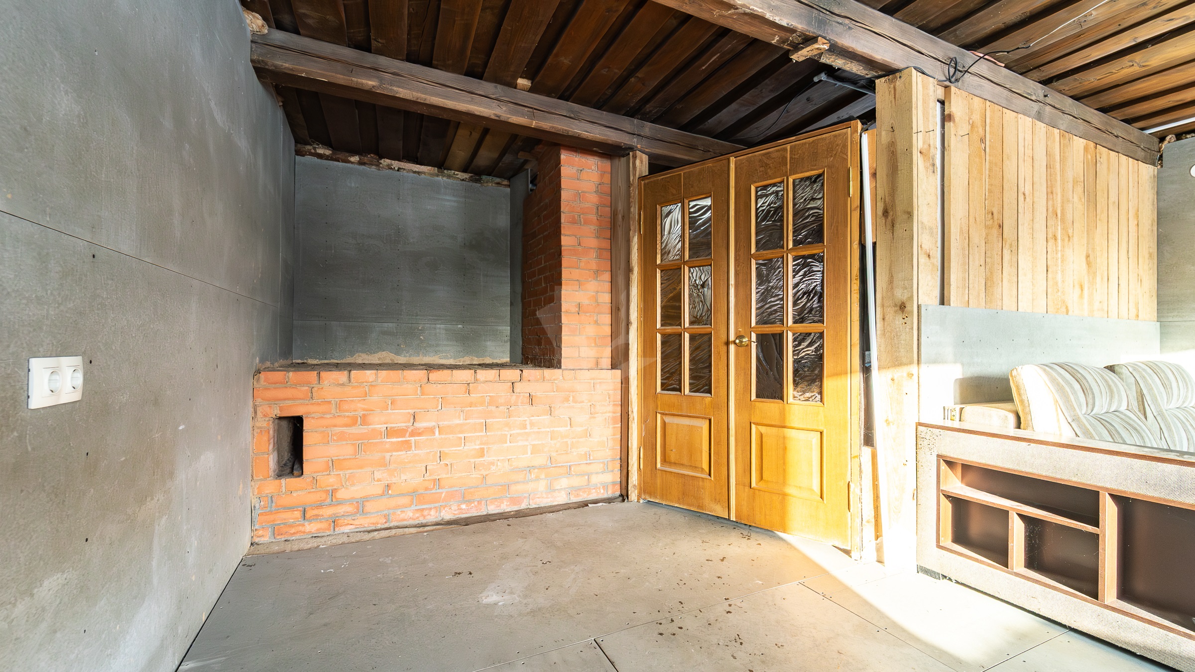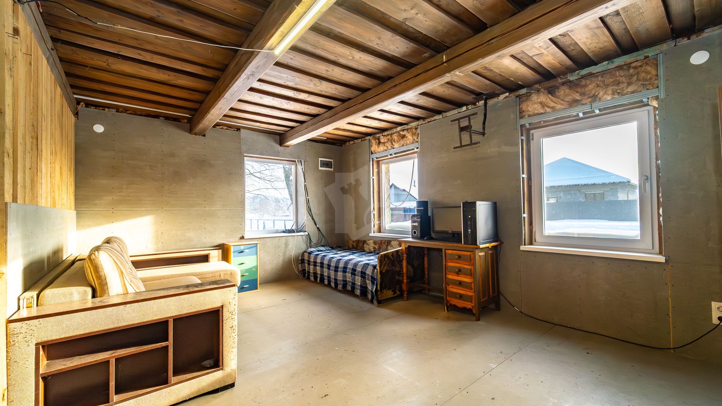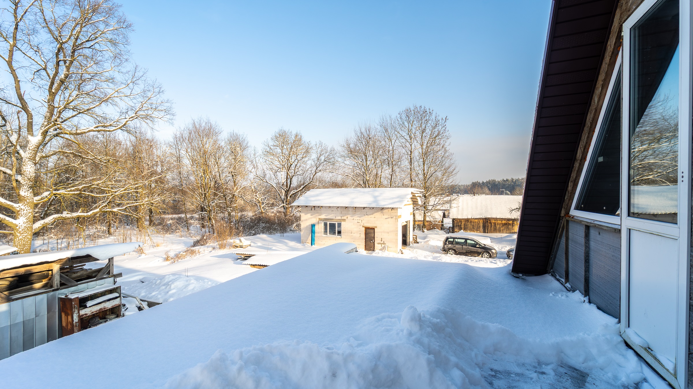 Деревянный, утеплённый, обшитый. Все окна — ПВХ. А главное — тёплая пристройка с отдельным санузлом и тёплыми полами. Приехал с грязью из гаража? Неси её прямо в душ, минуя чистые комнаты. Гениально же!