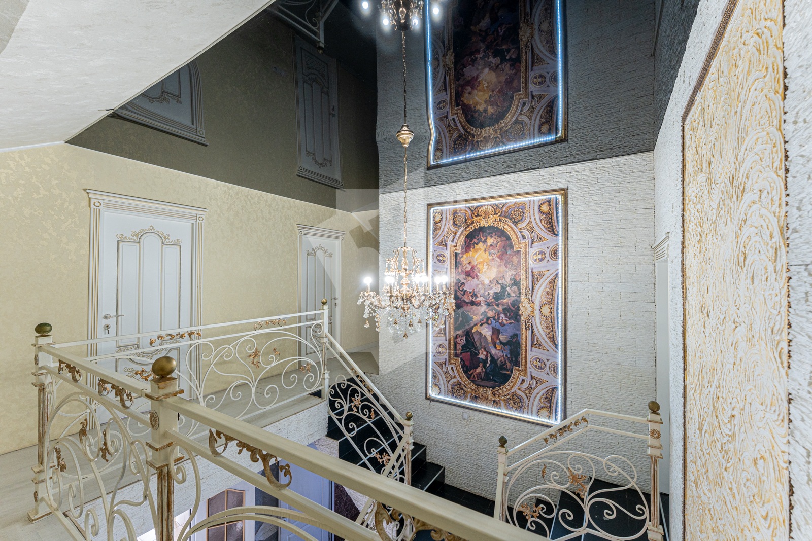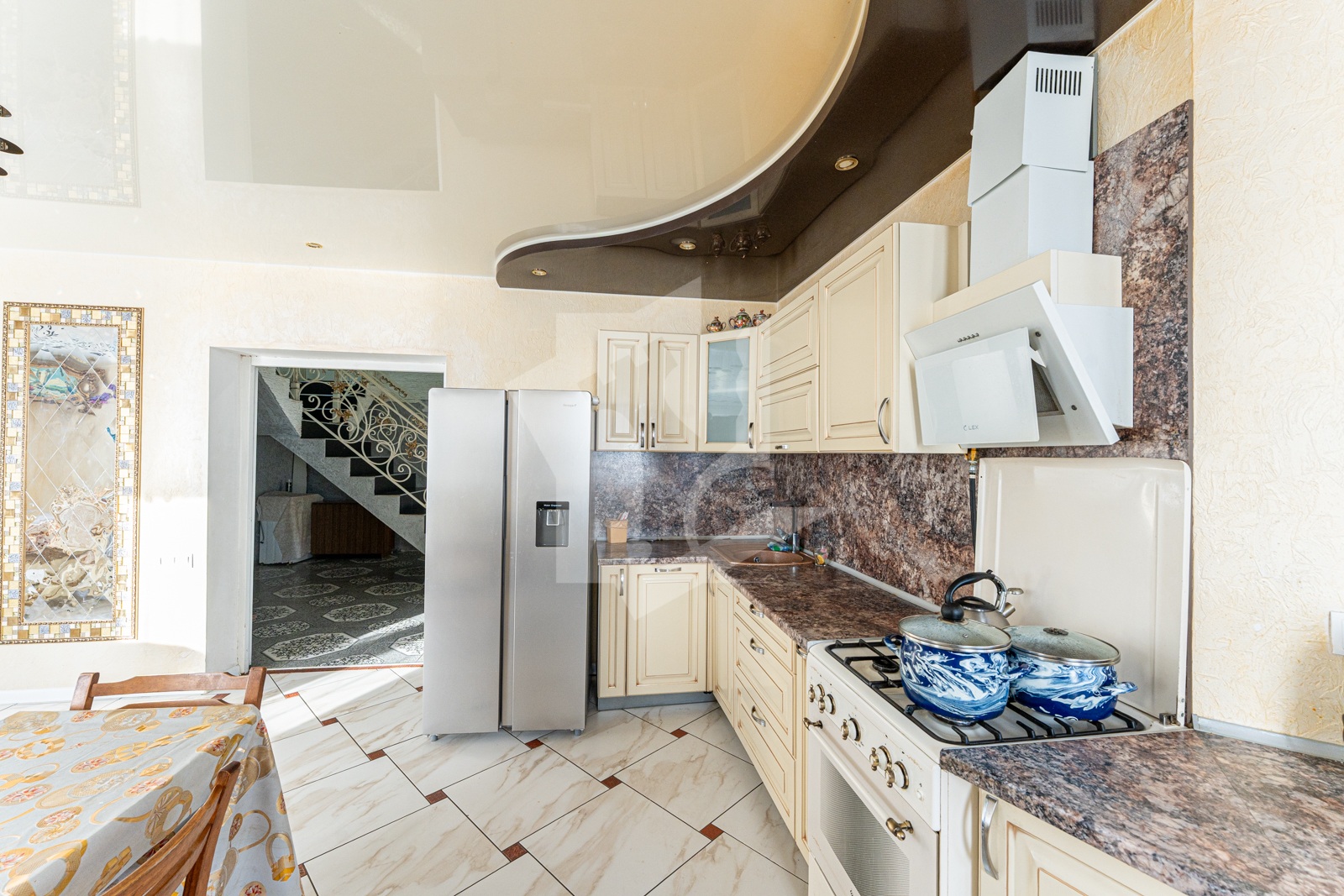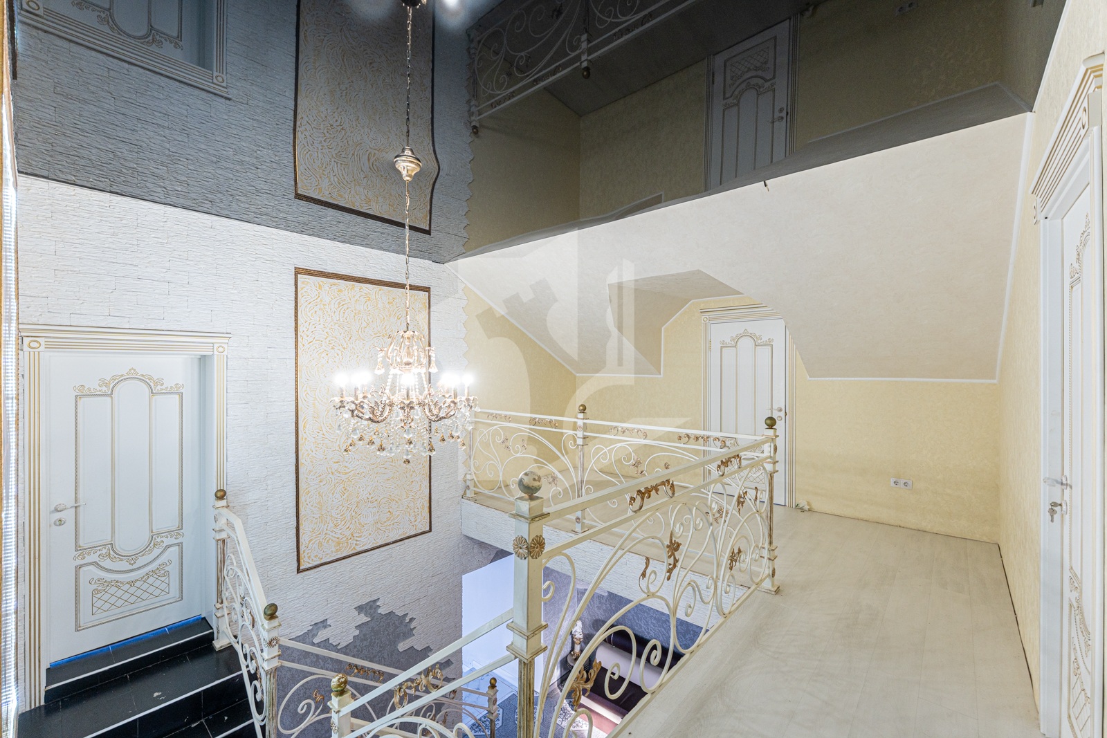 Выполнен хороший ремонт с приятными акцентами в интерьере и кованной лестницей, которая ведет на второй этаж. Ее изысканное оформление добавляет неповторимости этому дому и создает элегантную атмосферу. Установлены стеклопакеты (ПВХ), напольные покрытия: кафель.
