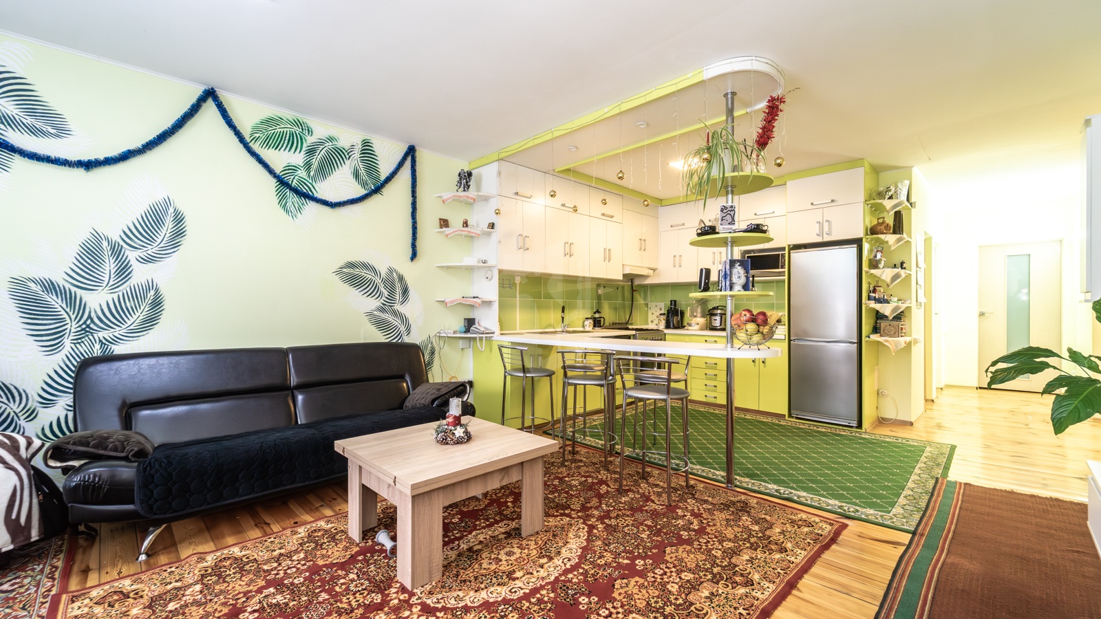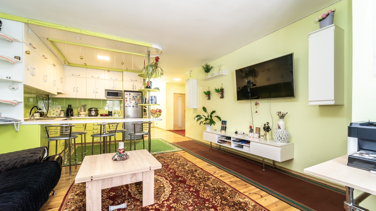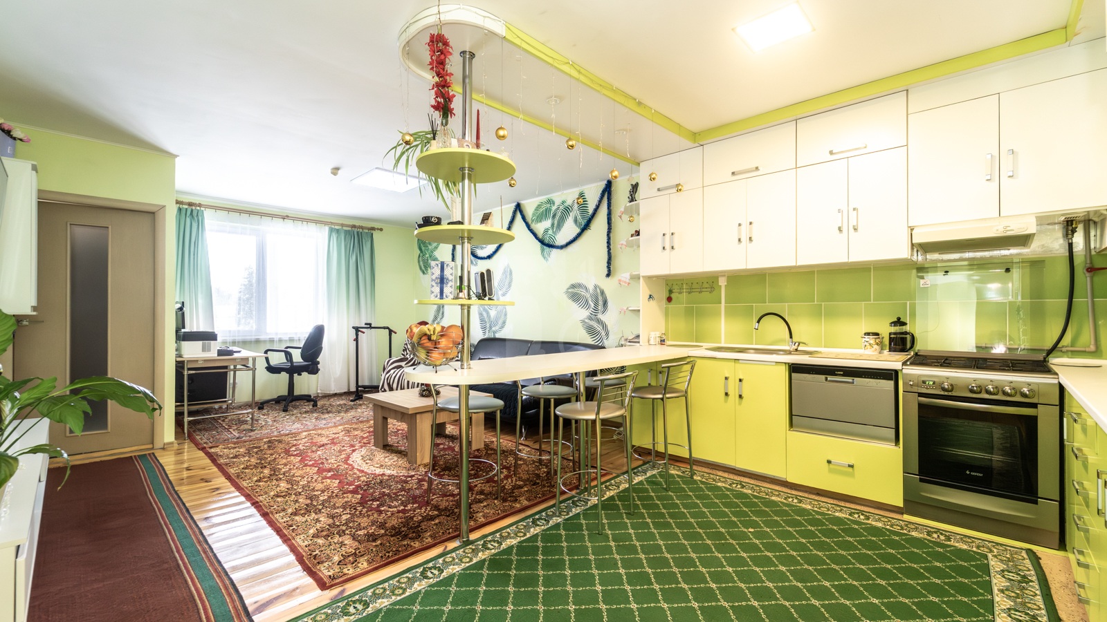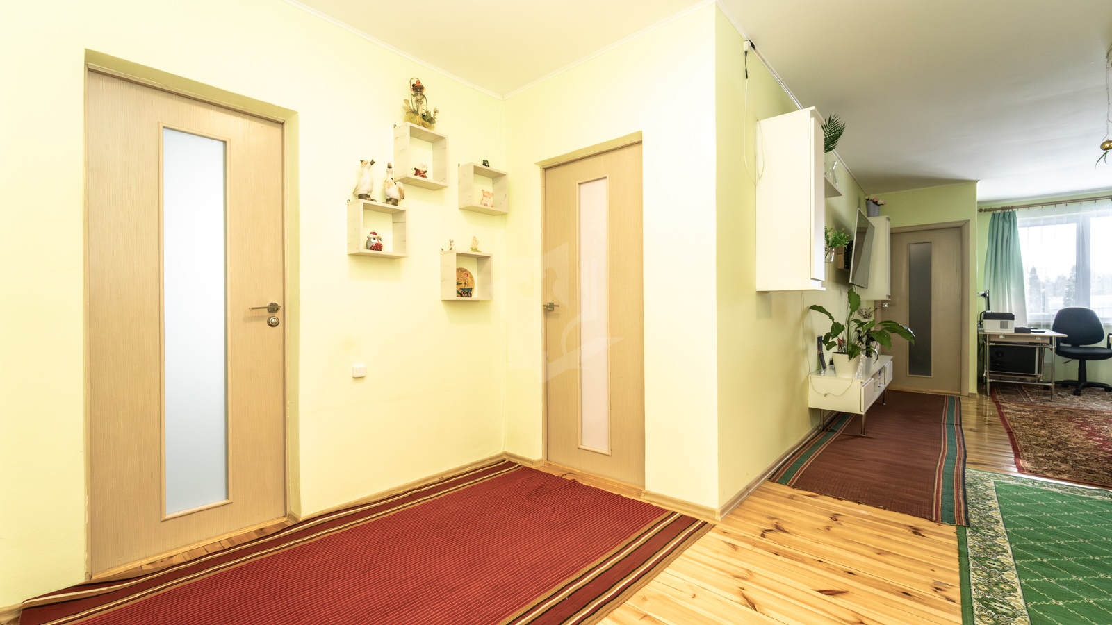 Первый этаж состоит из гостиной-кухни (30,1 м2) со всей необходимой бытовой техникой, трех жилых комнат (17,6 м2, 13,7 м2, 10 м2), двух санузлов (4,6 м2, 4 м2) и кладовой (3,5 м2).