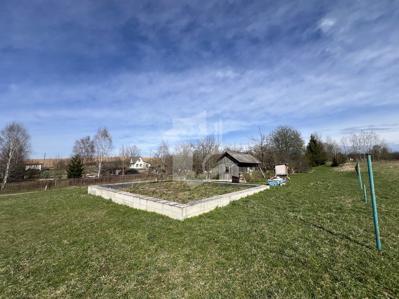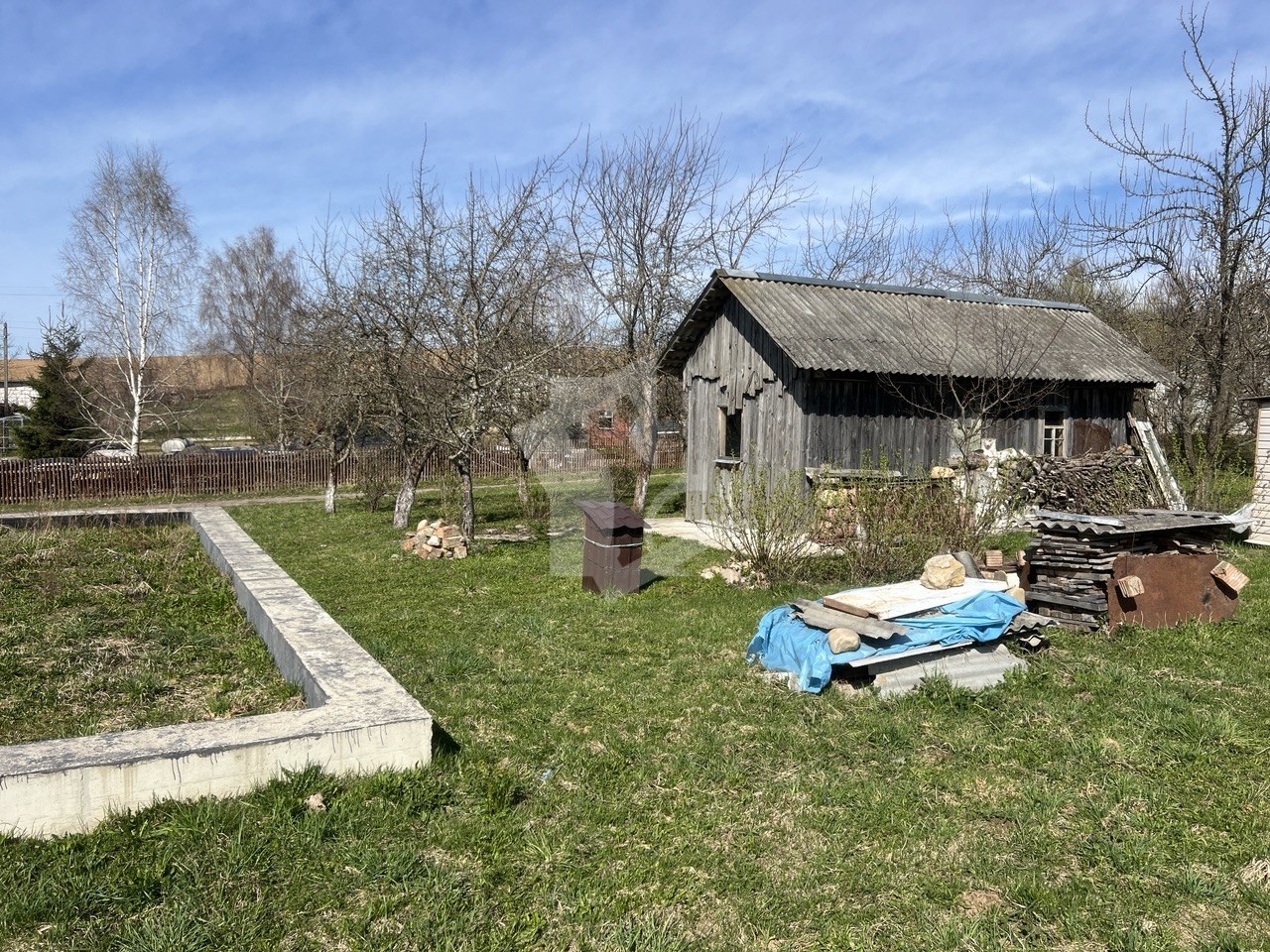 Участок правильной прямоугольной формы, фундамент размером 9*10.5м., на участке расположен хоз.блок для хранения инструмента на время стройки, колодец глубиной в 42метра. На участке растут плодовые деревья.