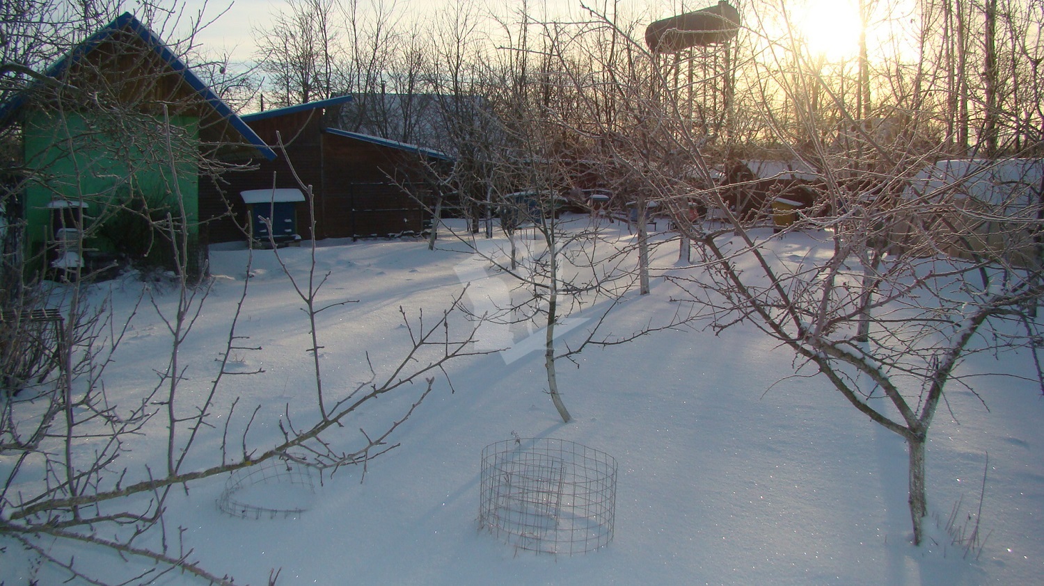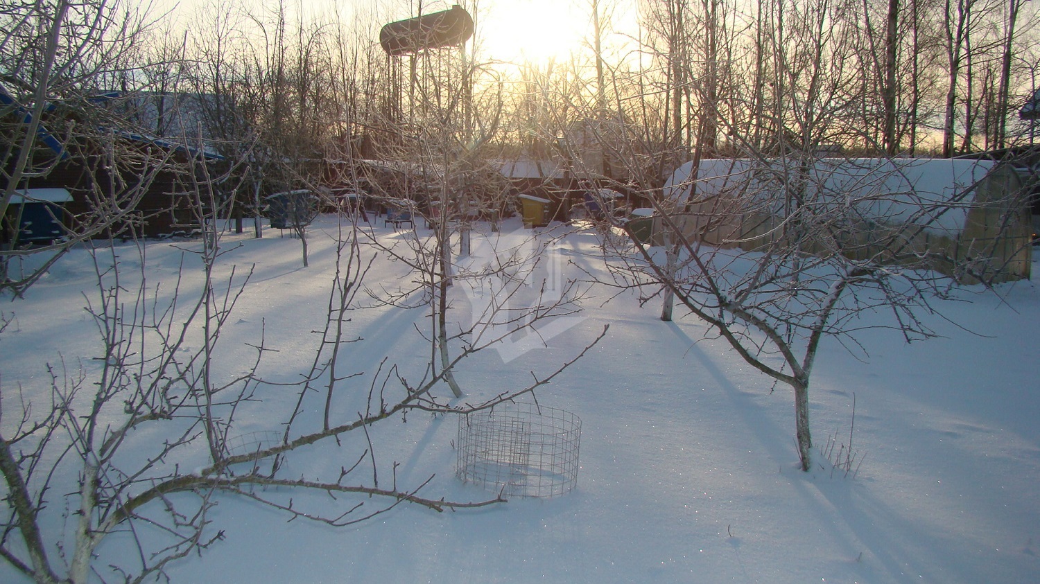 На участке сарай, проходит сезонная вода, есть сад с плодовыми деревьями, теплица и огород.