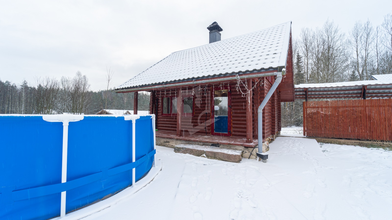 - У входа — отмостка/площадка, уличное освещение, крытая дровница.