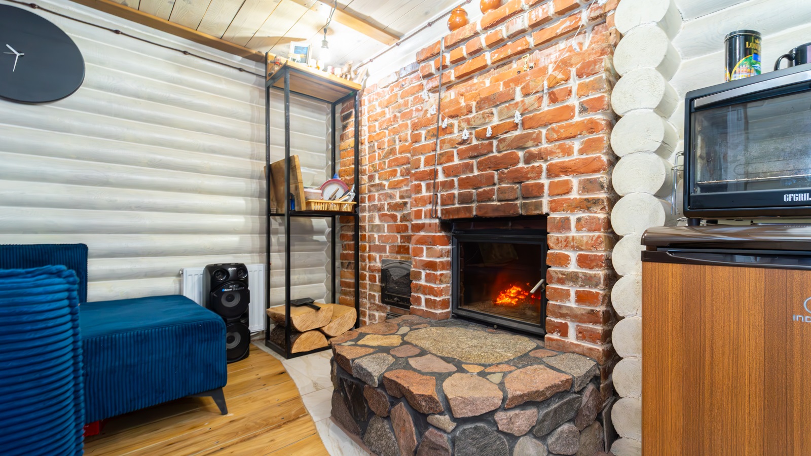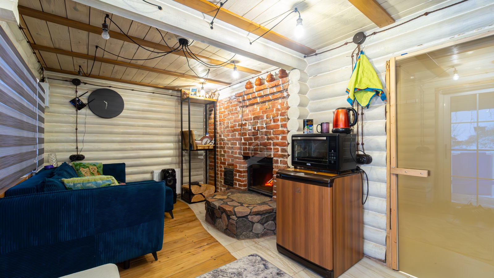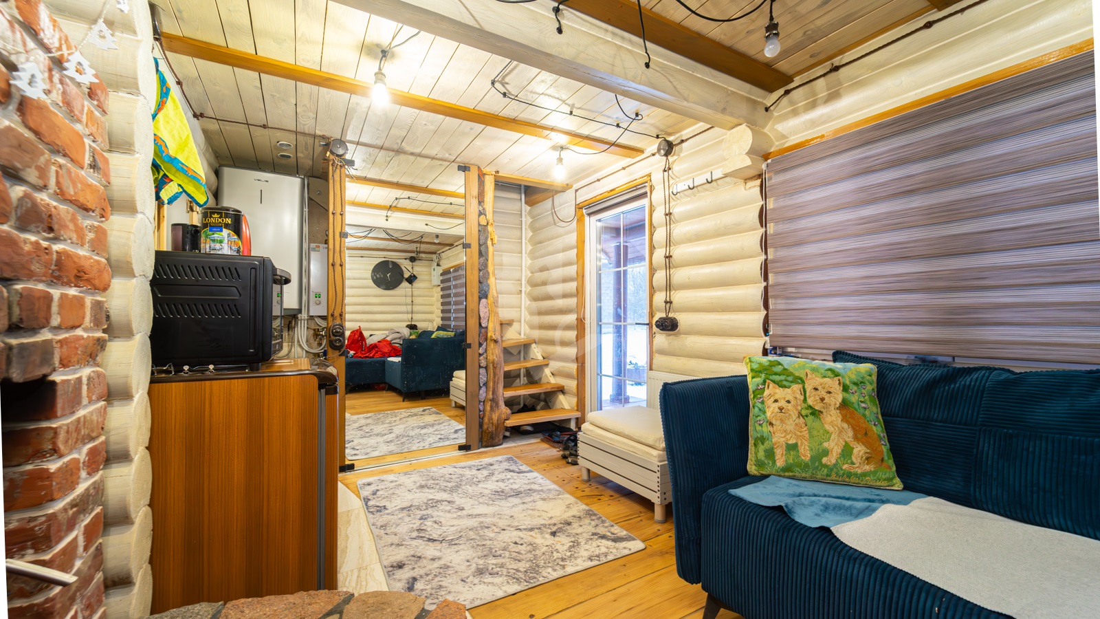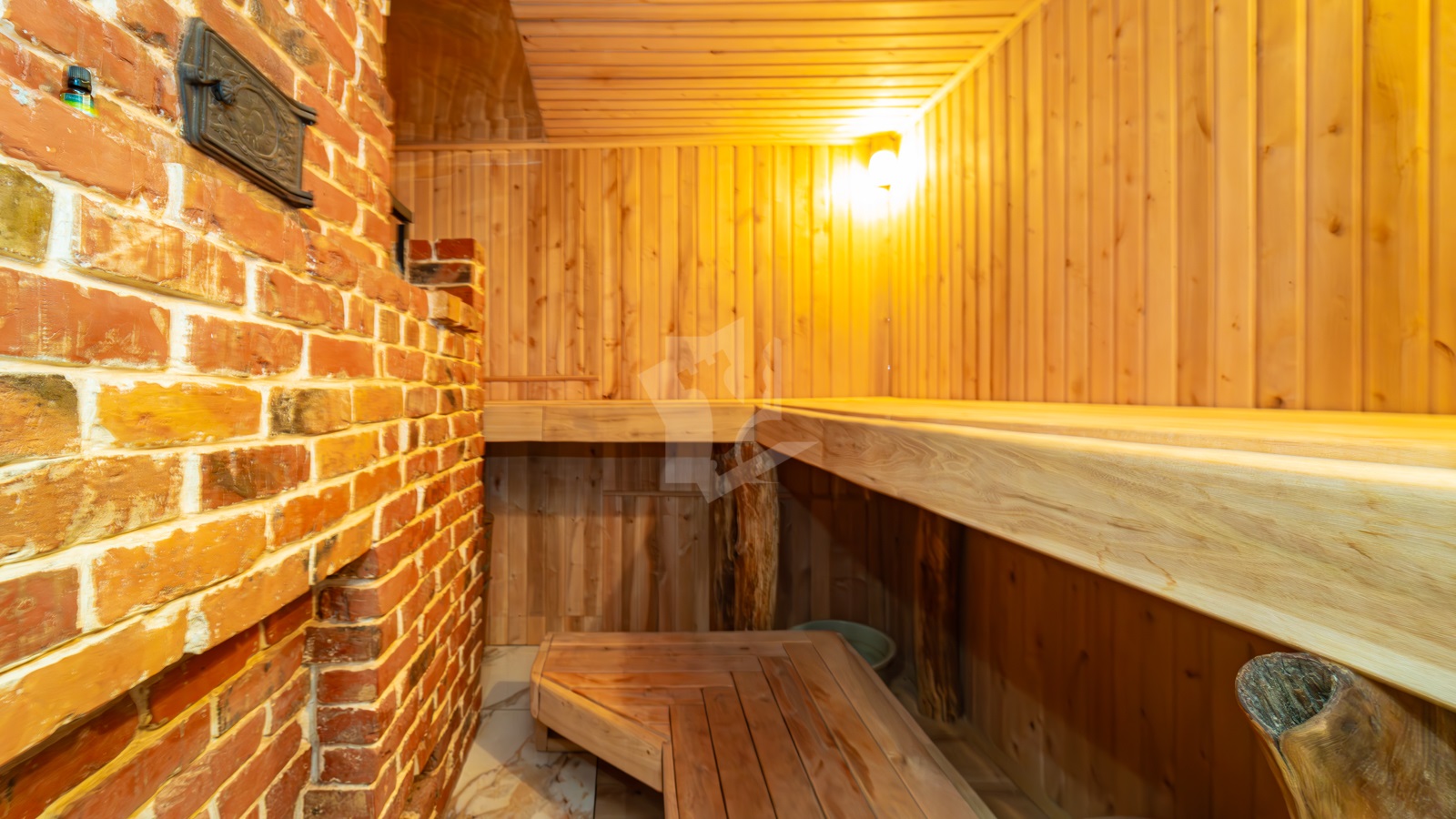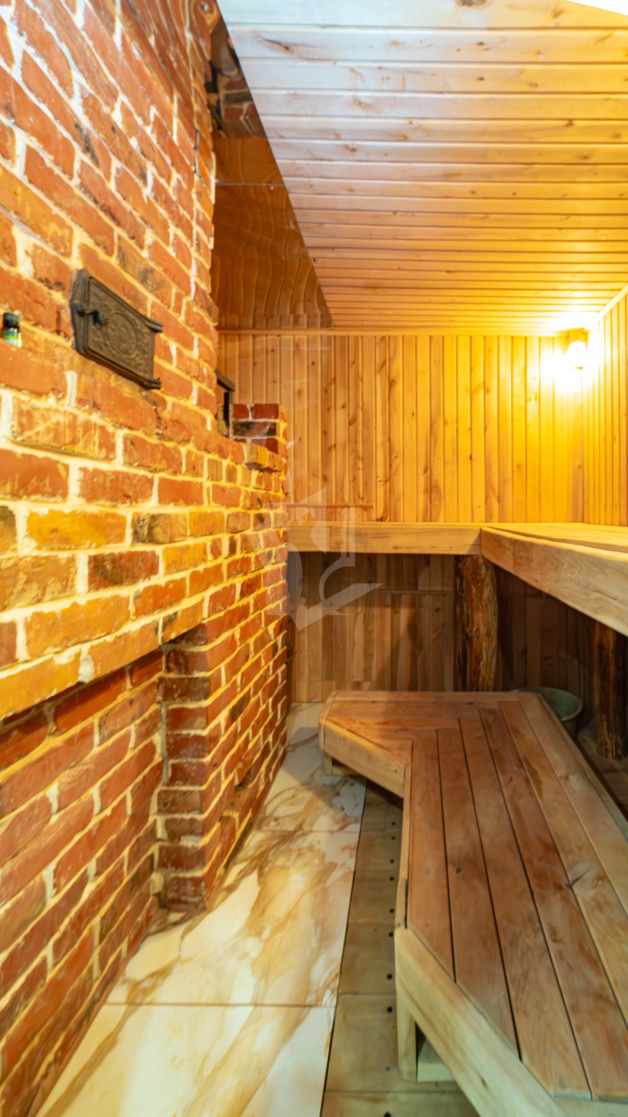 - Внутреннее устройство: печь для парной, камин из красного кирпича, комбинированные полы (дуб + керамогранит), дубовая лестница.