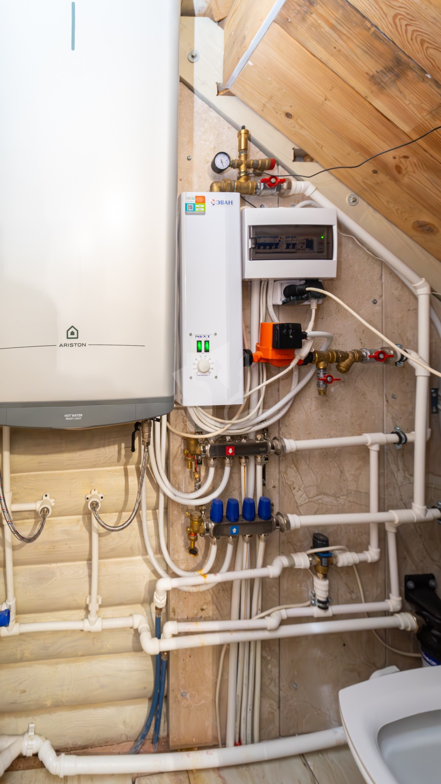 - Отопление — электрический котёл с GSM модулем и возможностью программирования через телефон; бойлер для подогрева воды.