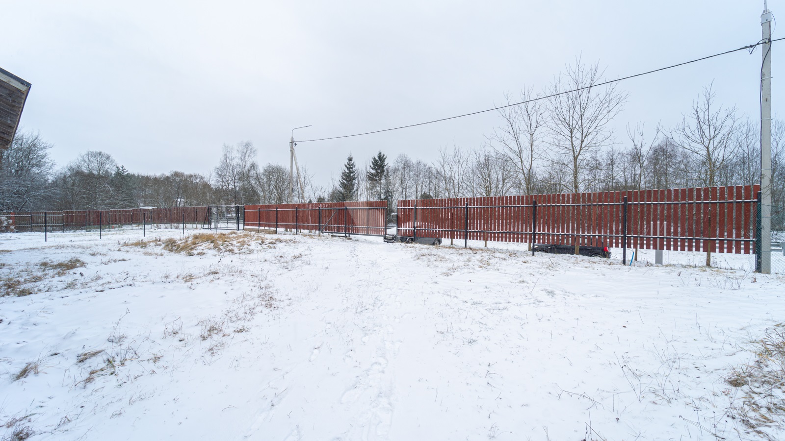 - Откатные ворота с выведённым кабелем под электропривод; рядом выведён кабель под освещение.