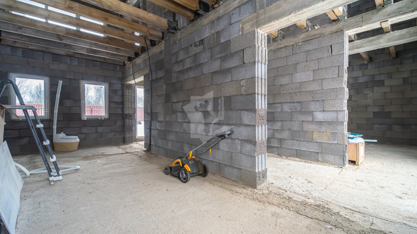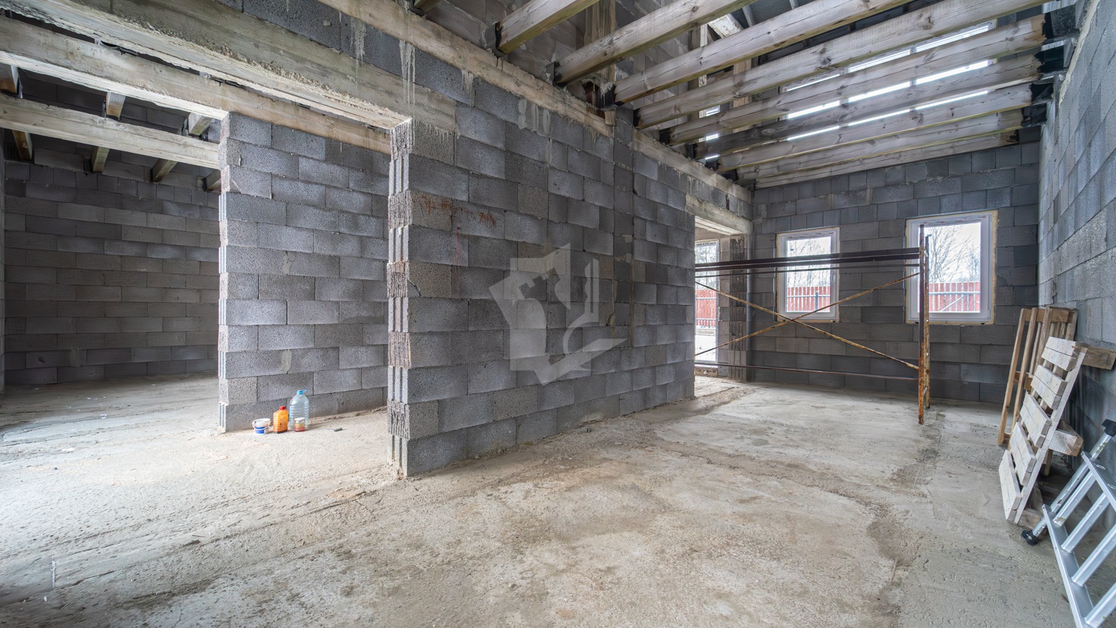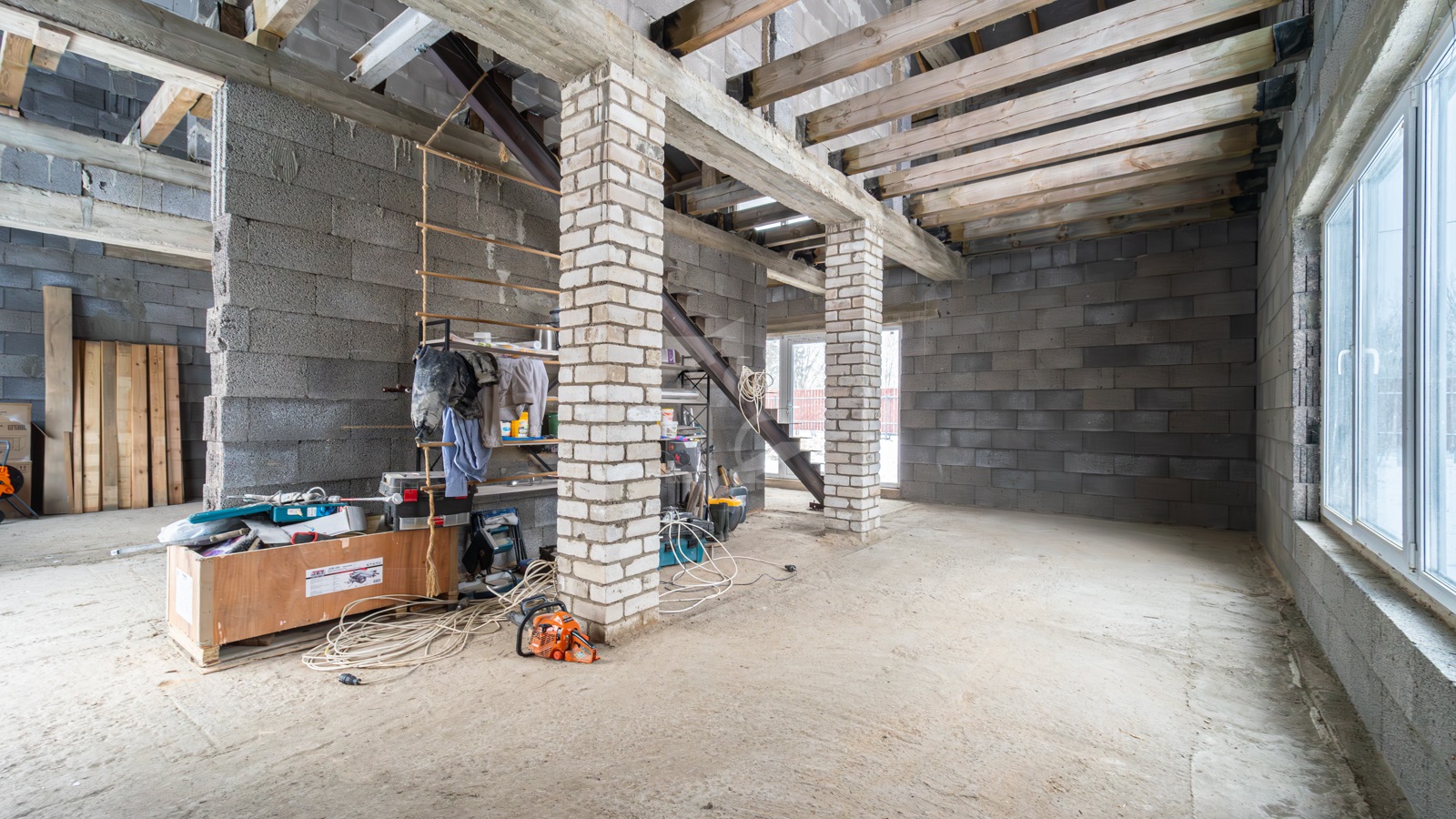 - Полы 1-го этажа — черновой бетон; в одной половине установлен металлический каркас лестницы.