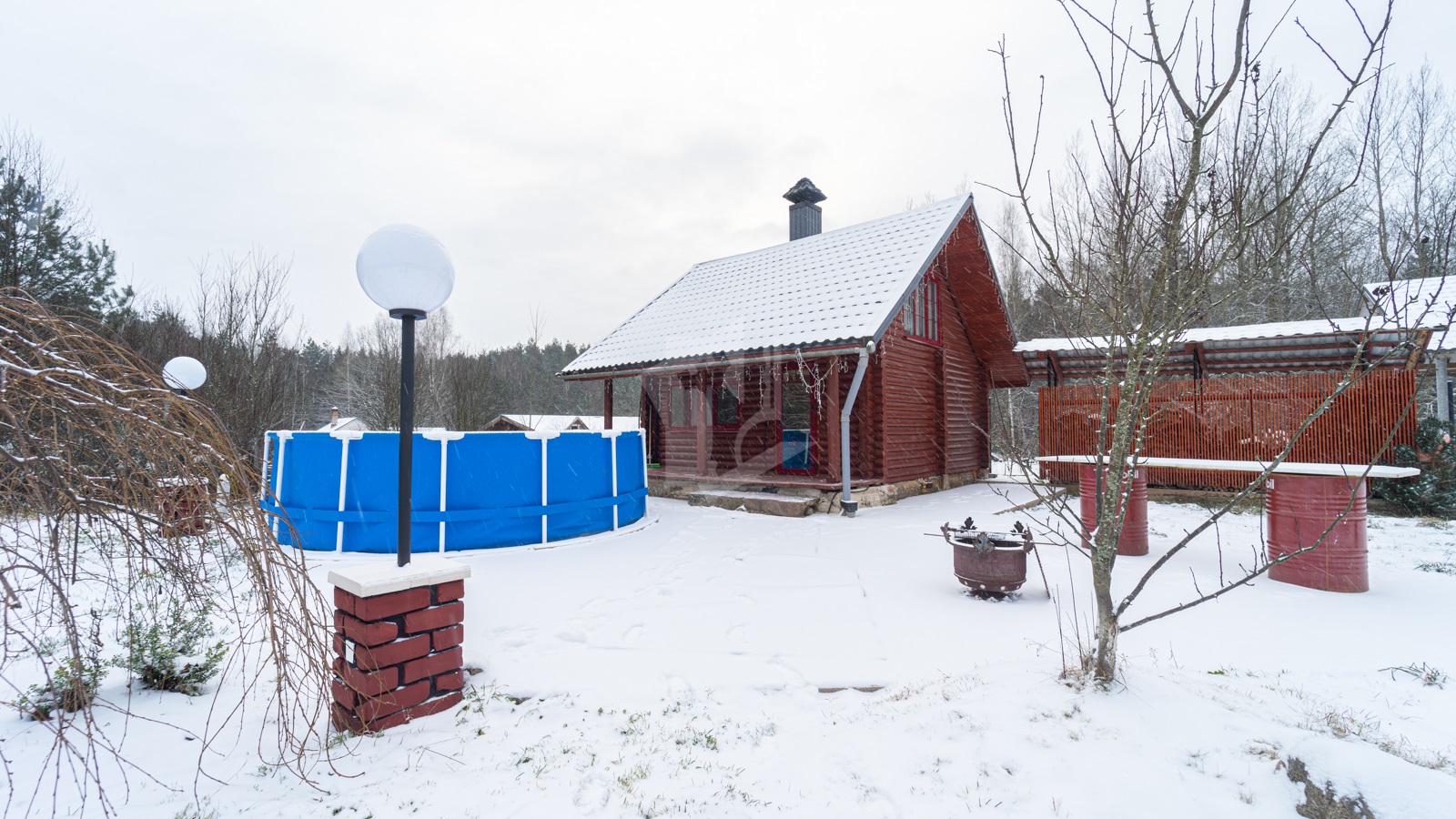 - Постройка из оцилиндрованного брёвен Ø18 см; фундамент — свайный бетонный.