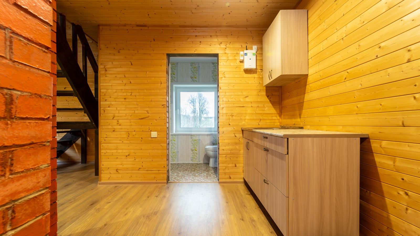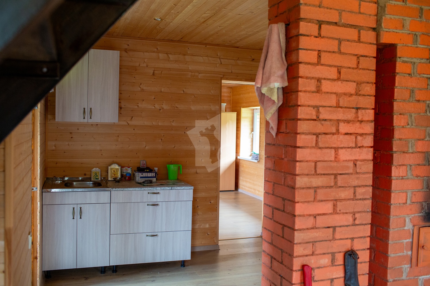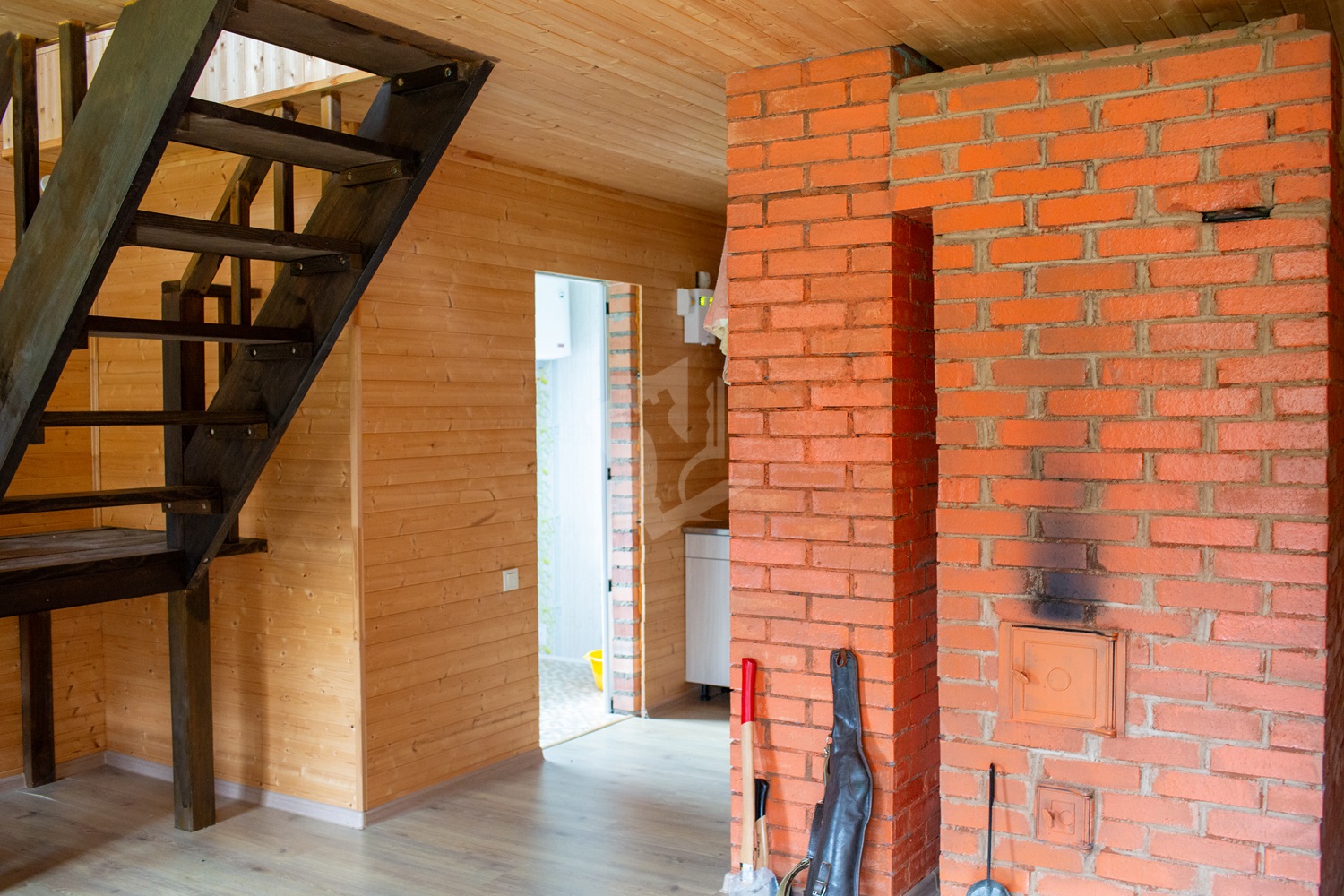 Второй этаж полностью готов для проживания, представляет собой две разделенные комнаты площадью 22,4 м2 и 25,4 м2. Здесь же имеется кухня, печь, завершенный санузел (3,5 м2) с унитазом, умывальником, бойлером для горячей воды и подготовленным местом для установки душевой кабины; на полу уложен ламинат.