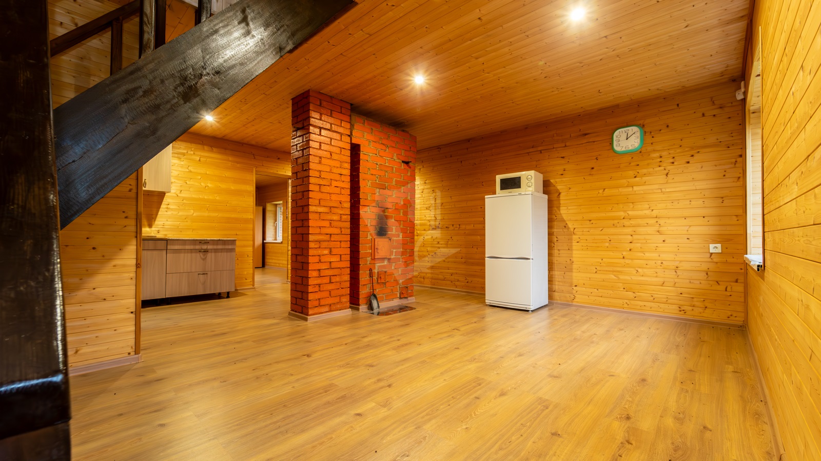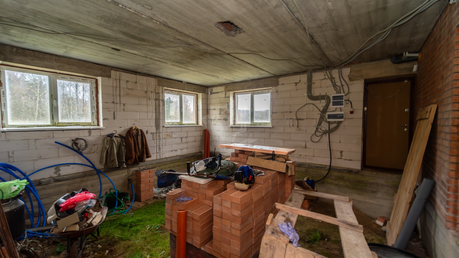 Первый этаж без внутренней отделки, по проекту представлен как гостиная, площадью 30,2 м2, и разделённые кухня (17,7 м2), и санузел (5,4 м2), по всему первому этажу разведено электричество и водоснабжение.