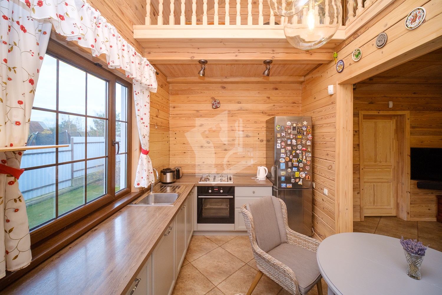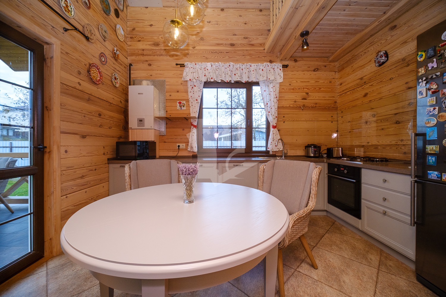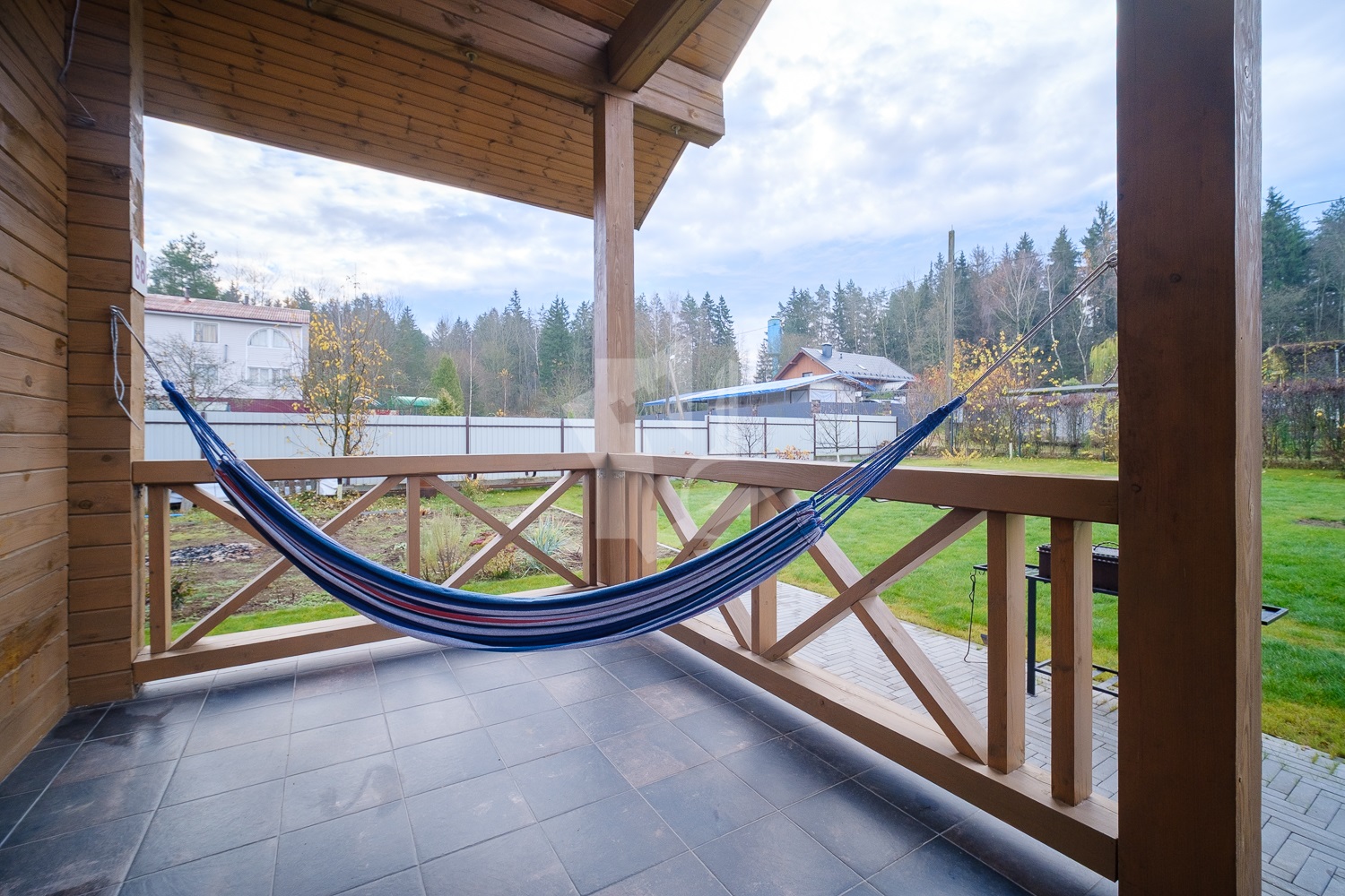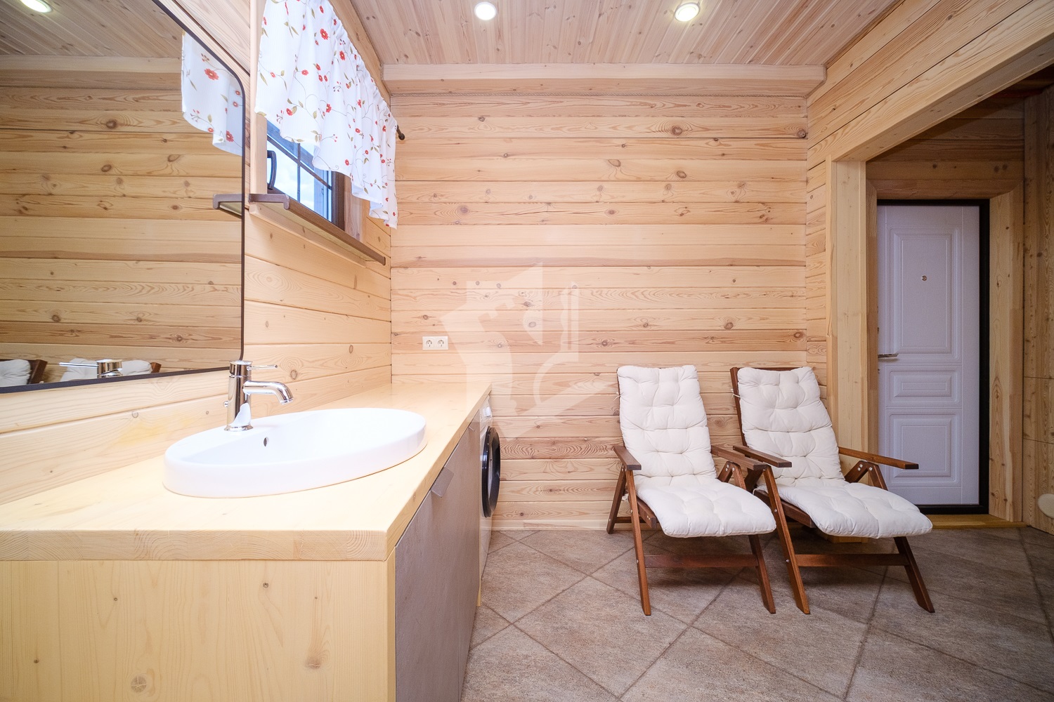 В доме выполнен качественный дизайнерский ремонт, пространство полностью зонировано. Есть кухня-столовая, оборудованная всей необходимой бытовой техникой европейских производителей. Гостиная со вторым светом и очень теплой атмосферой. Просторная терраса с великолепным видом, спальная комната и большой сан. узел. На первом этаже есть сауна с комнатой отдыха, душем и выходом на задний дворик. На втором этаже расположена просторная спальня, комната отдыха («качелешная») с видом на участок, сан. узел и кладовые.