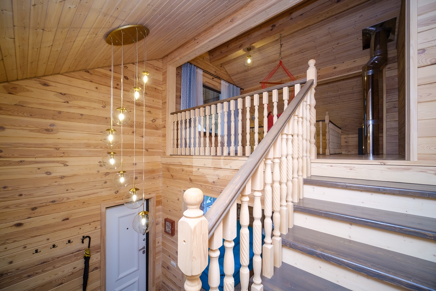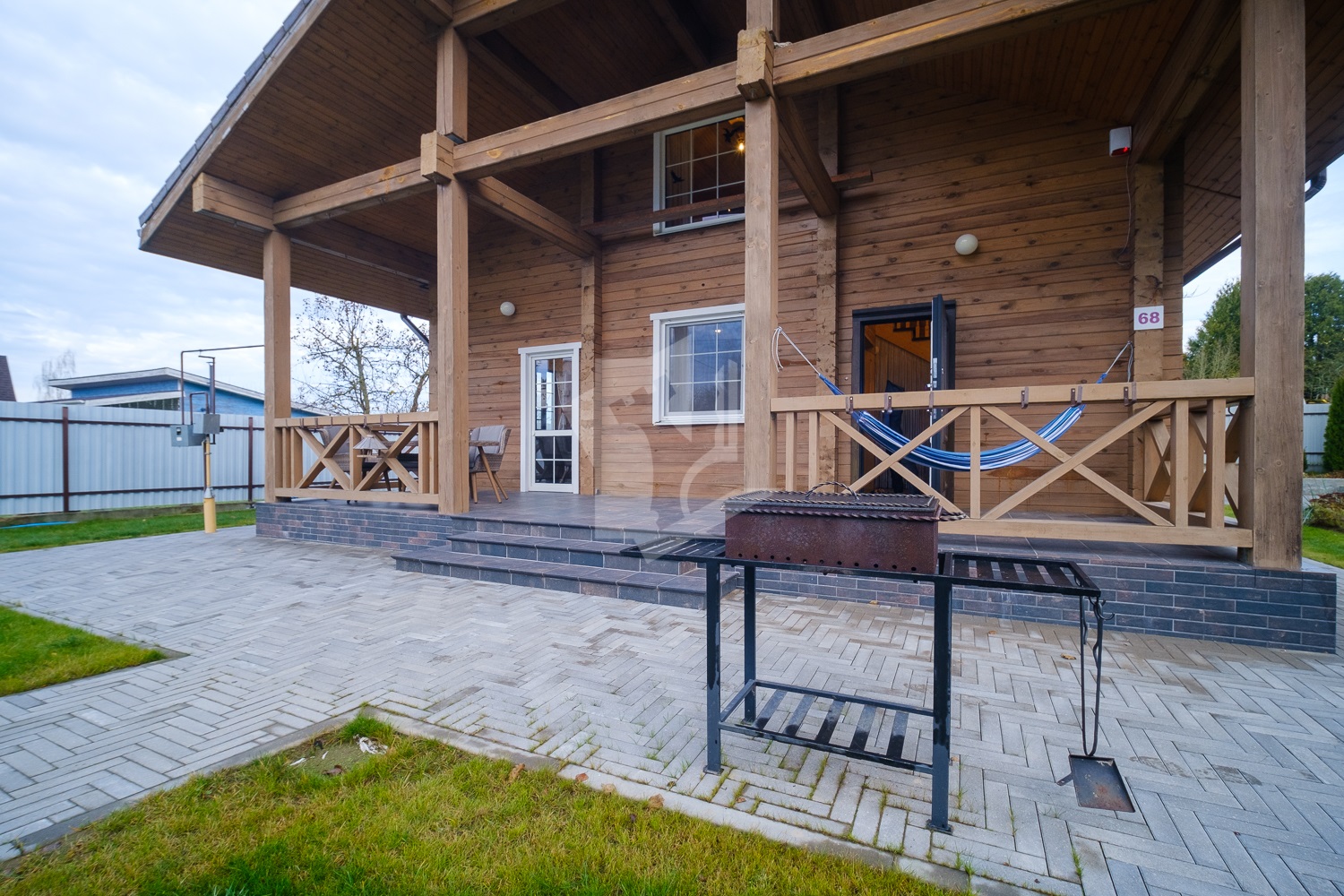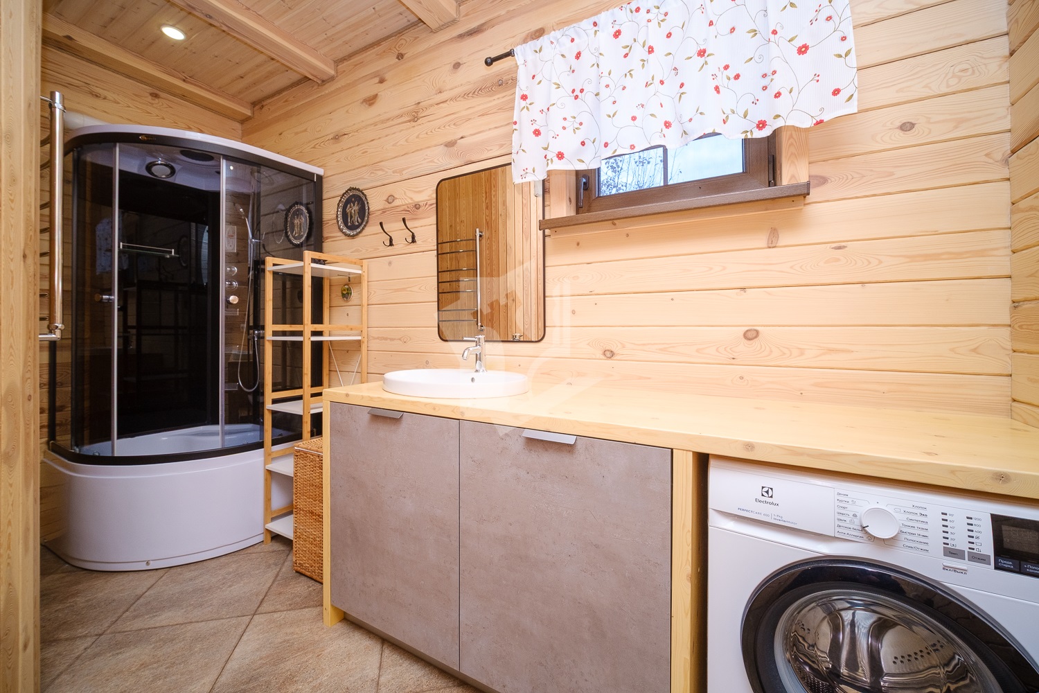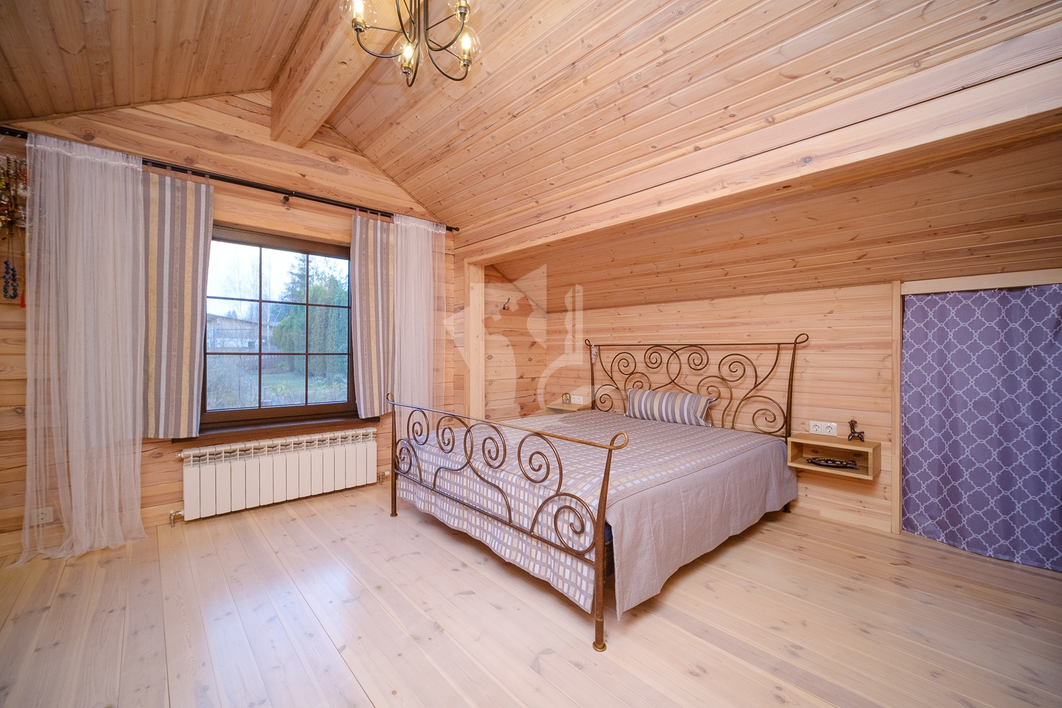 В доме выполнен качественный дизайнерский ремонт, пространство полностью зонировано. Есть кухня-столовая, оборудованная всей необходимой бытовой техникой европейских производителей. Гостиная со вторым светом и очень теплой атмосферой. Просторная терраса с великолепным видом, спальная комната и большой сан. узел. На первом этаже есть сауна с комнатой отдыха, душем и выходом на задний дворик. На втором этаже расположена просторная спальня, комната отдыха («качелешная») с видом на участок, сан. узел и кладовые.