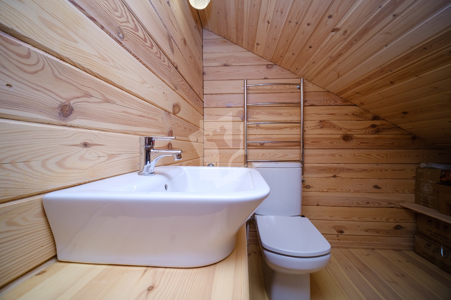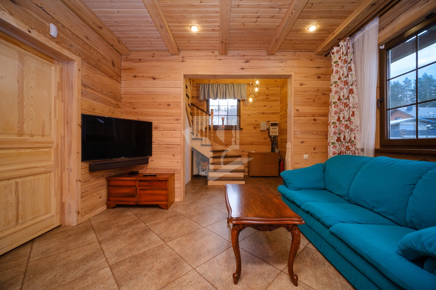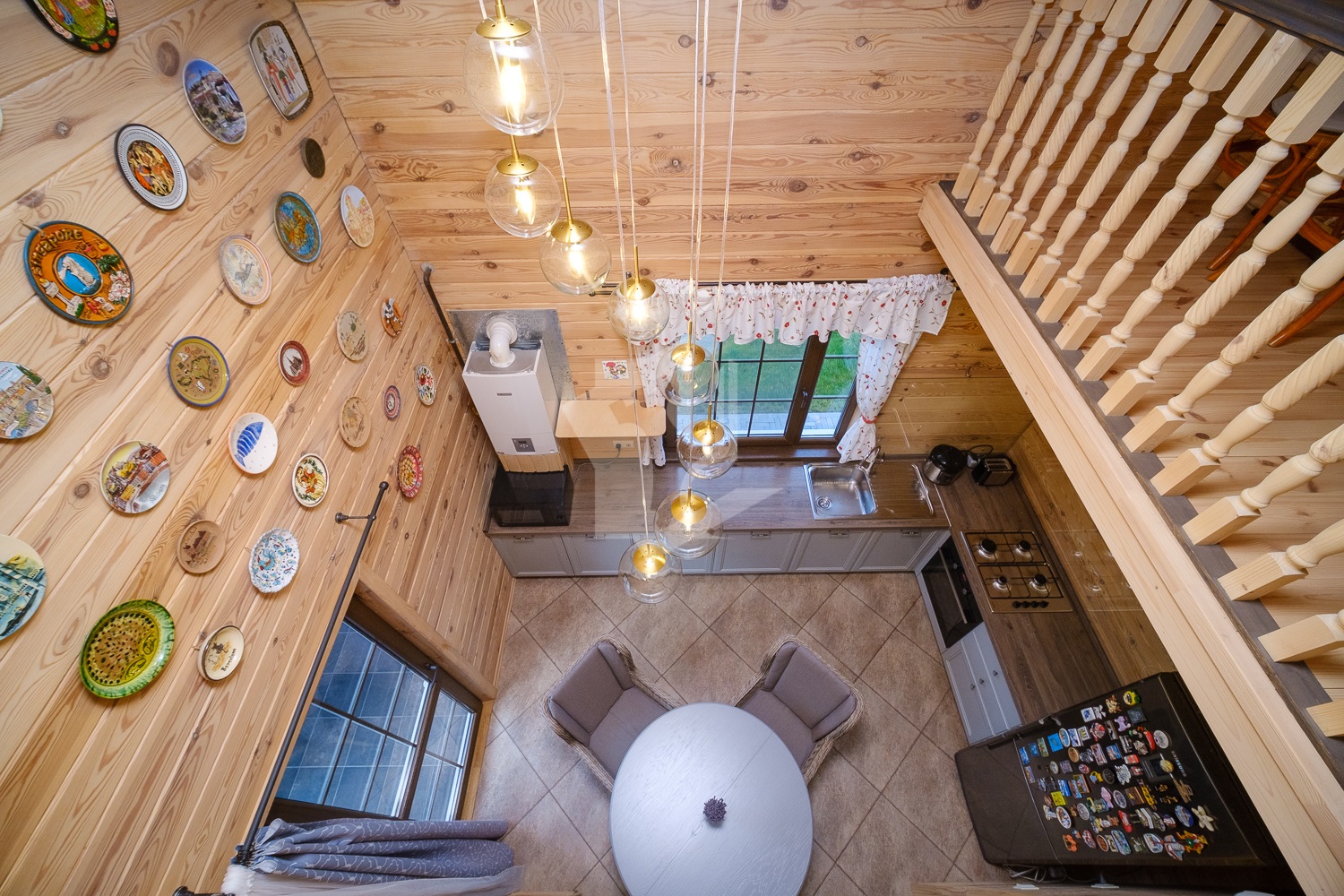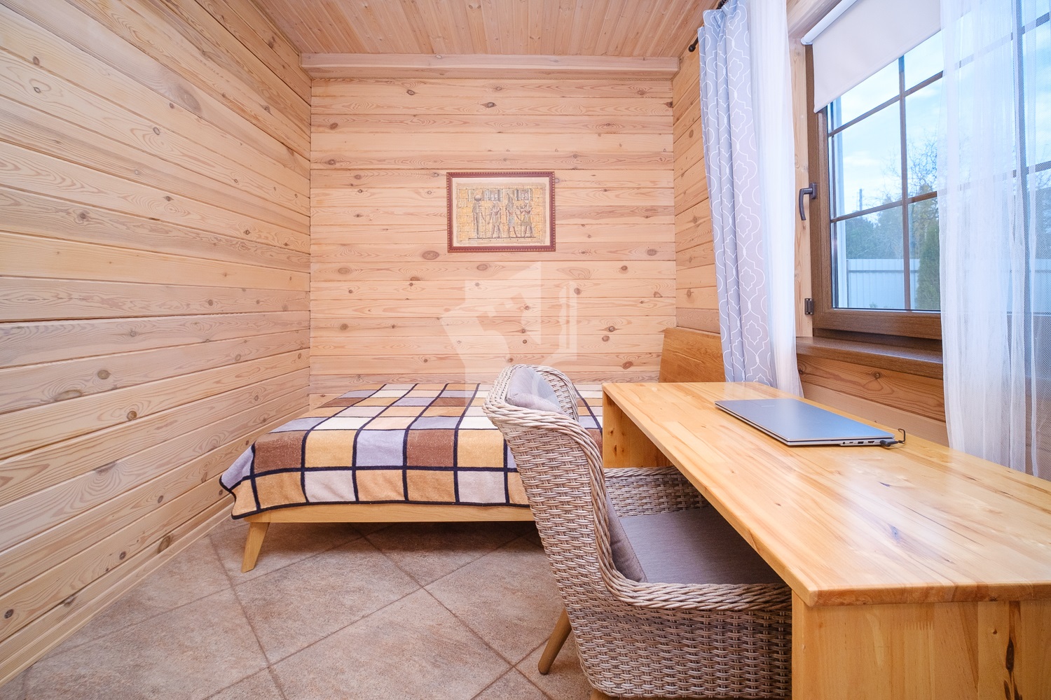 В доме выполнен качественный дизайнерский ремонт, пространство полностью зонировано. Есть кухня-столовая, оборудованная всей необходимой бытовой техникой европейских производителей. Гостиная со вторым светом и очень теплой атмосферой. Просторная терраса с великолепным видом, спальная комната и большой сан. узел. На первом этаже есть сауна с комнатой отдыха, душем и выходом на задний дворик. На втором этаже расположена просторная спальня, комната отдыха («качелешная») с видом на участок, сан. узел и кладовые.