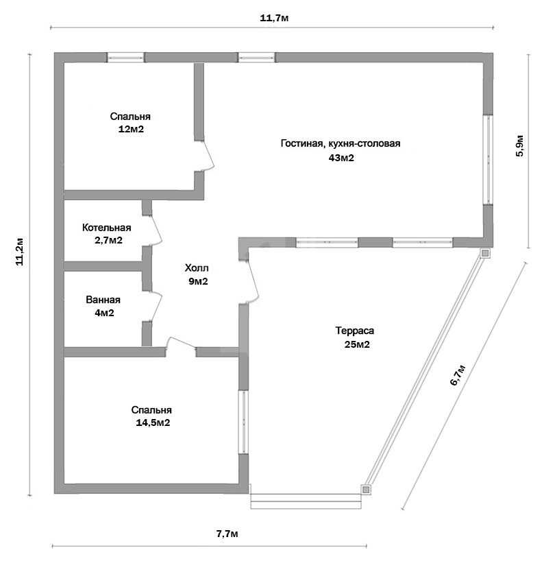 Минималистичное дизайнерское решение с панорамным остеклением создаёт ощущение простора и света. Гостиная зона плавно перетекает в кухню-столовую, а спальни спроектированы для максимального уединения и отдыха.