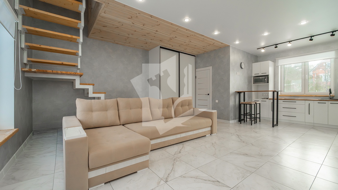Радость общения: Просторная гостиная с кухней, расположенная на первом этаже, приглашает собраться вместе за чашечкой чая, обсудить семейные дела и поделиться теплом своего сердца.