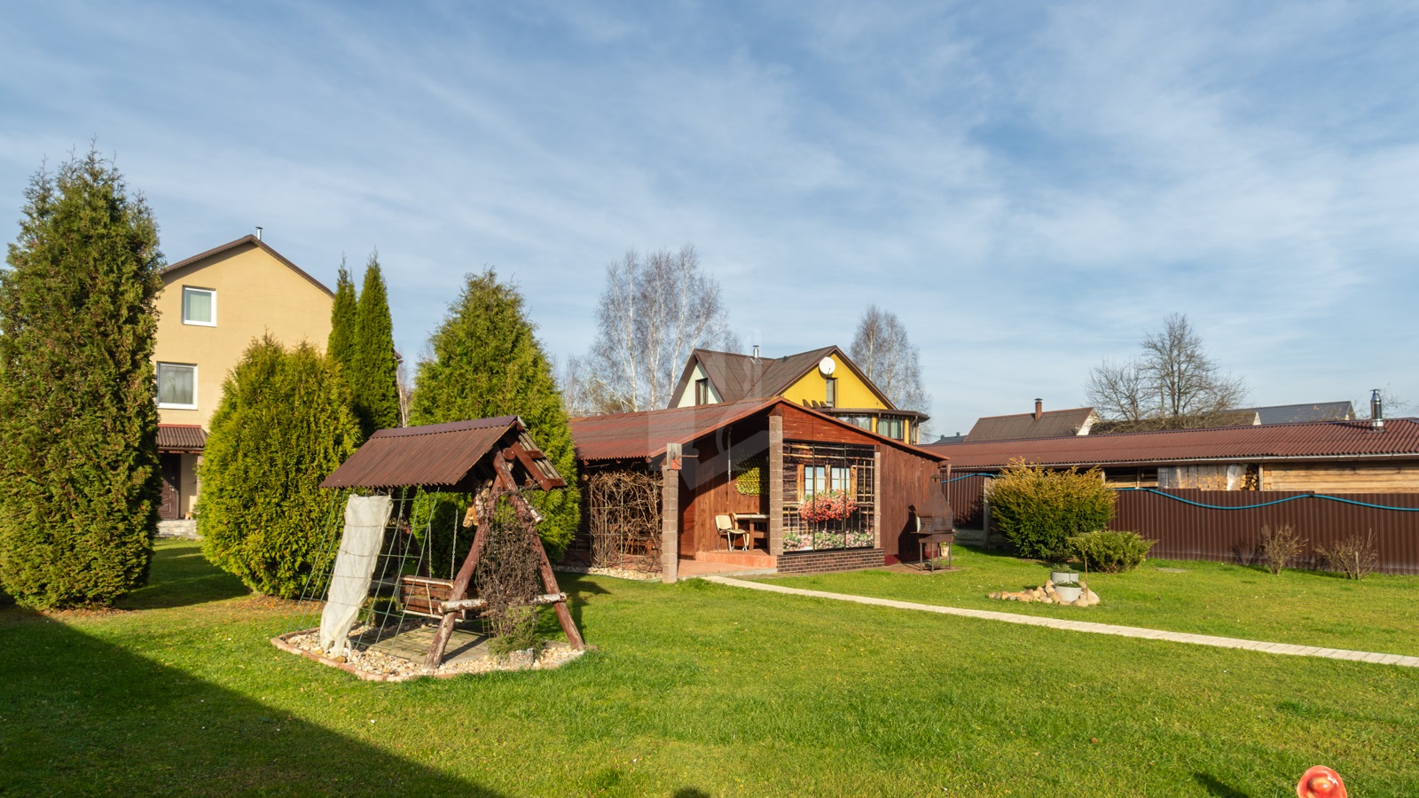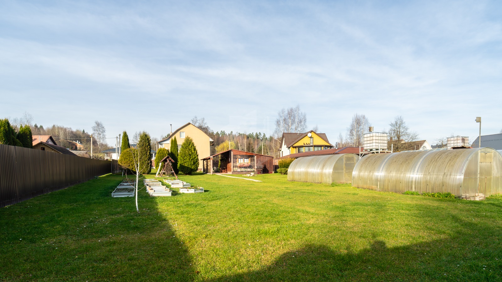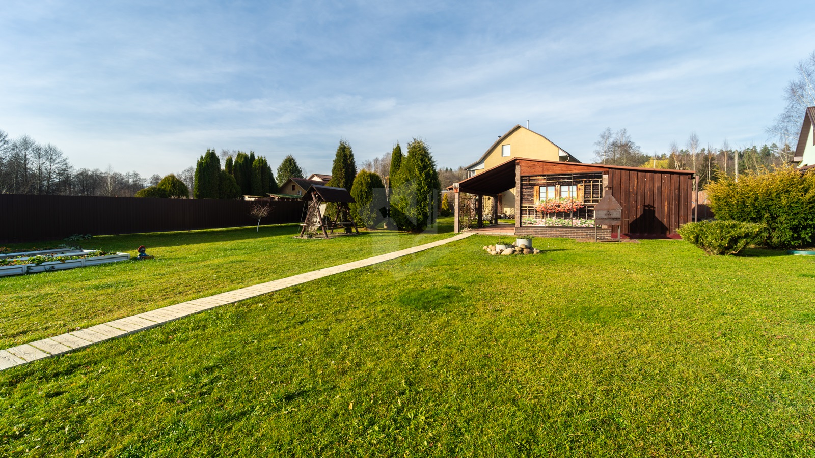- Участок, огороженный забором, просторный, ровной прямоугольной формы – 10 соток для обслуживания жилого дома и 10 соток для сада и огородничества. По всему участку отличный ухоженный газон с цветниками и хвойными растениями.