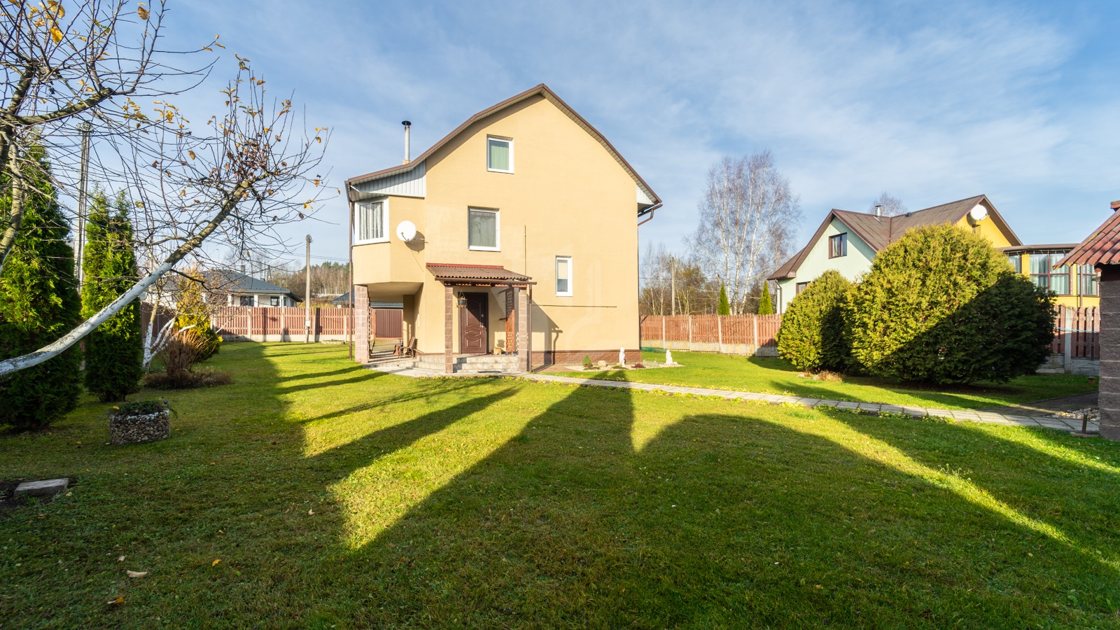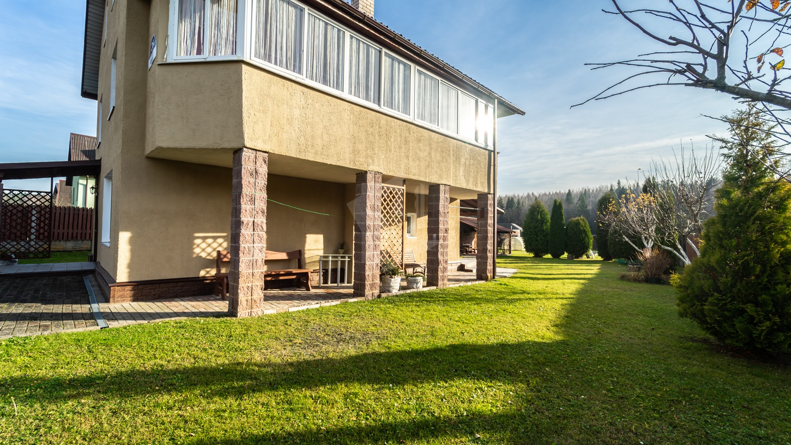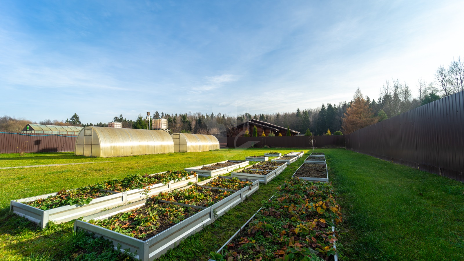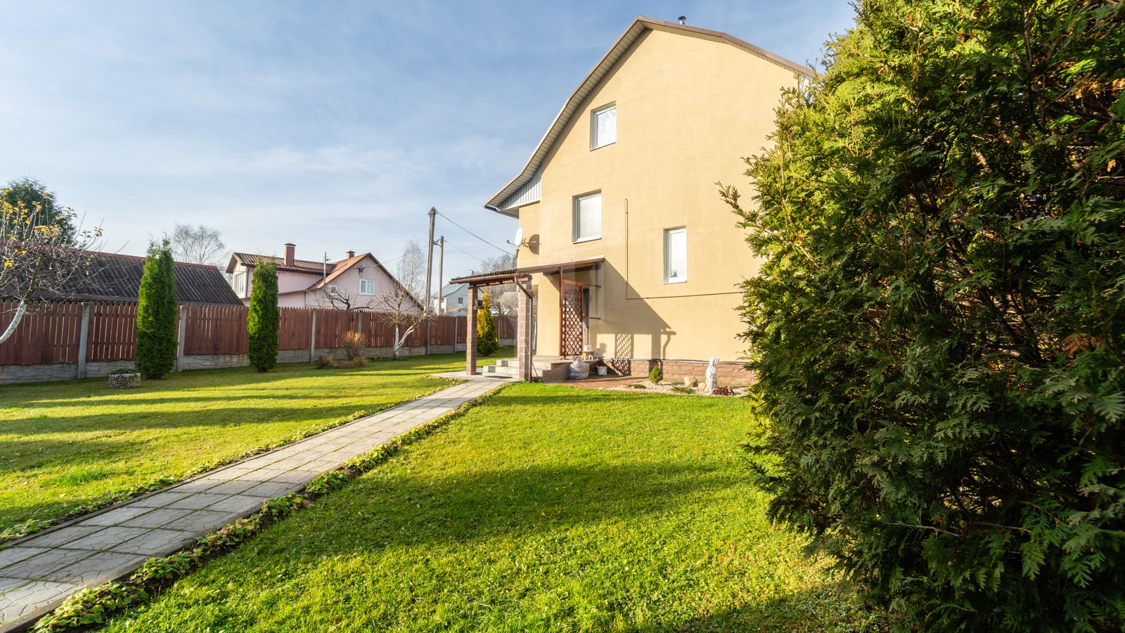 - Участок, огороженный забором, просторный, ровной прямоугольной формы – 10 соток для обслуживания жилого дома и 10 соток для сада и огородничества. По всему участку отличный ухоженный газон с цветниками и хвойными растениями.