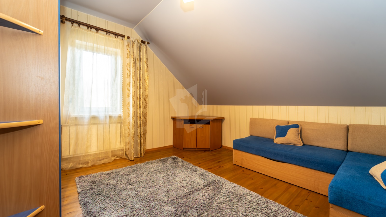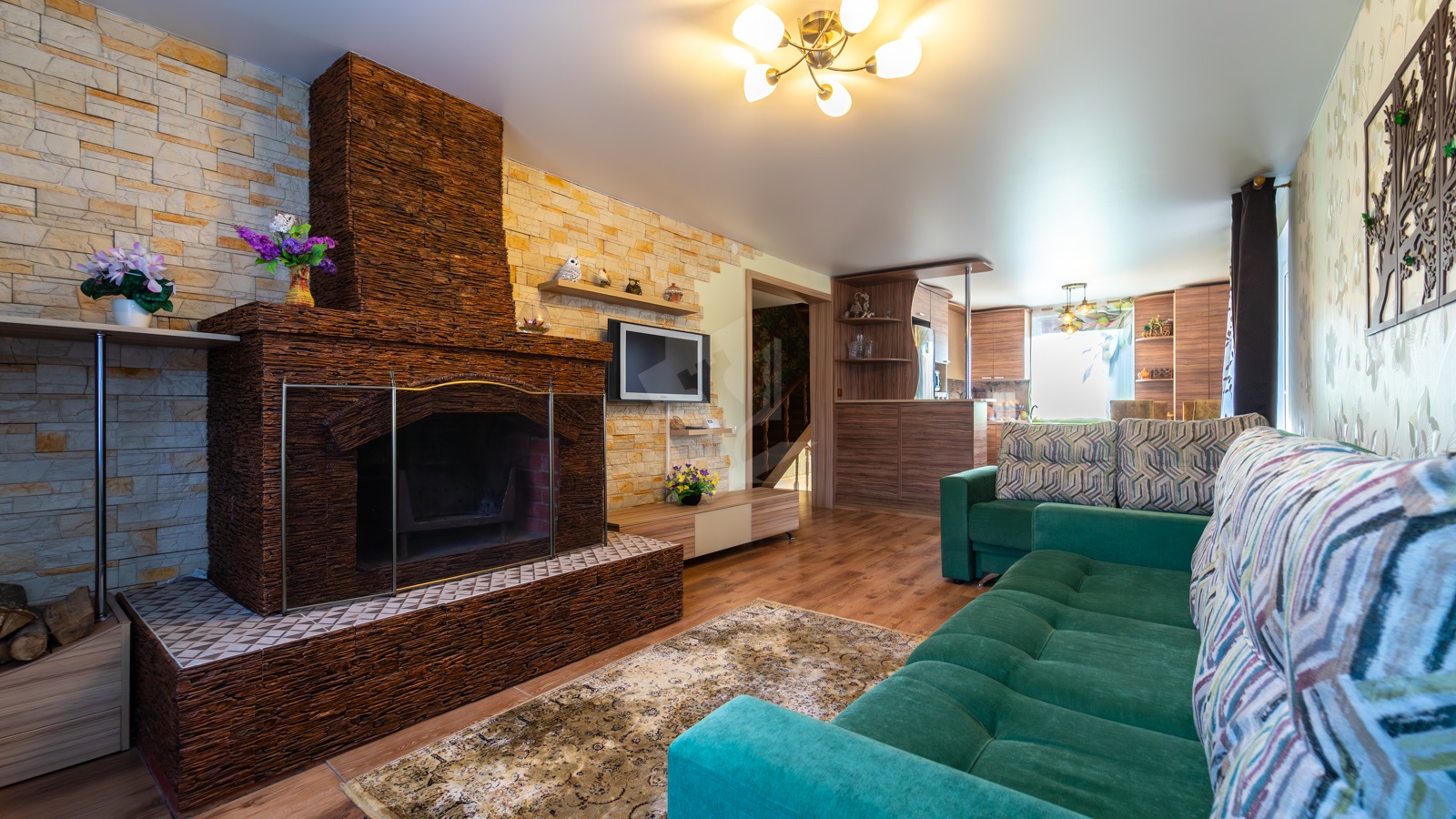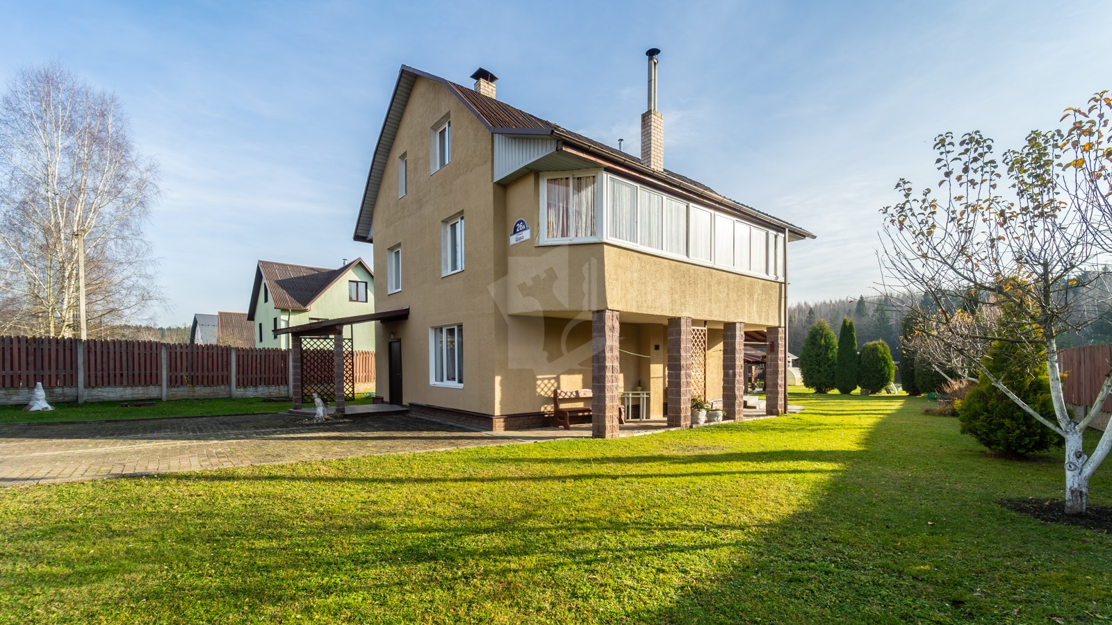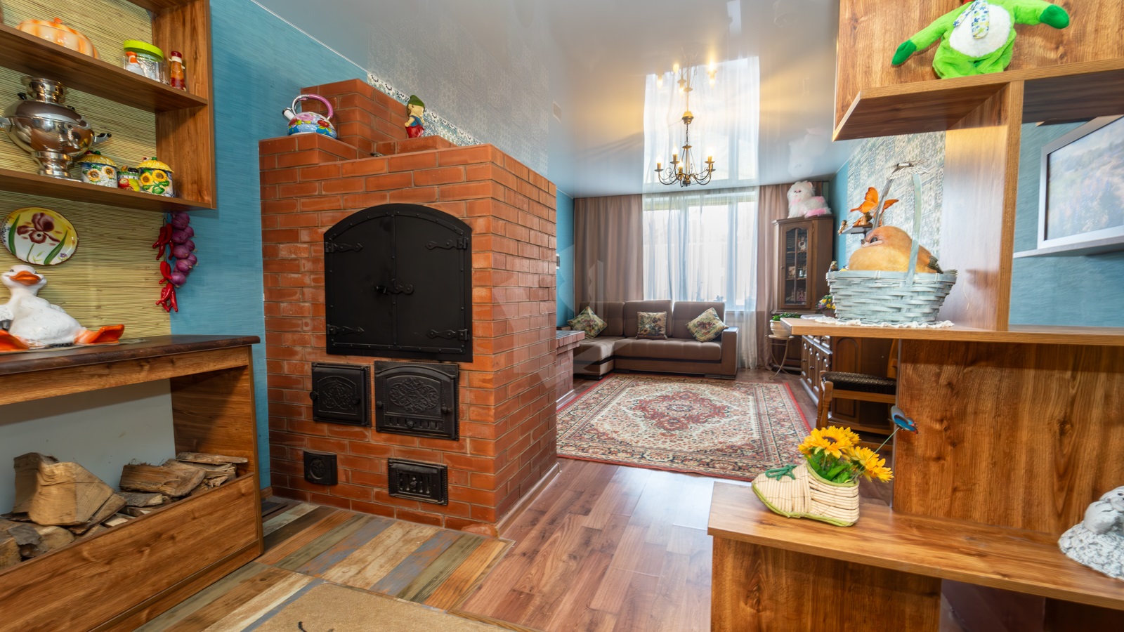- На участке расположен жилой дом, прочный и тёплый для постоянного проживания. В доме 5 жилых комнат, 2 санузла, просторная кухня-гостиная с классическим камином. Здесь же выход на большую благоустроенную лоджию. На первом этаже в просторной студии расположилась настоящая русская печь с лежанкой. Топится дровами, греет душу и тело, как в лучших славянских традициях. В доме остается мебель и бытовая техника.