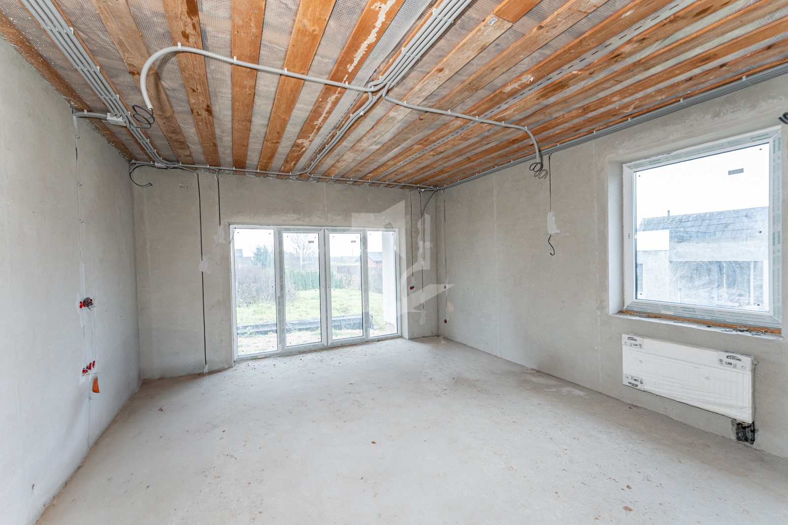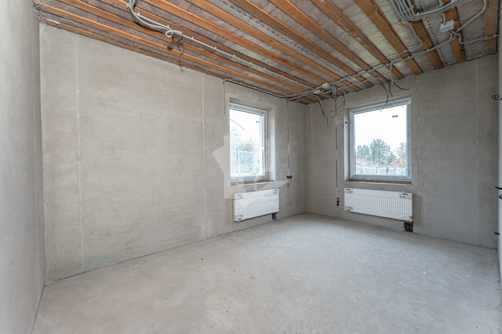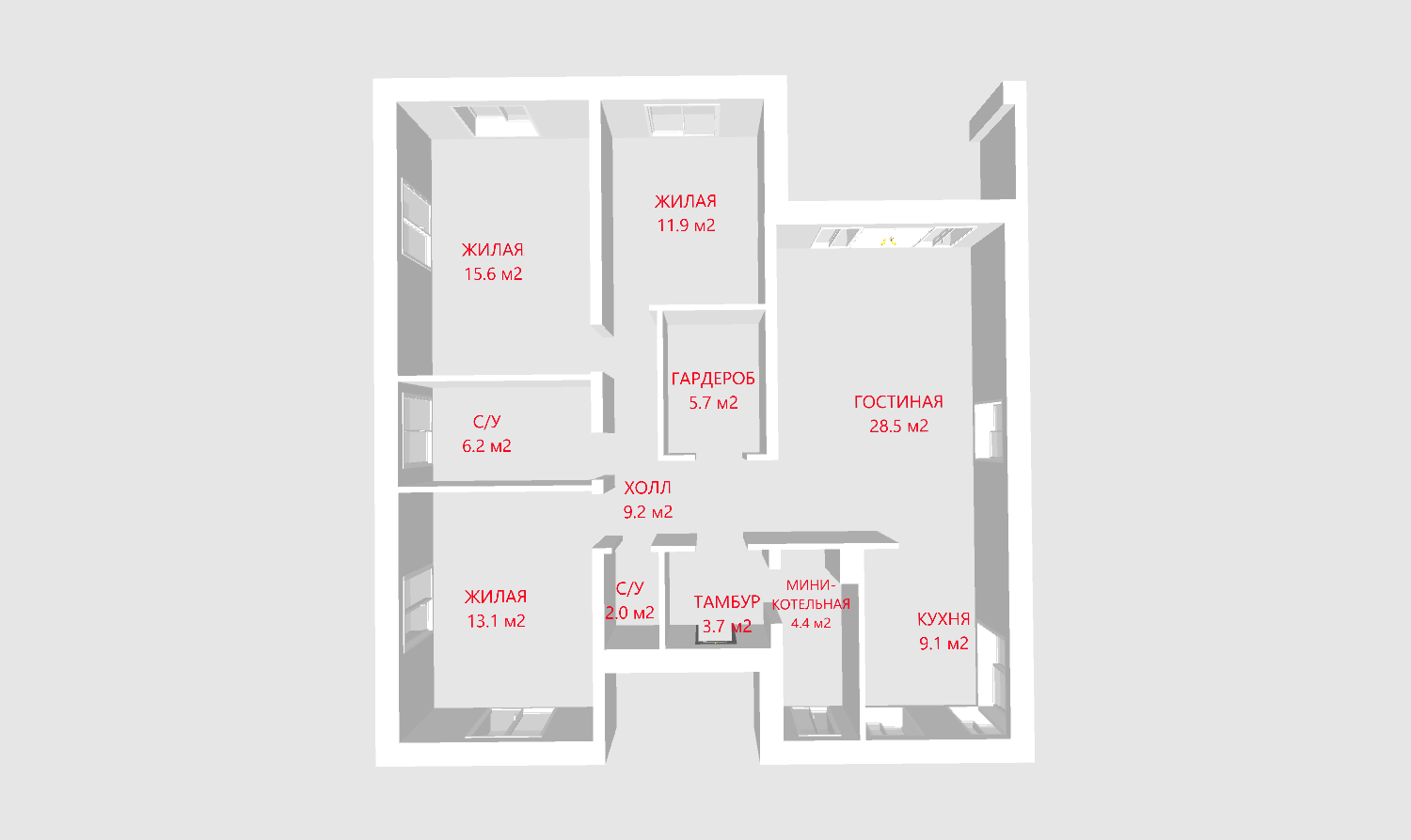 По планировке 4 изолированных комнаты, кухня совмещена с гостиной и выходом на террасу. В комнате много света за счет окон в пол.