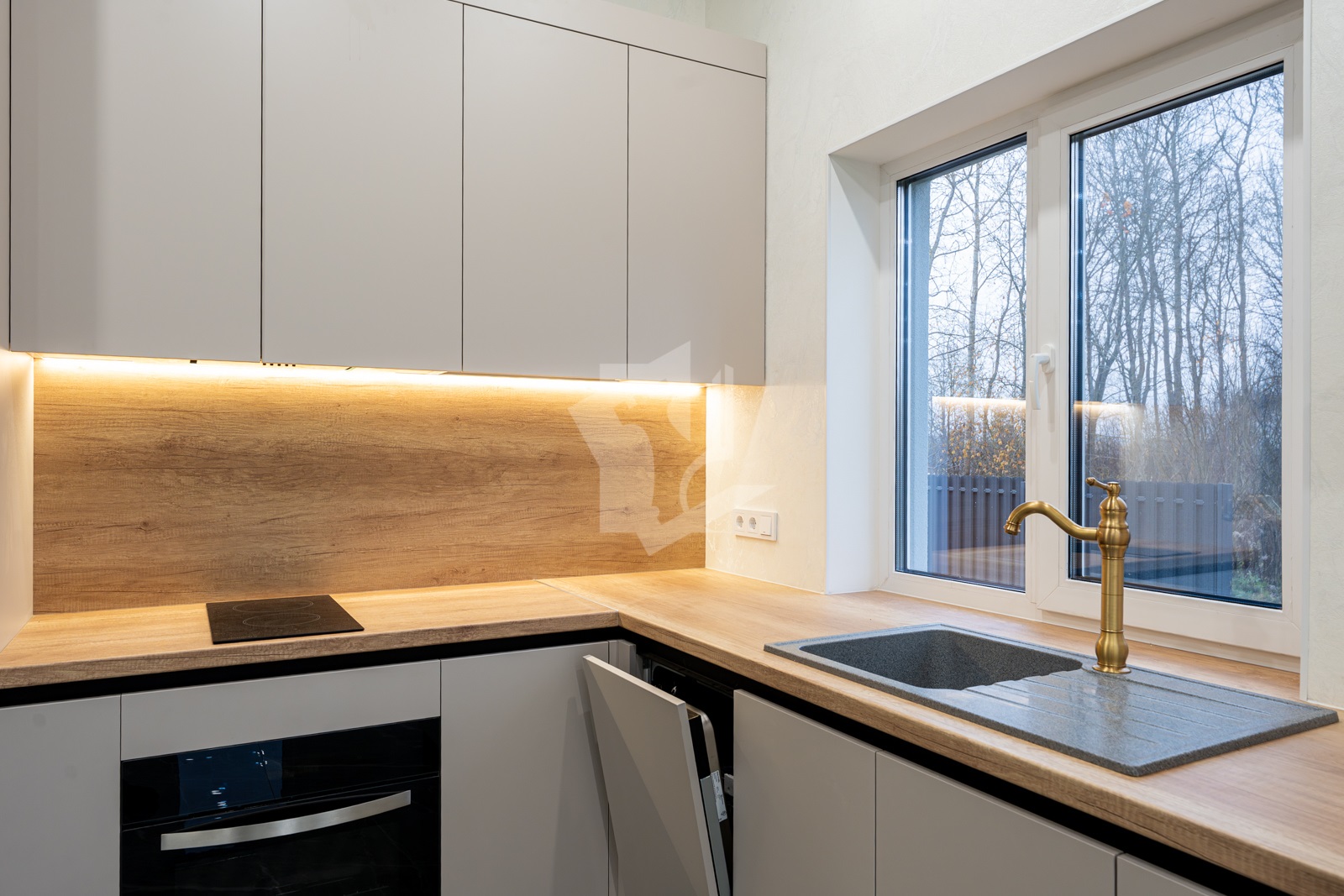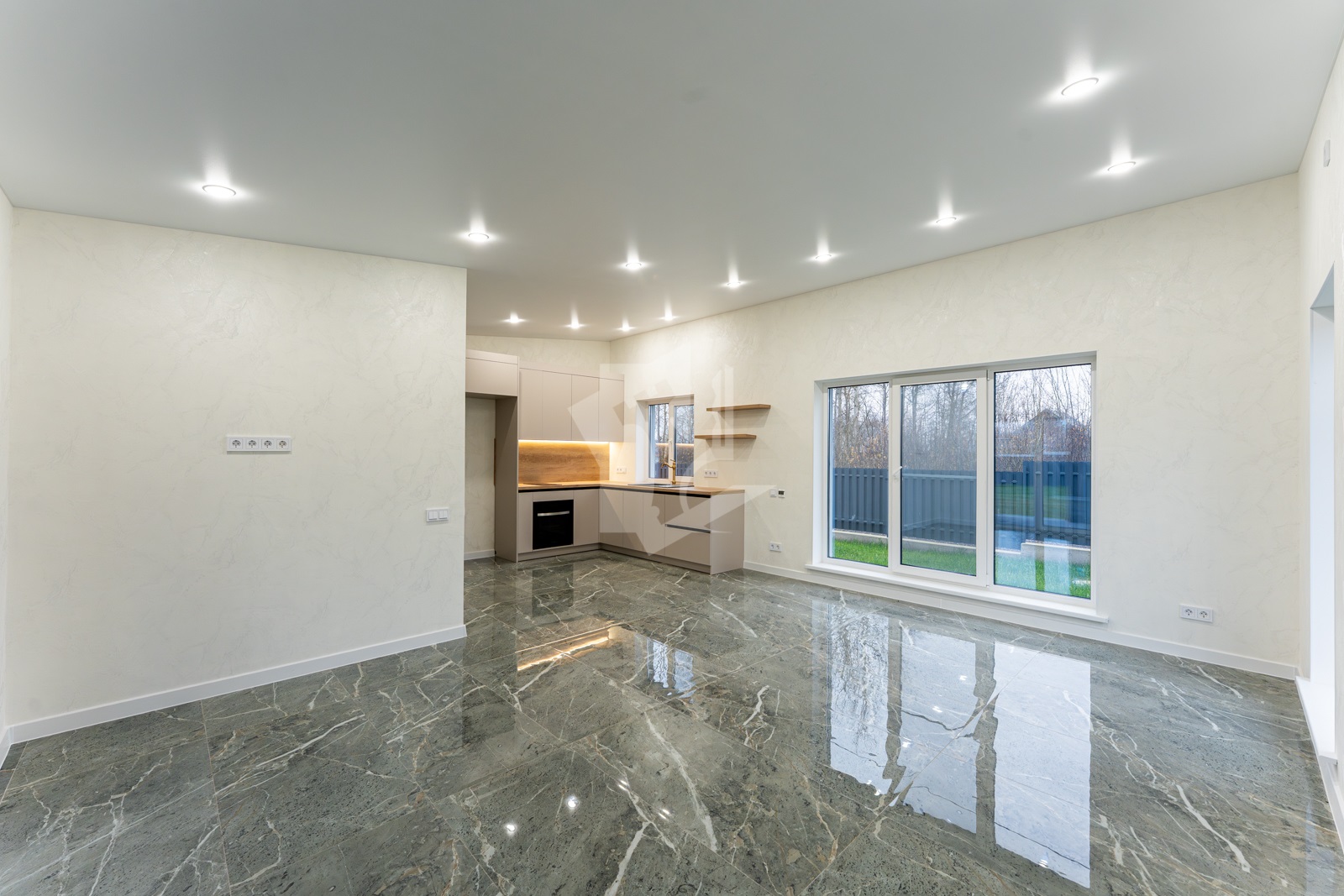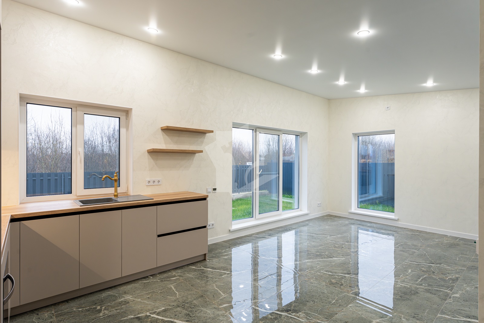 Сердце дома- просторная гостиная ,совмещённая с кухней, с выходом на террасу.